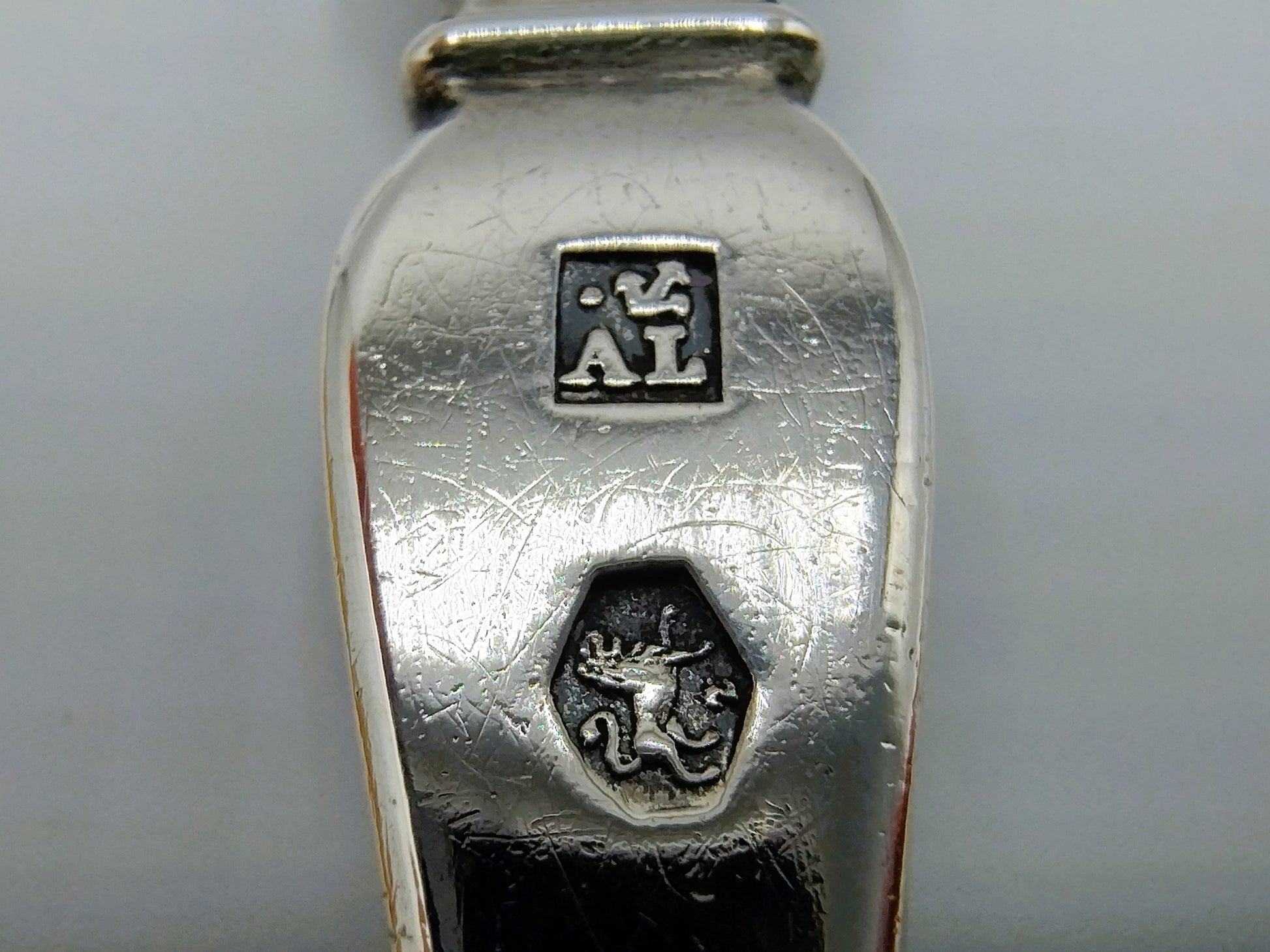 Gepunzt ist das Besteck mit der Punze 2. Güteklasse, Meisterzeichen Anker über AL, Jahresbuchstabe Q für 1850 und Minervakopf.