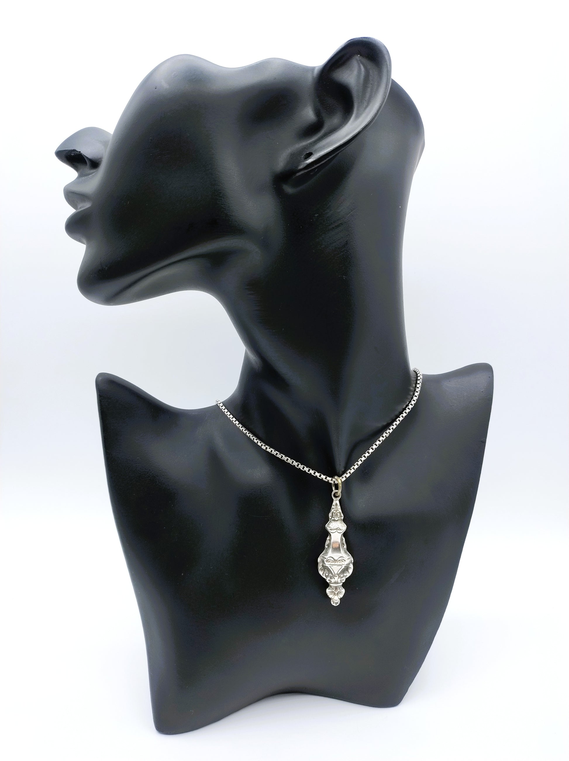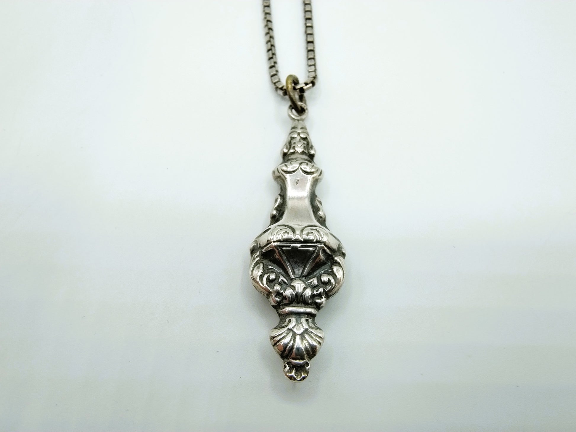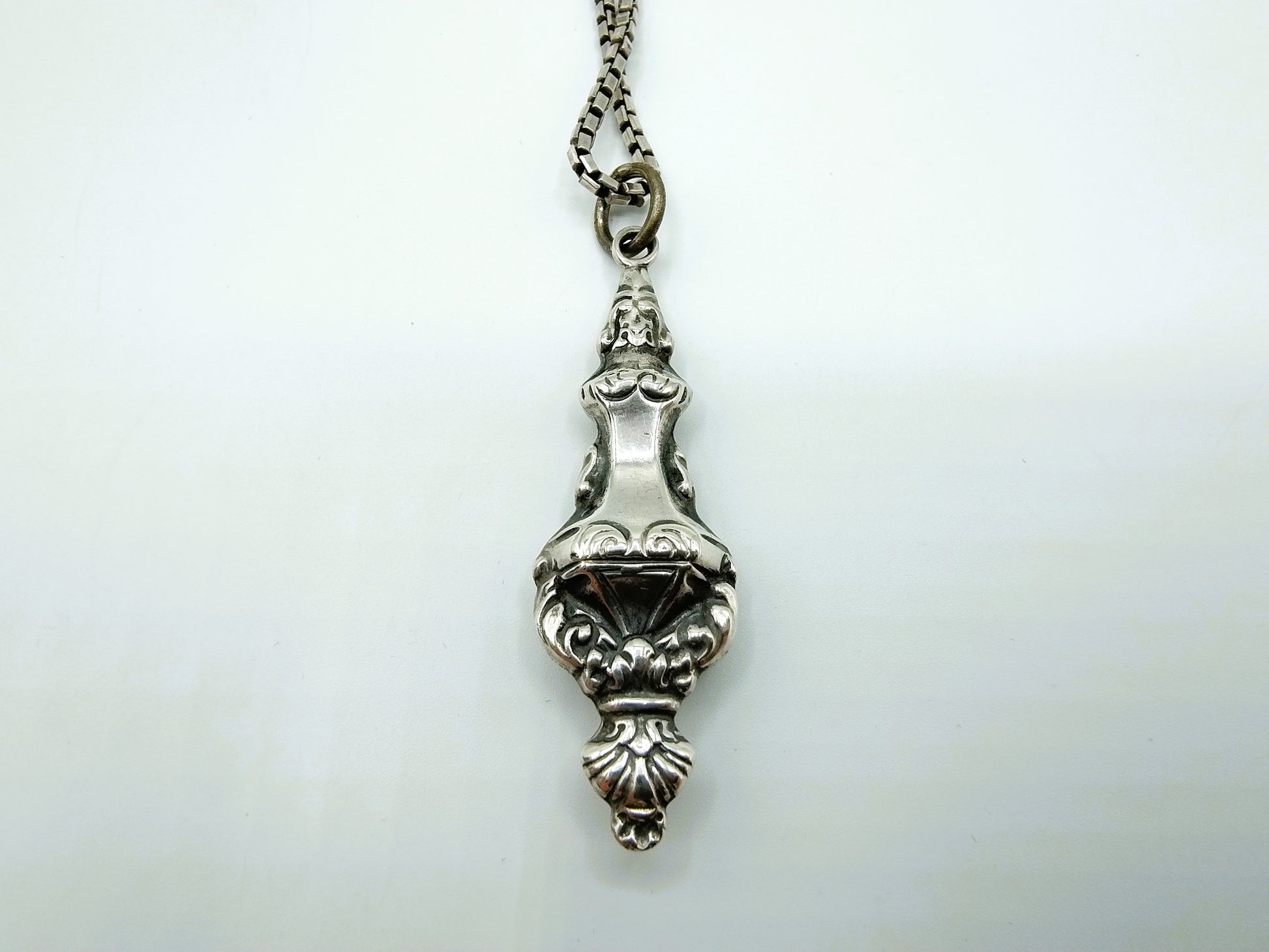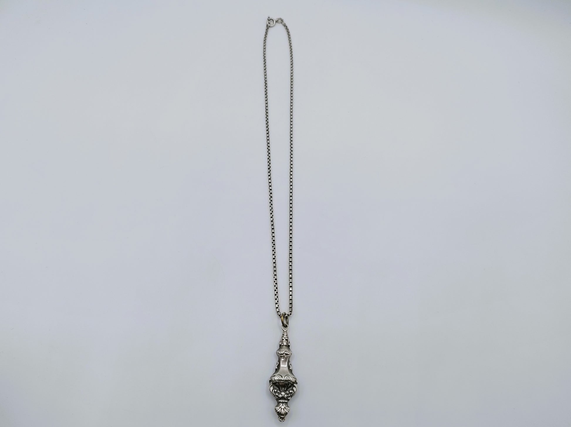 Silberne Gourmet-Halskette mit einer Länge von 47 cm mit einem antiken Silberanhänger. Vermutlich als Stricknadelhalter verwendet.