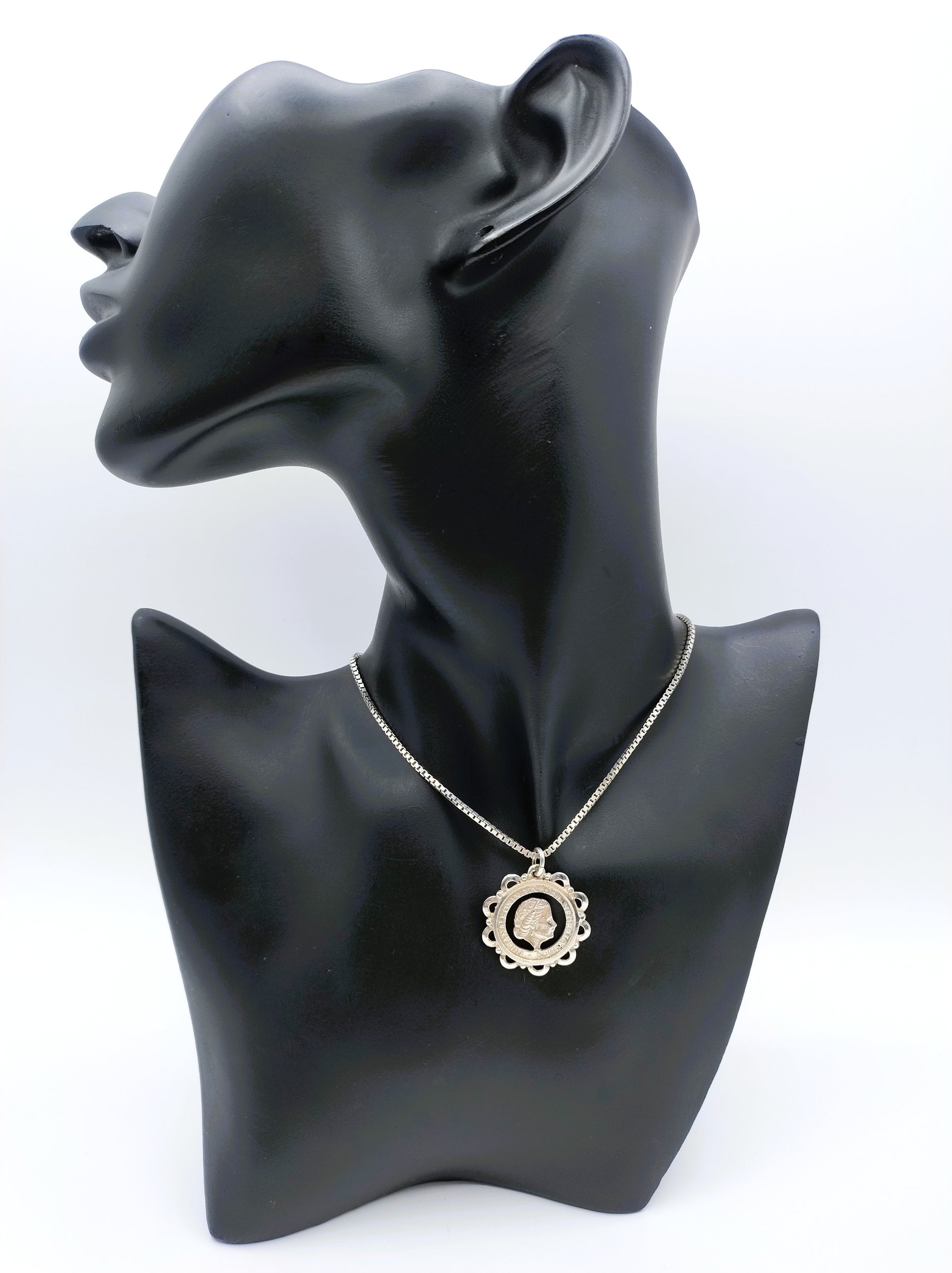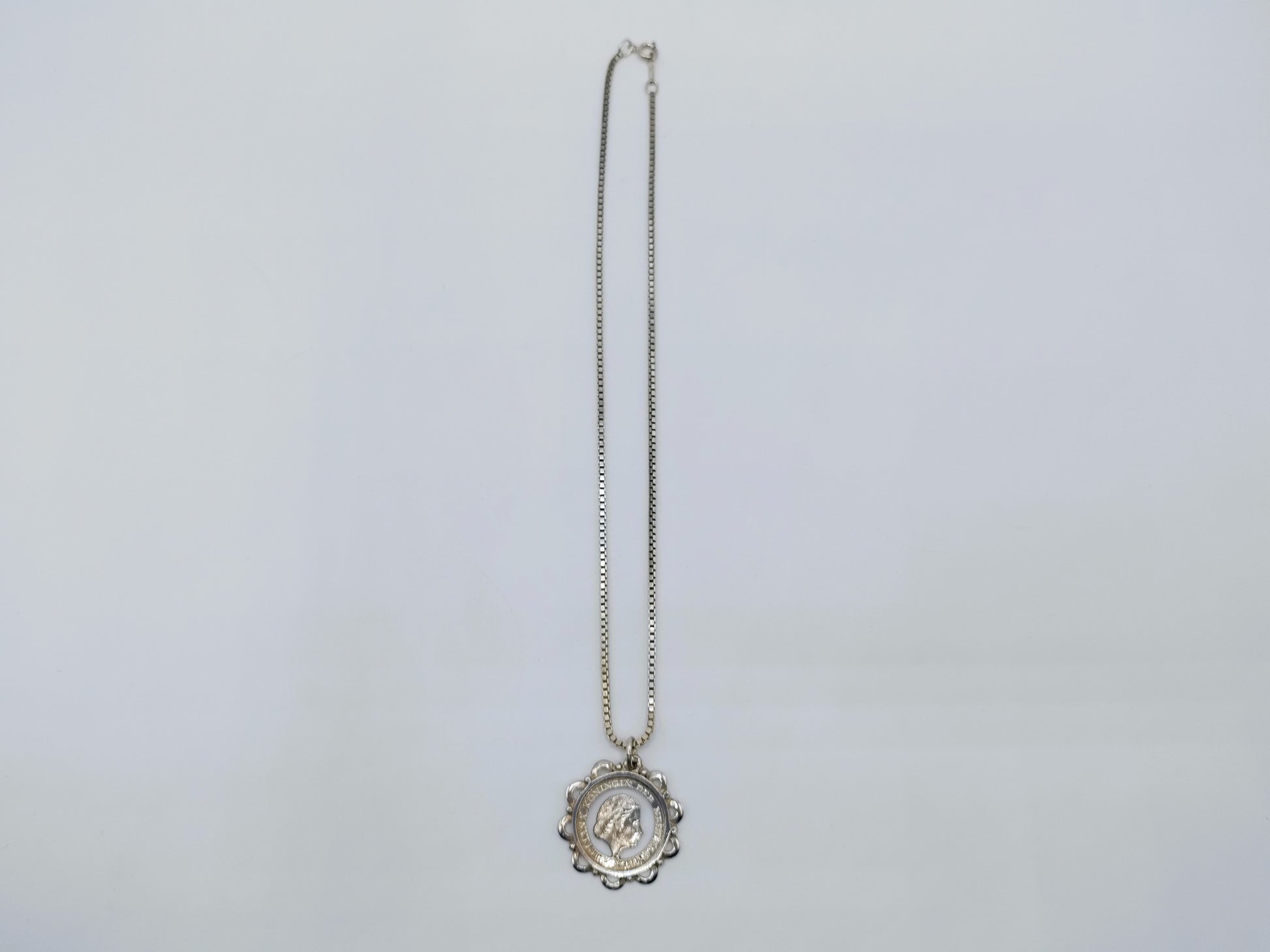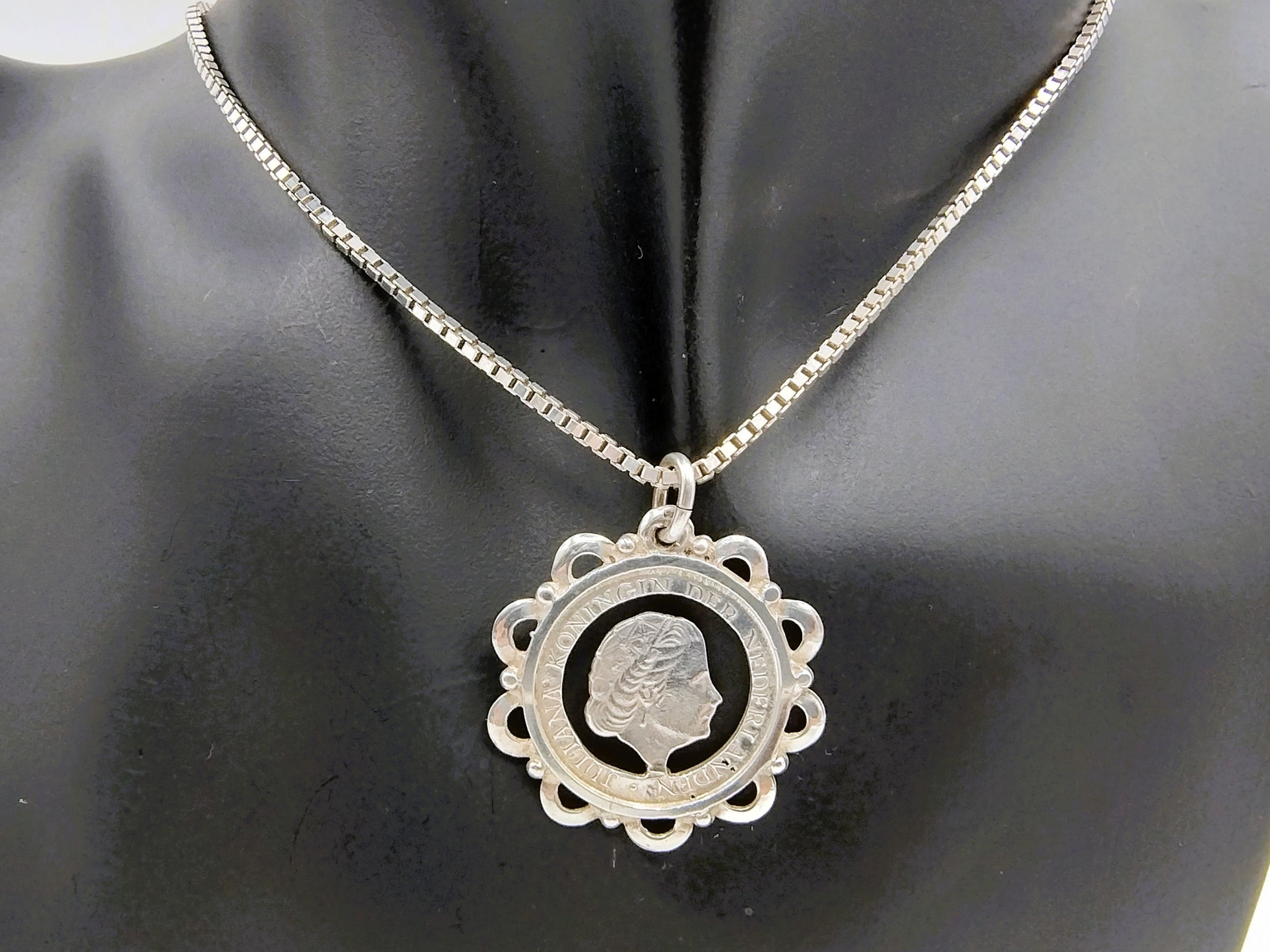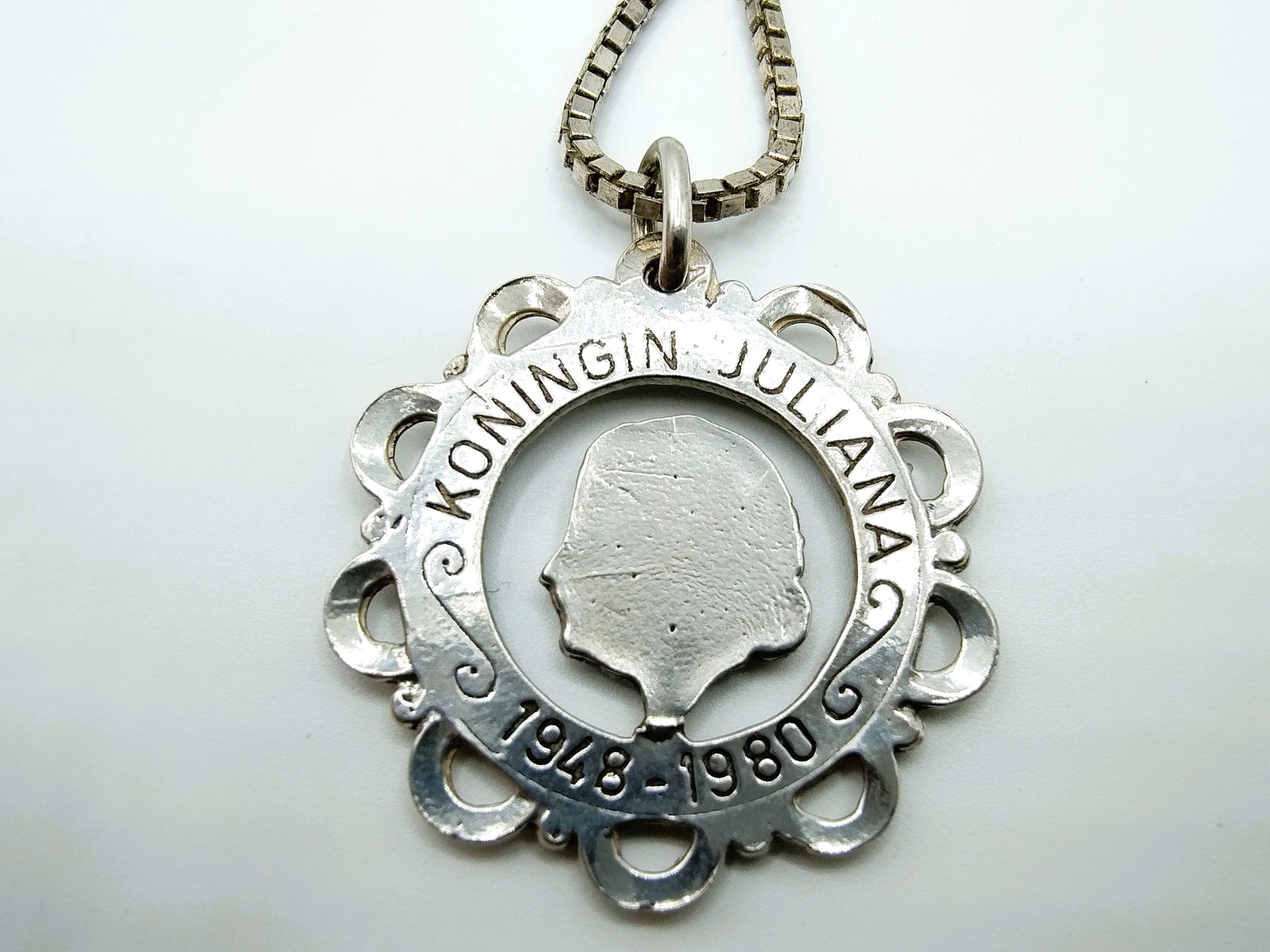 Silberne Gourmetkette mit einem Durchmesser von 1 mm mit einem ausgeschnittenen Münzanhänger von Juliana 1948 -1980.