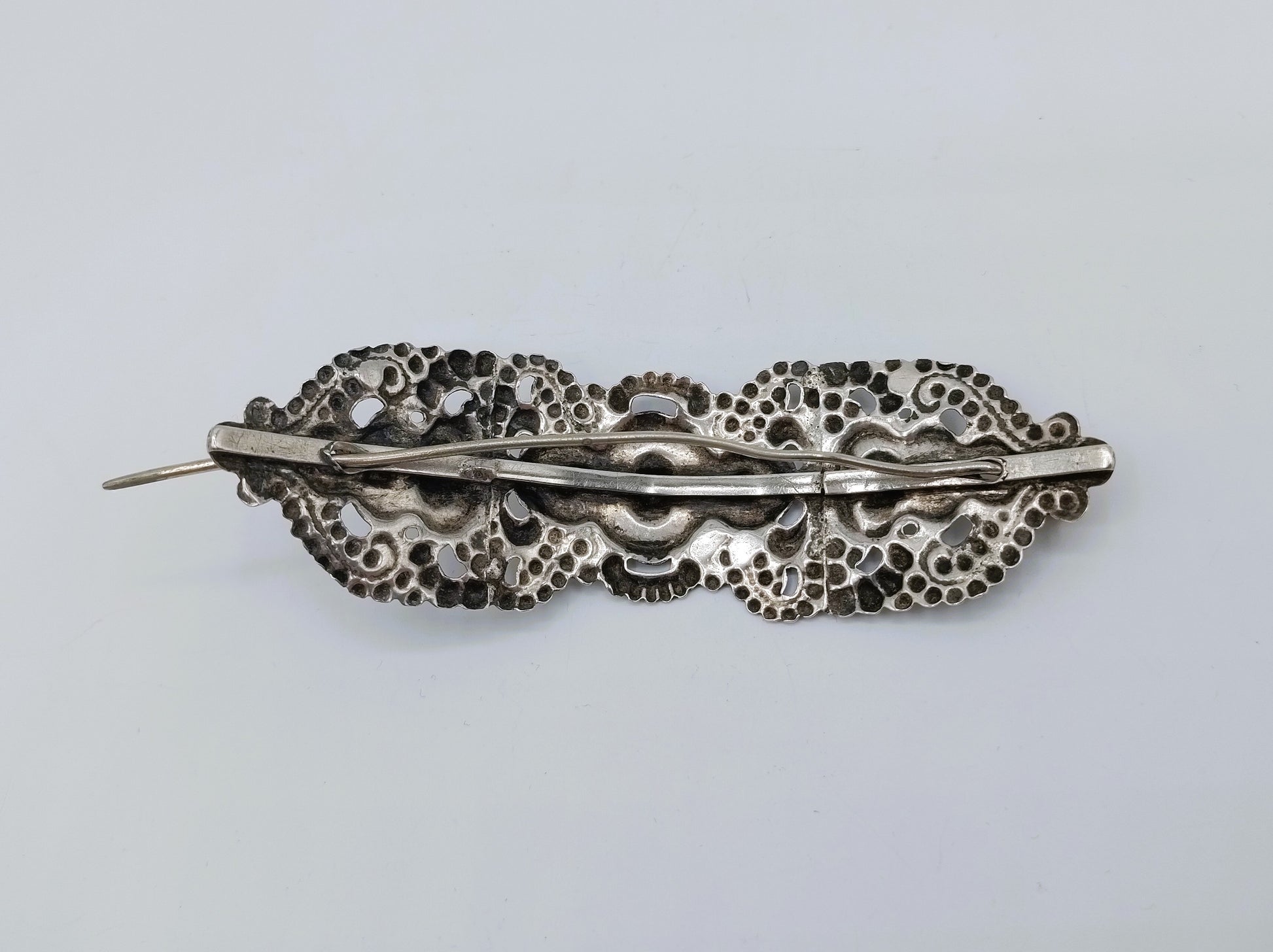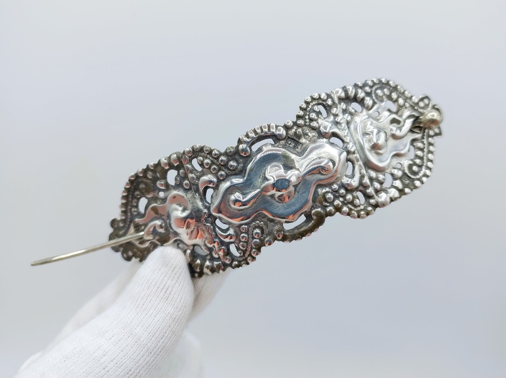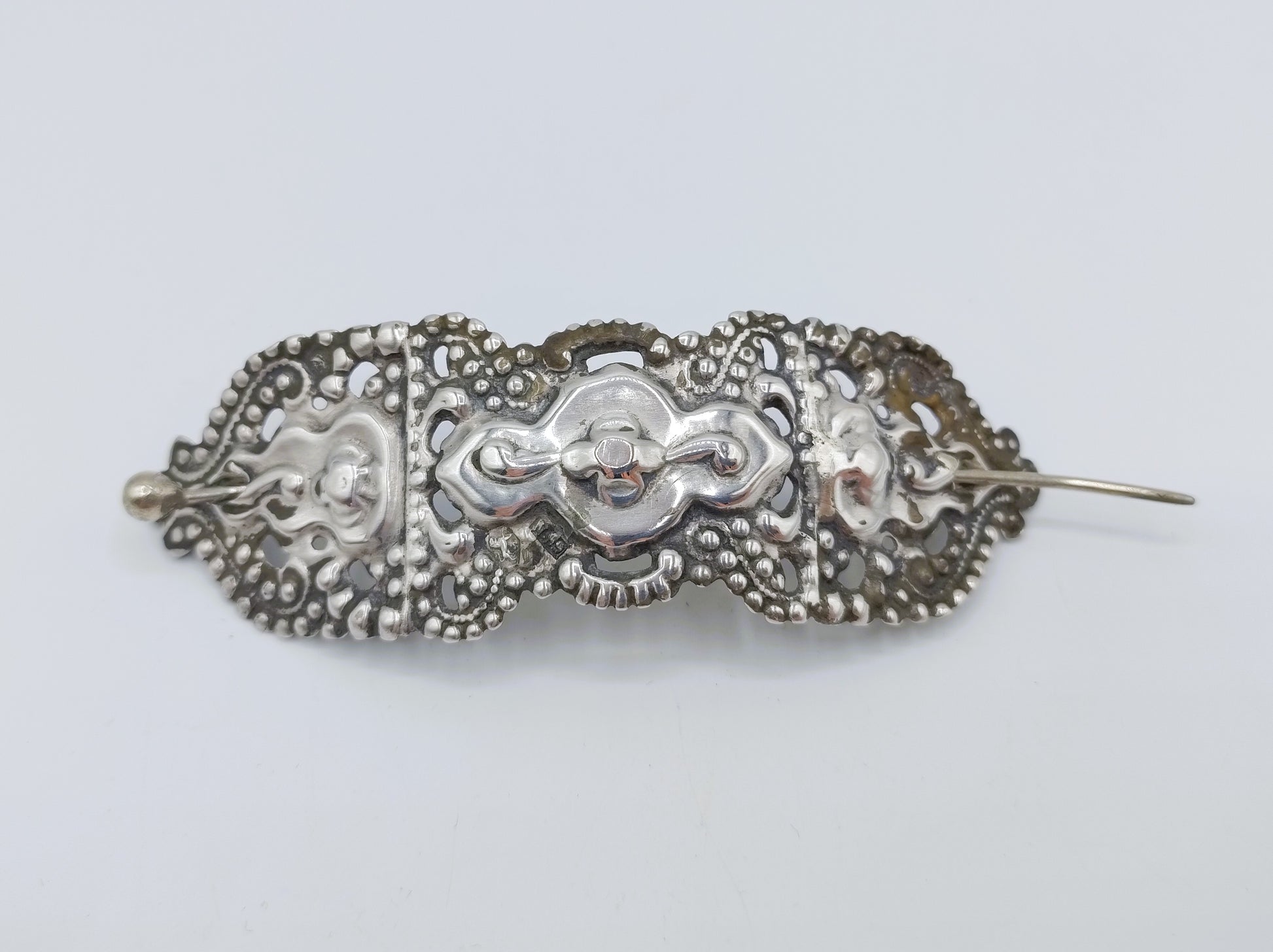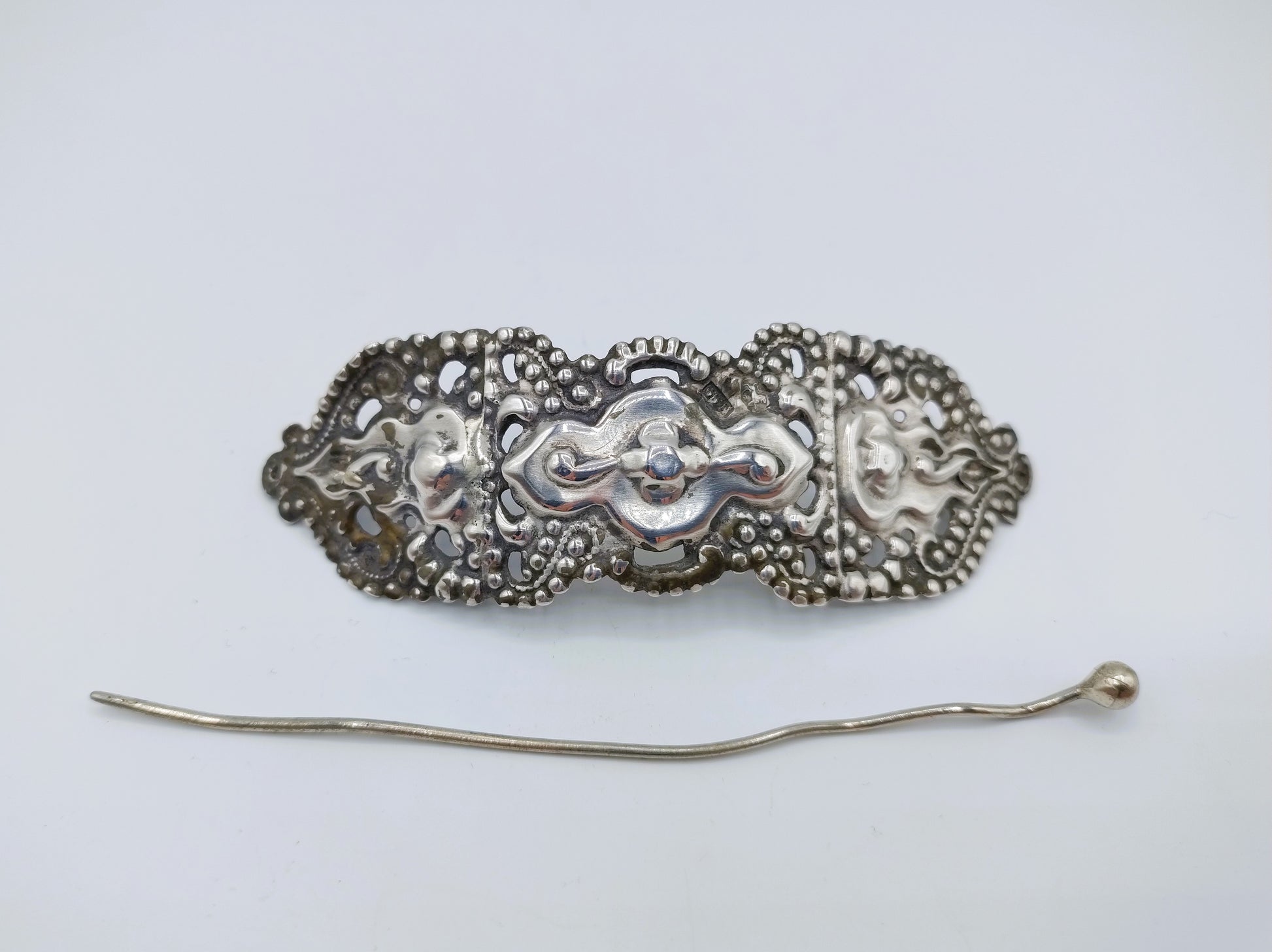 Wunderschön getriebene silberne Haarnadel, verschlossen mit einer silbernen Nadel des Silberschmieds AJ Nobel aus Schoonhoven. Er verwendete dieses Siegel von 1872 bis 1892.