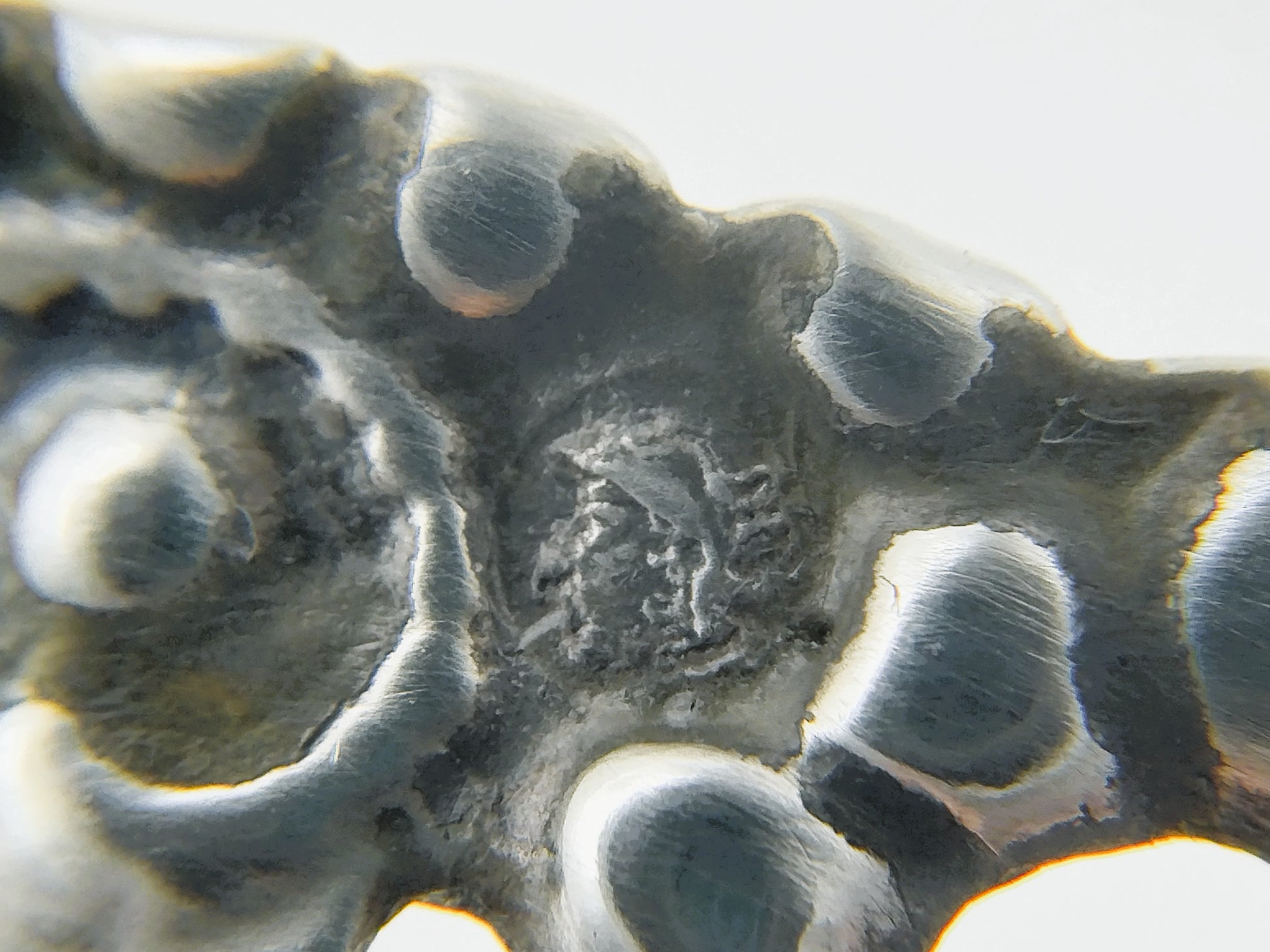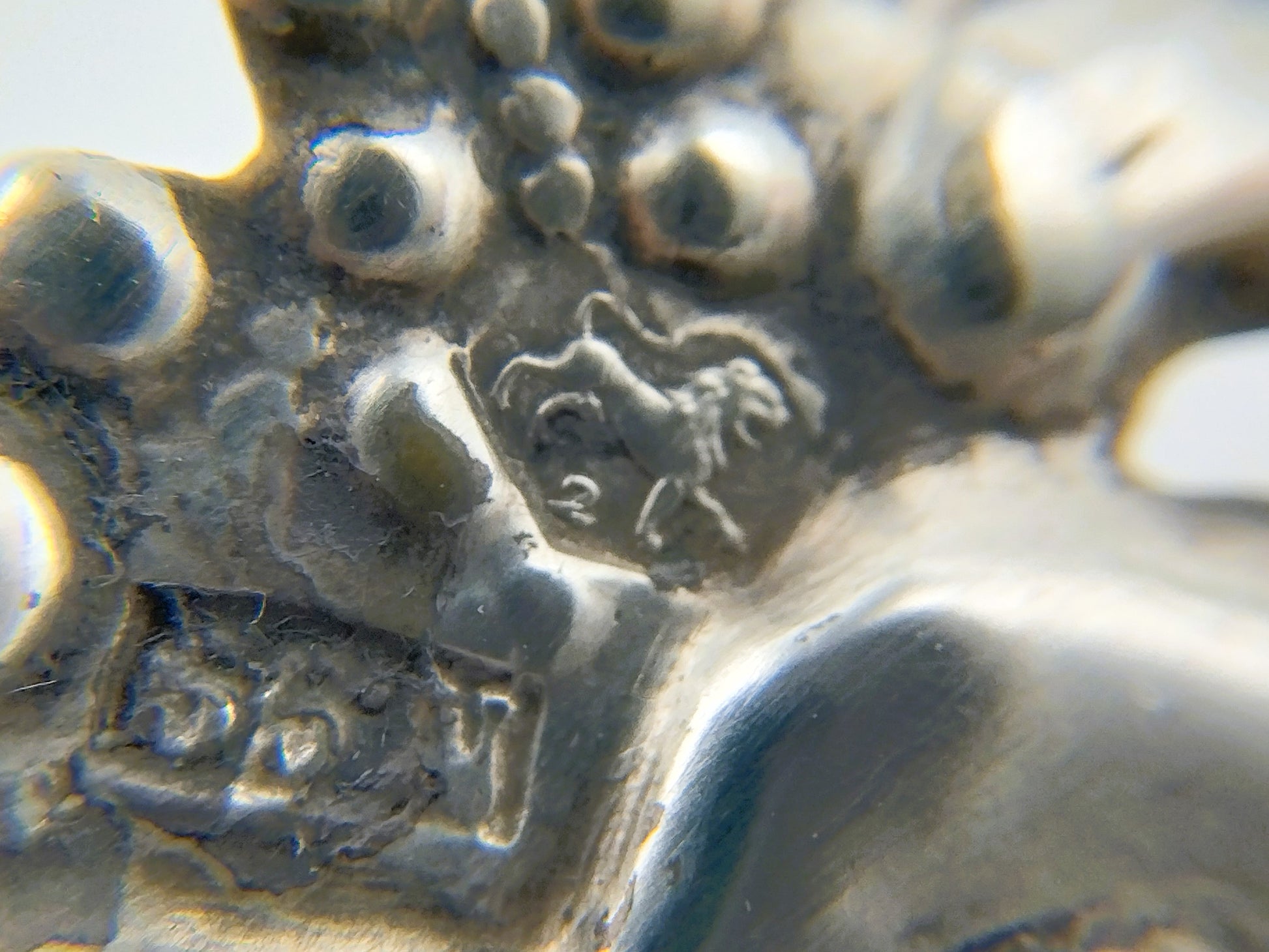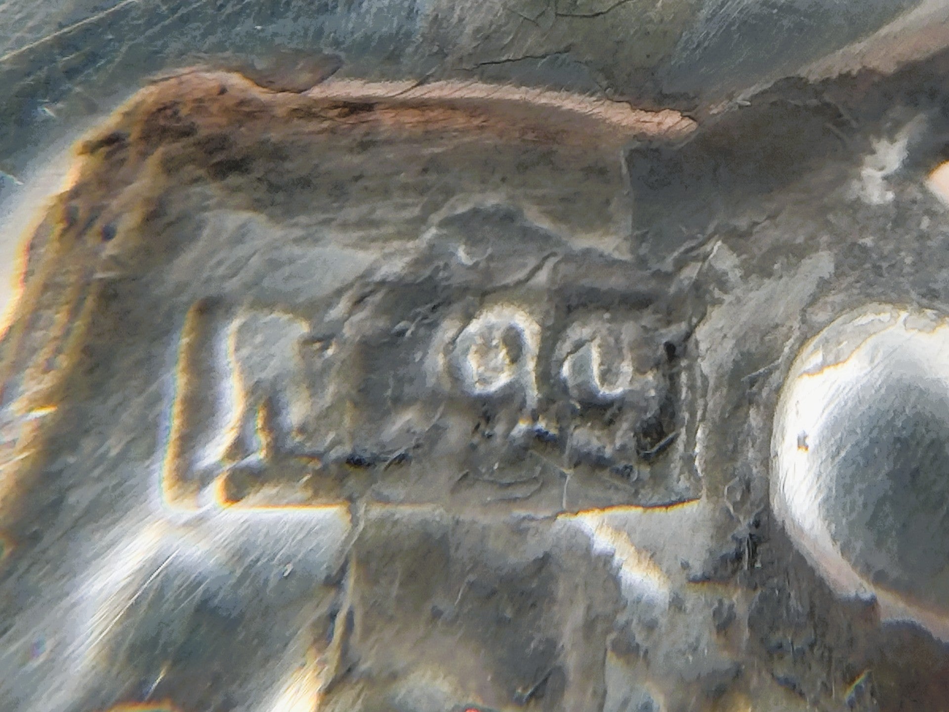 Die Haarnadel ist mit der Meistermarke N99, der zweiten Feingehaltsmarke, dem Minerva-Kopf und dem Jahresbuchstaben z für 1884 gekennzeichnet.