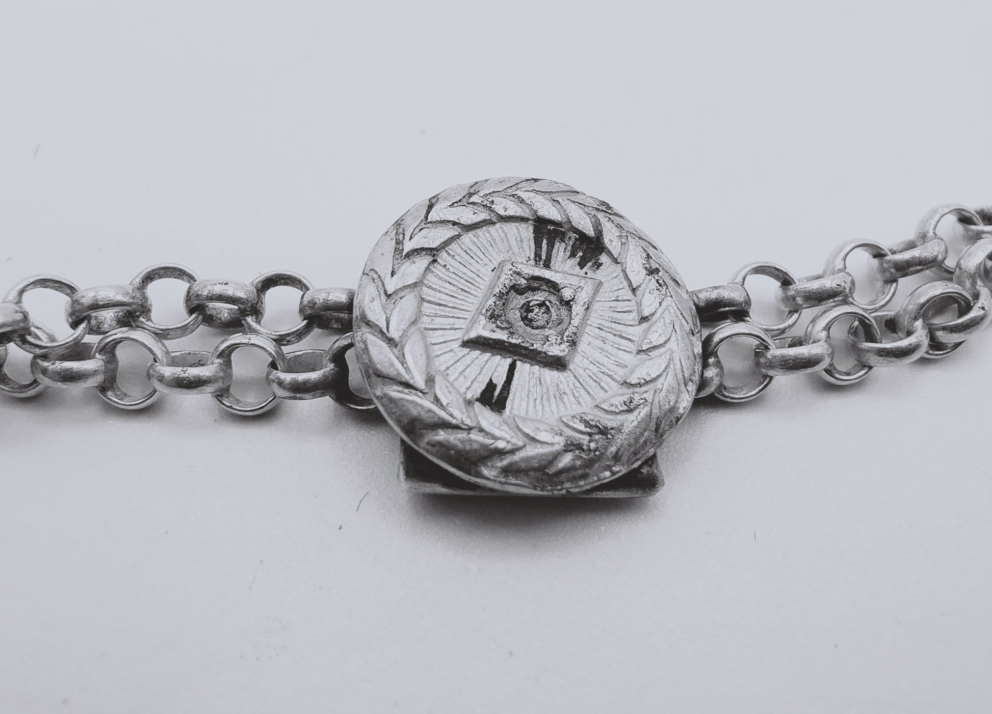 Silberne Uhrenkette mit feinem Glied. Ausgestattet mit einem Knopf mit Motiv in der Mitte.