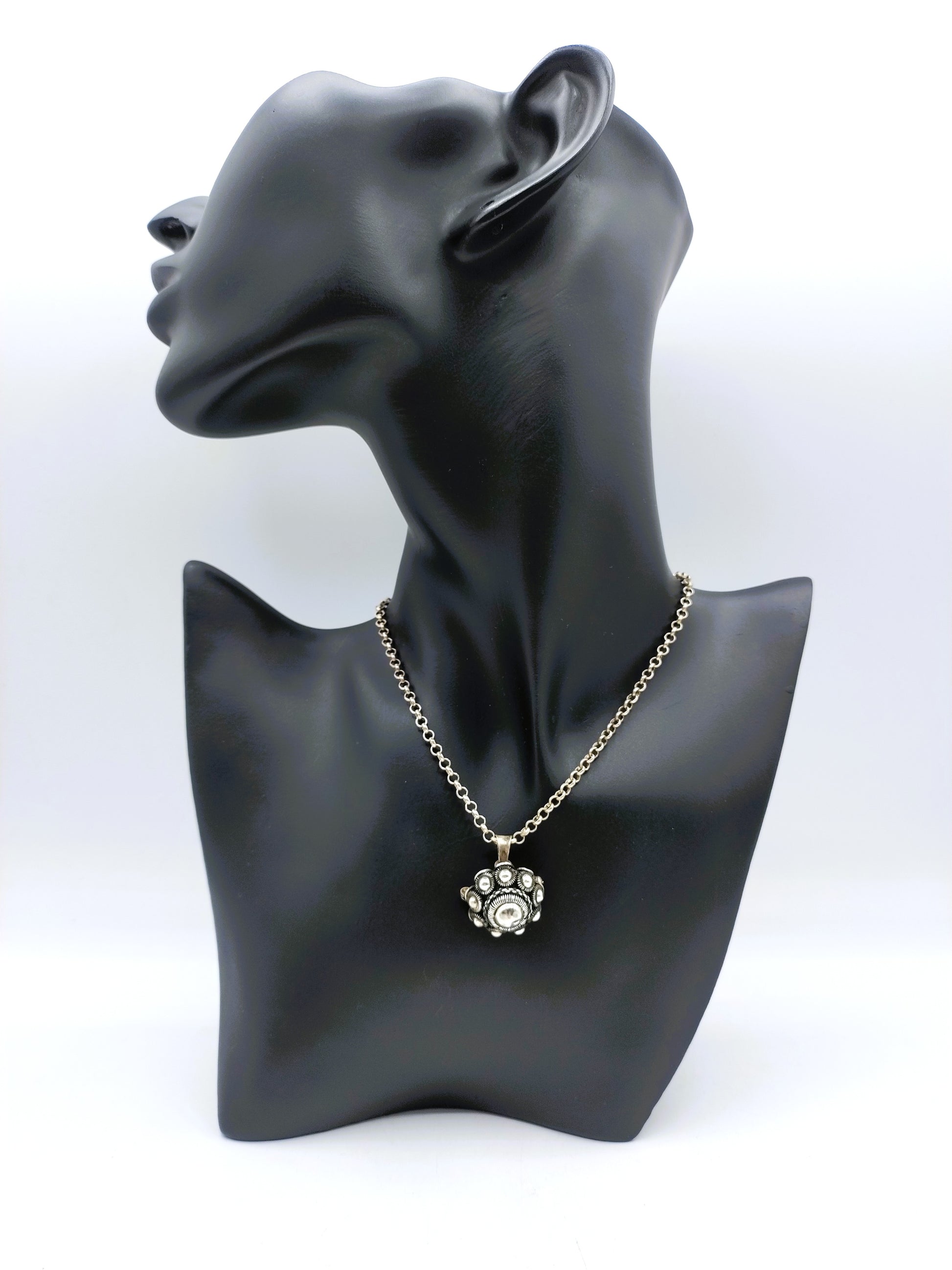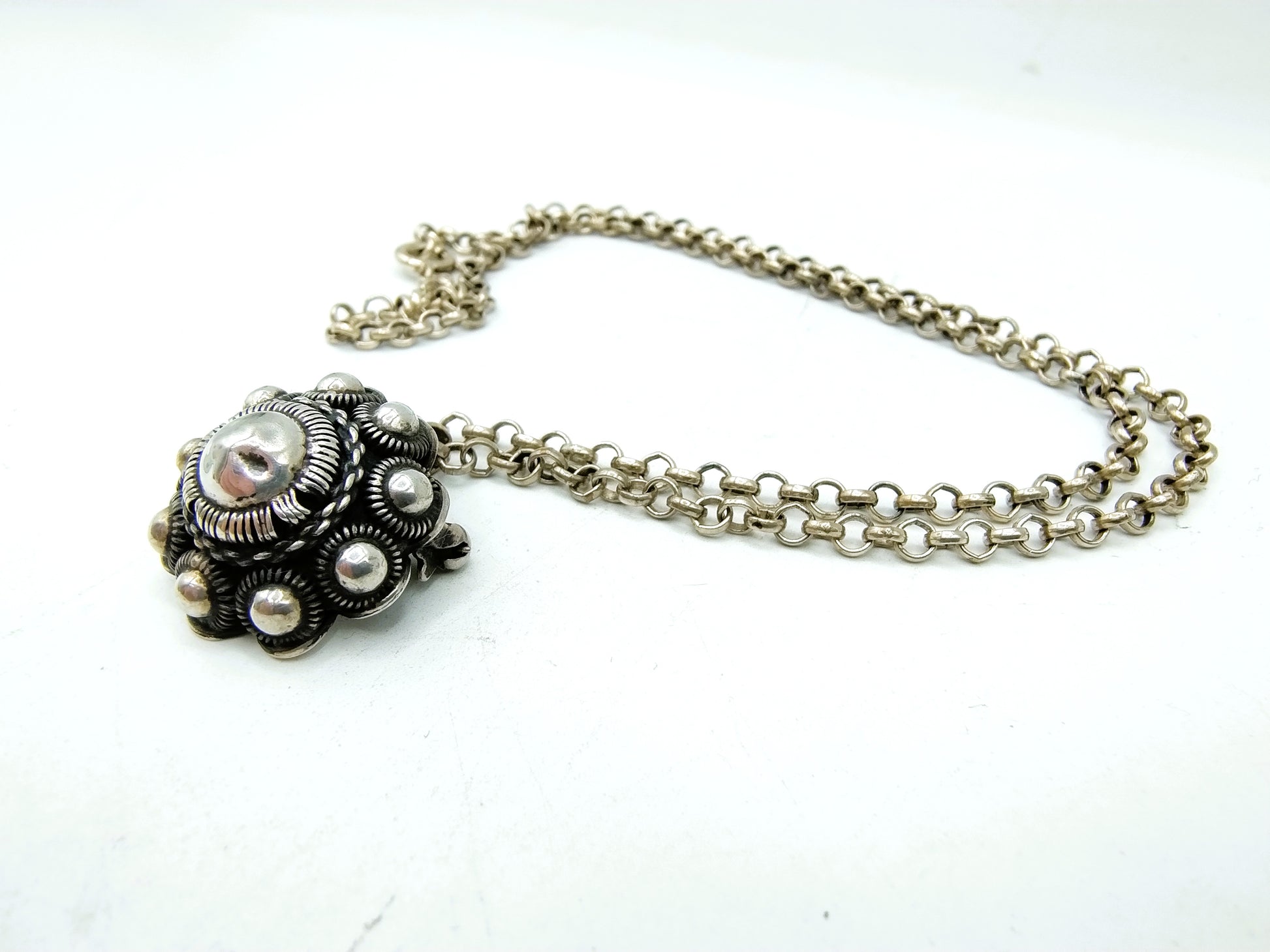Silberne Jasseron-Halskette (Durchmesser 3 mm) mit einer Länge von: 44 cm mit einem Zeeland-Knopfanhänger, der auch als Brosche verwendet werden kann.