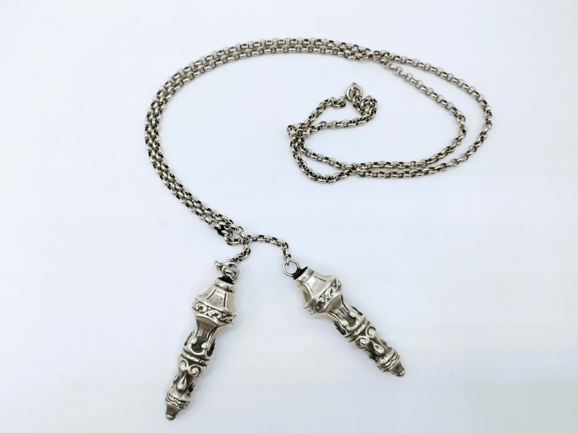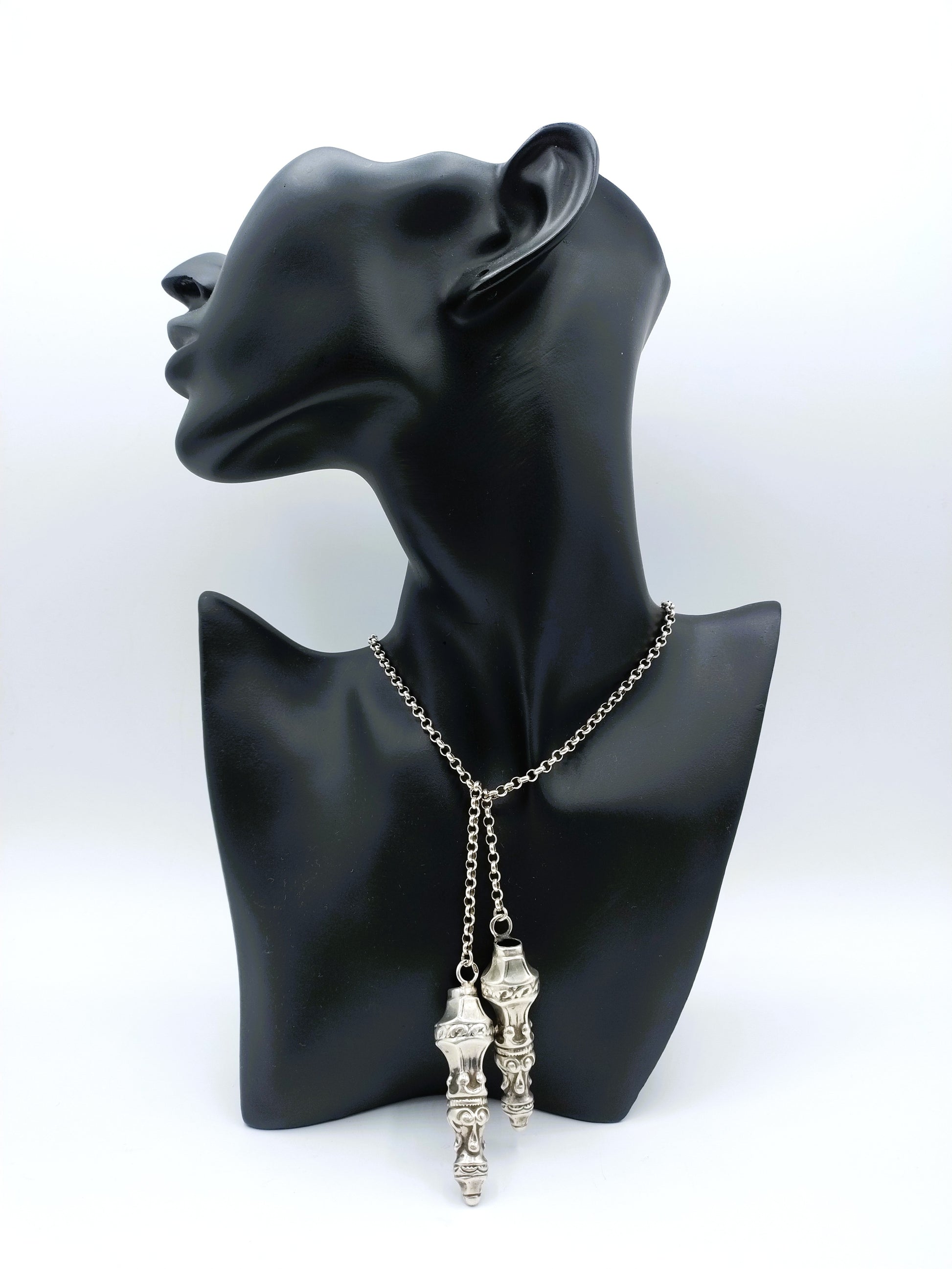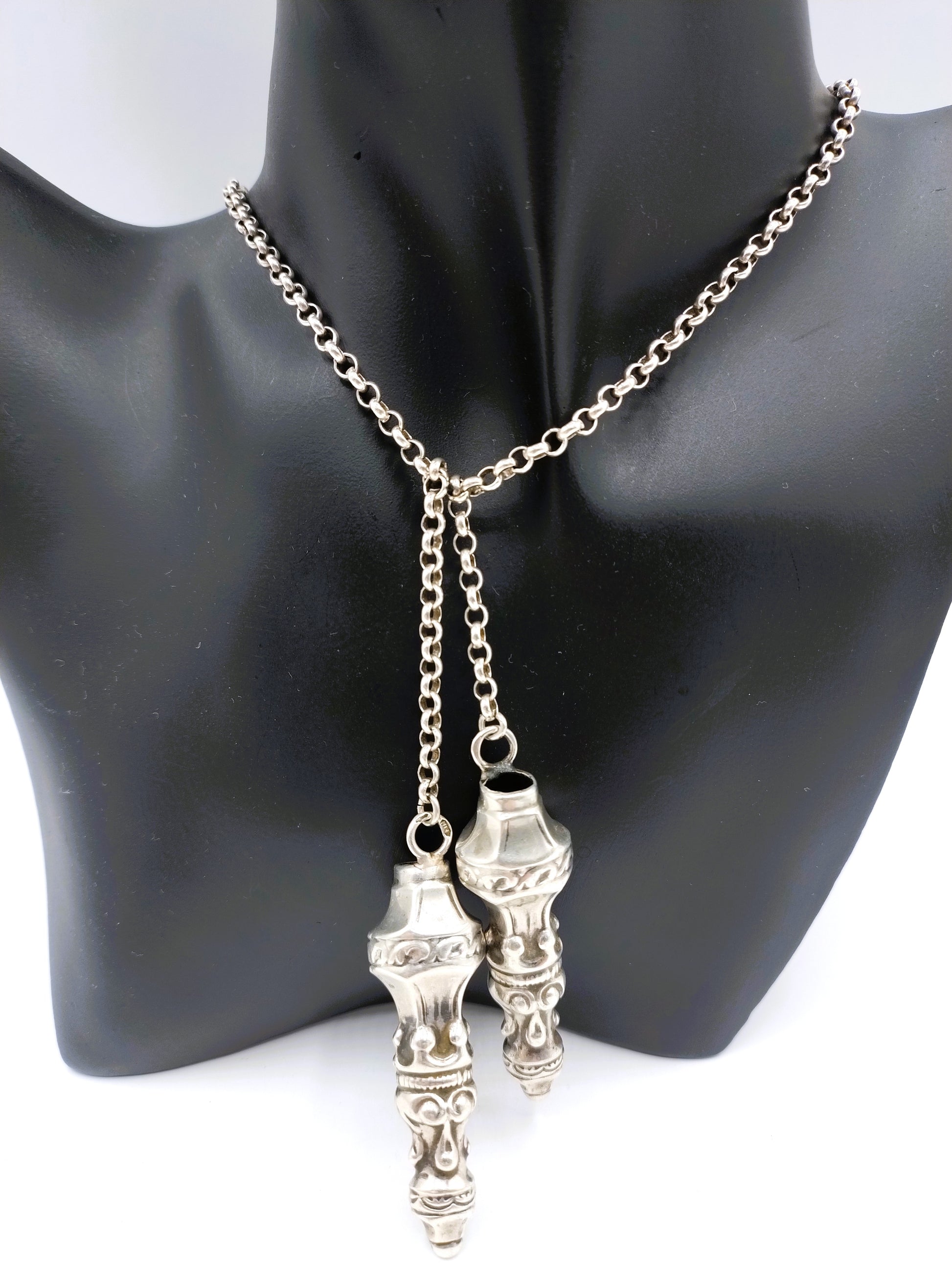 Silberne Jasseronkette mit robusten Stricknadelkappen mit einer Länge von 6 cm.