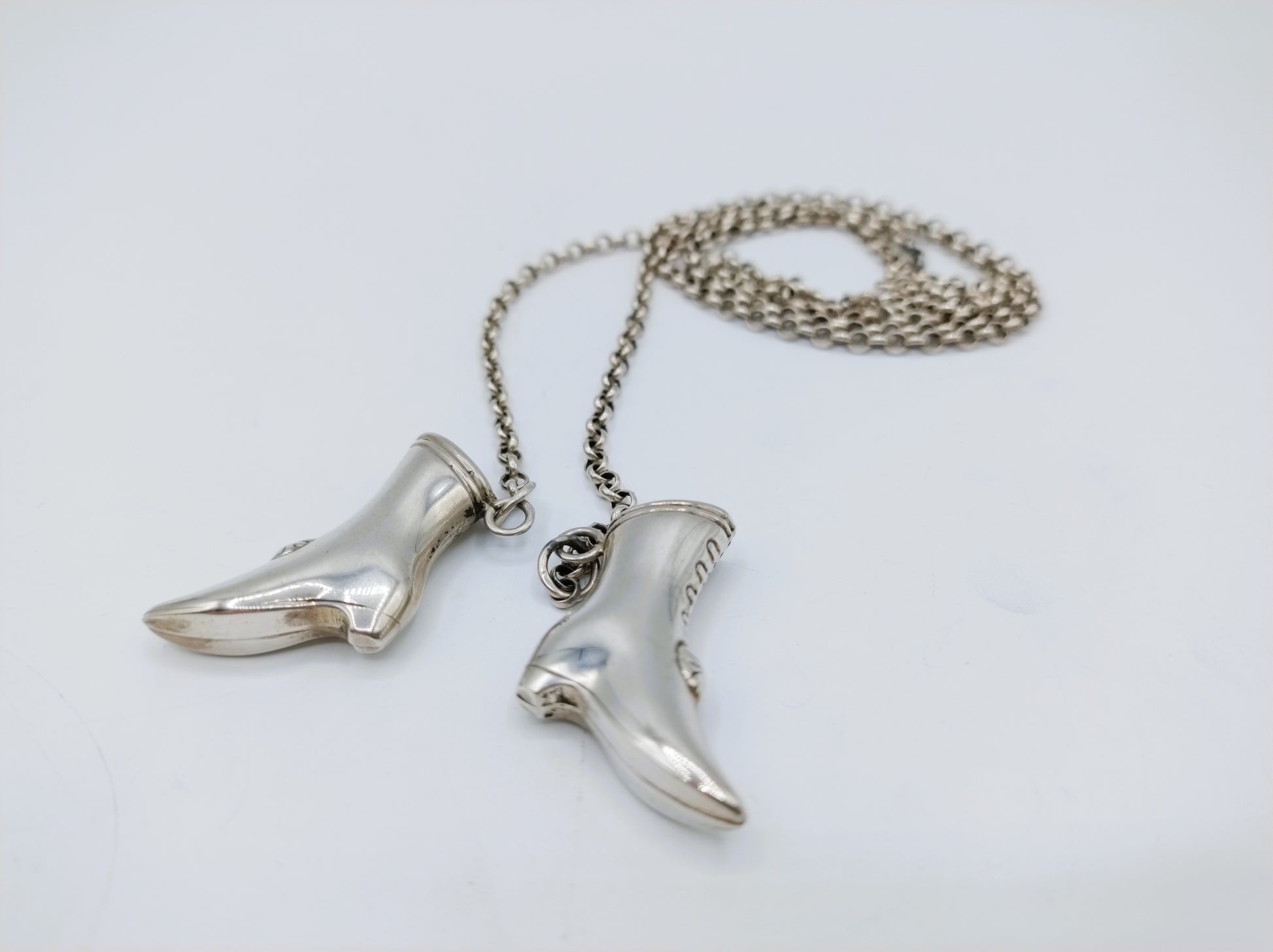 Silberne Strickmützen in Form von Stiefeln an einer silbernen Kette.