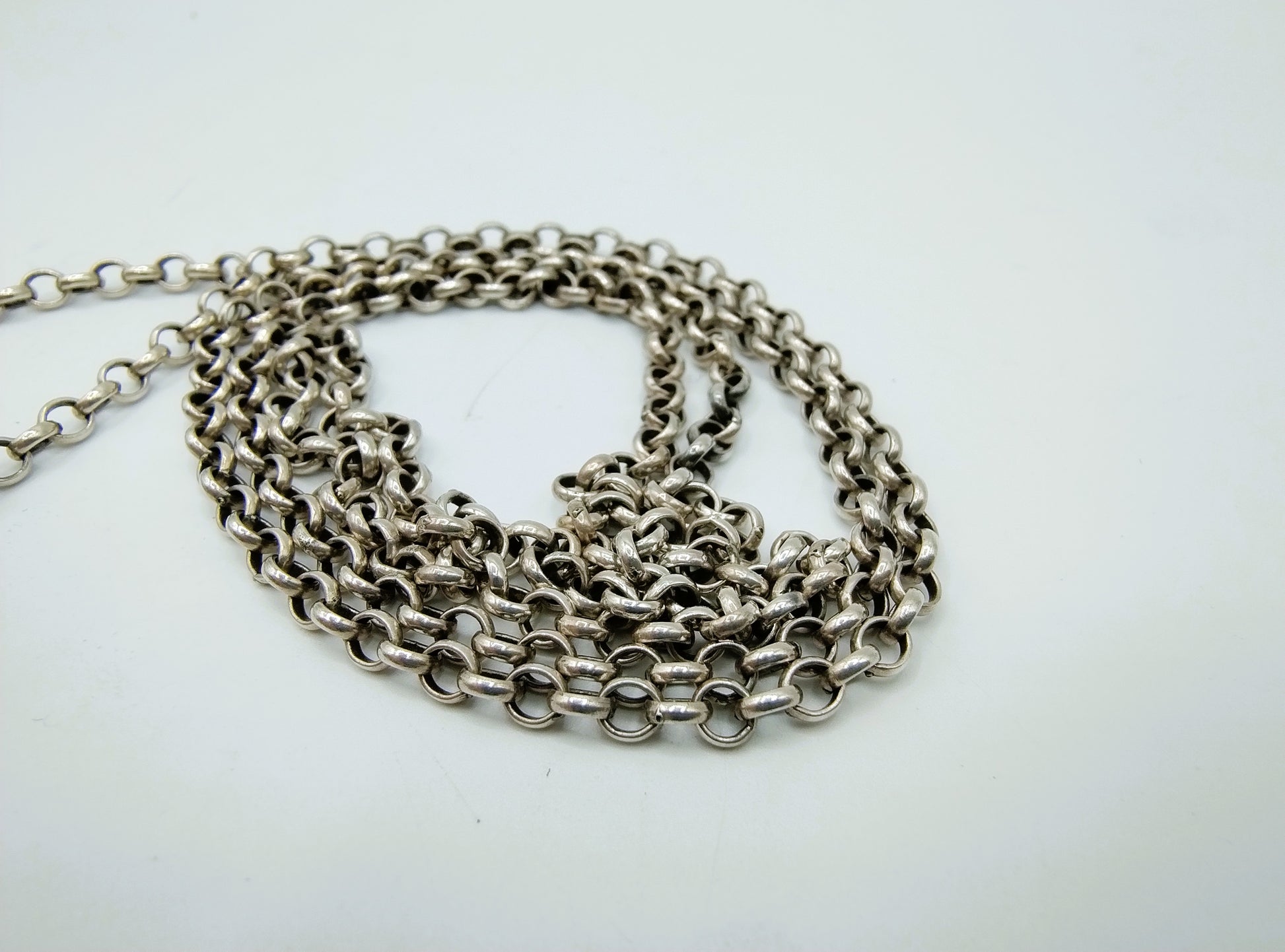 Silberne Jasseronkette mit Stricknadelkappen (Stiefel), 79 cm.