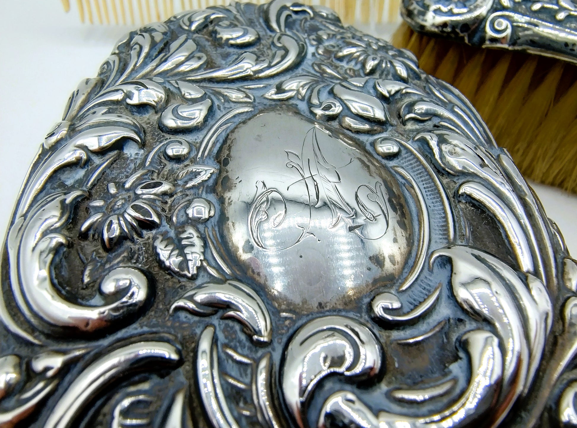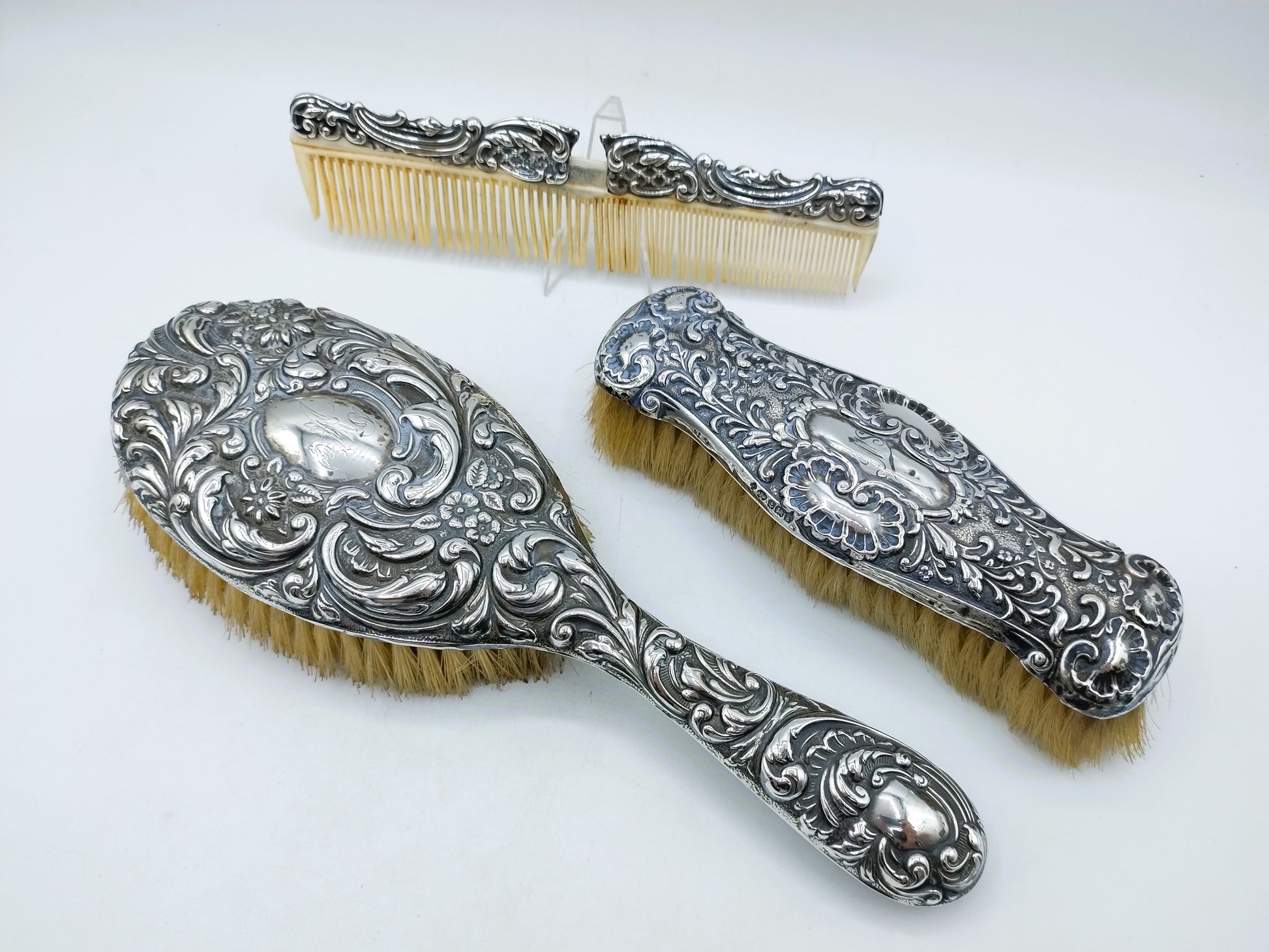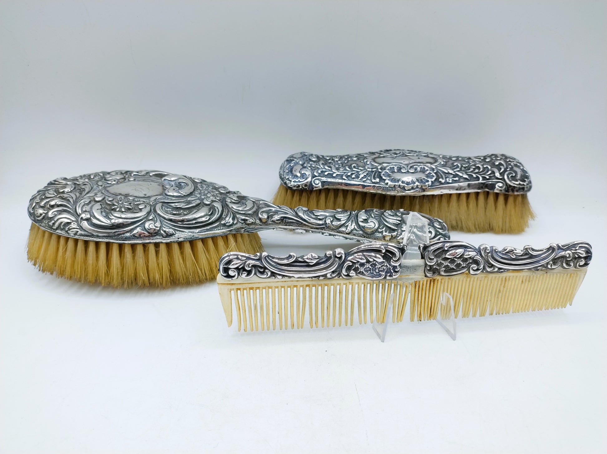Silbernes Friseurset bestehend aus 2 Bürsten und einem Kamm mit wunderschönen Lockenmotiven, die in das Silber eingeprägt sind.