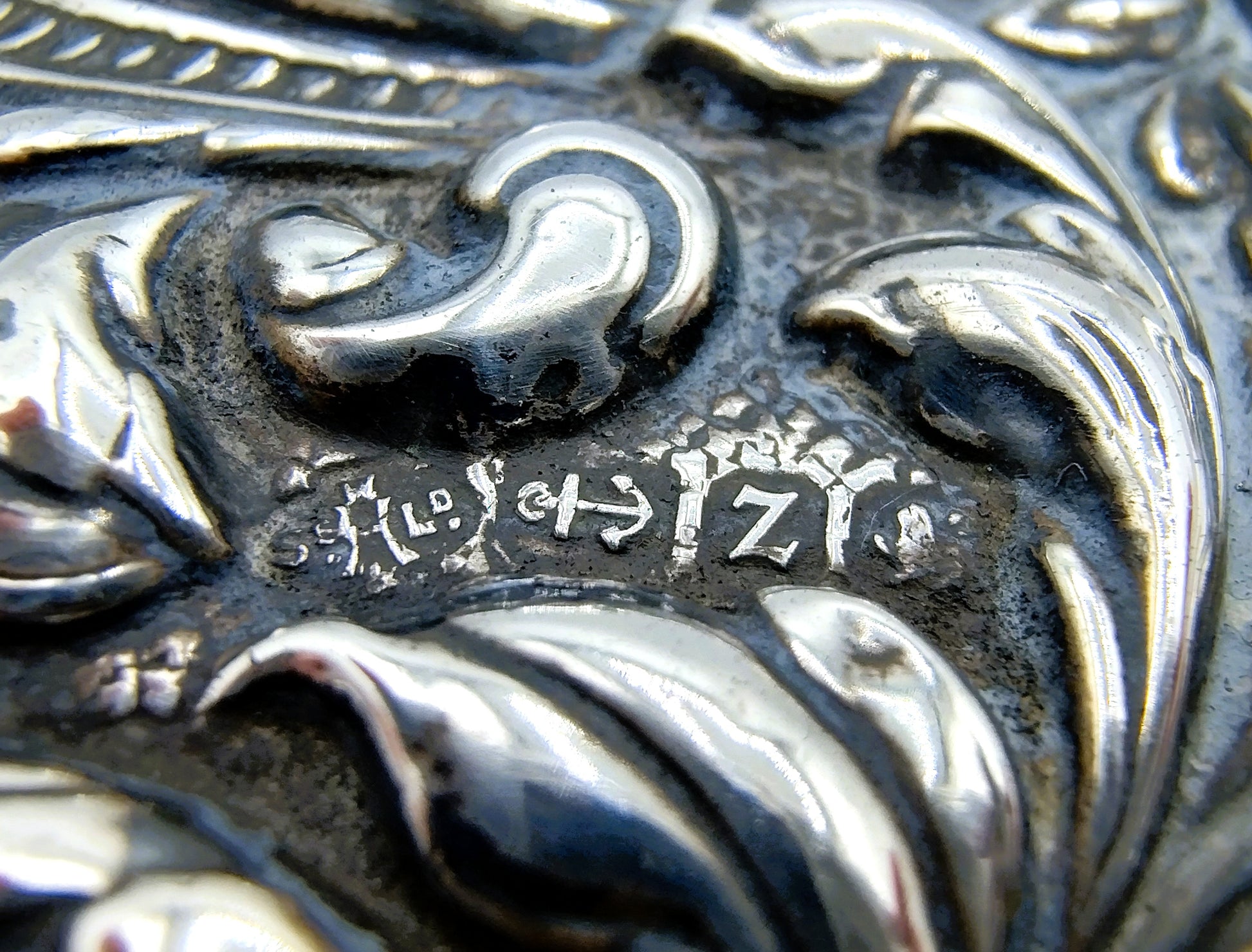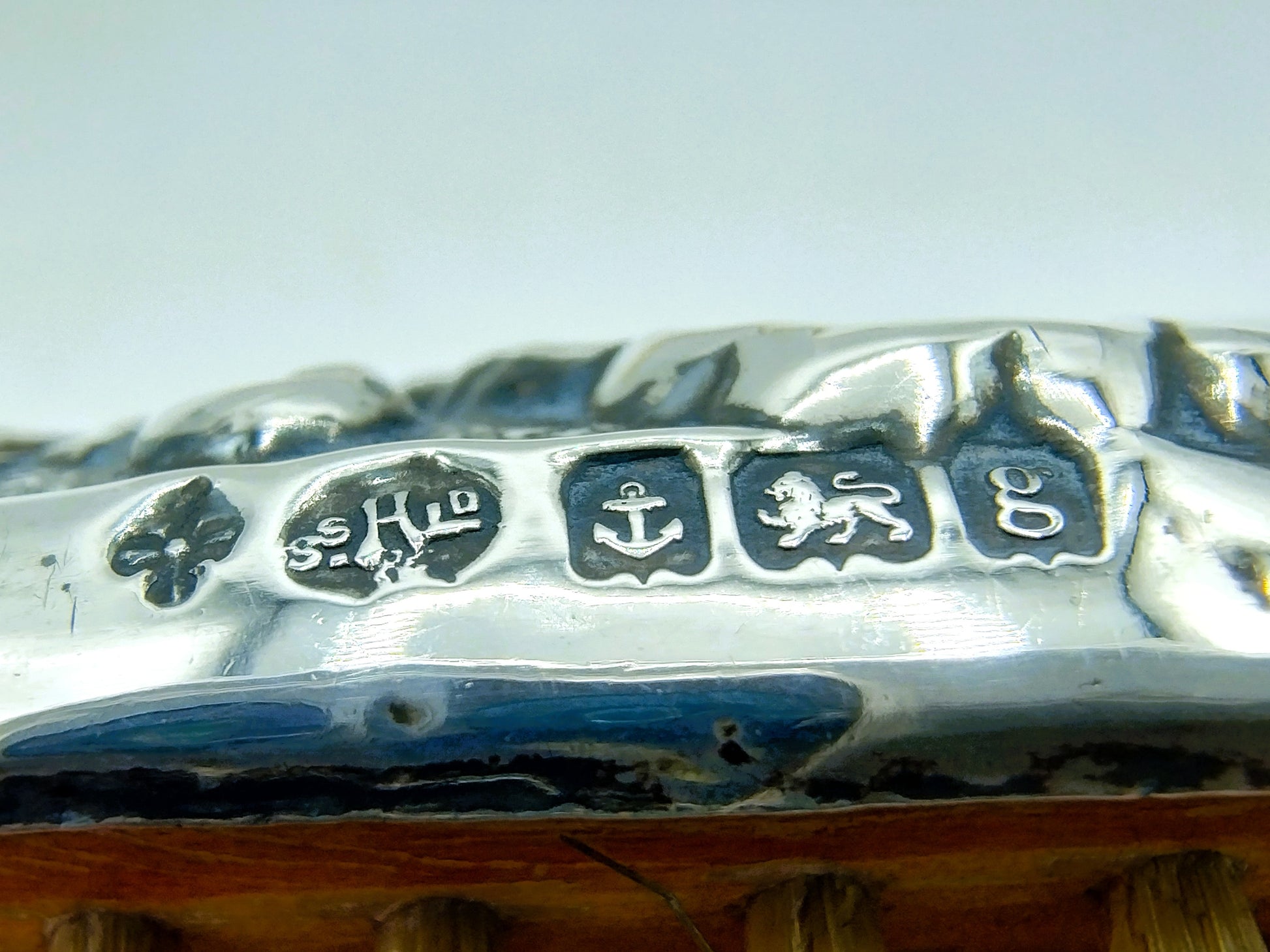 Weiter gekennzeichnet mit den Jahresbuchstaben: Z: 1899, A: 1900 und G: 1906, einem wandelnden Löwen für Sterlingsilber und einem Stadtpunzenanker für Birmingham.