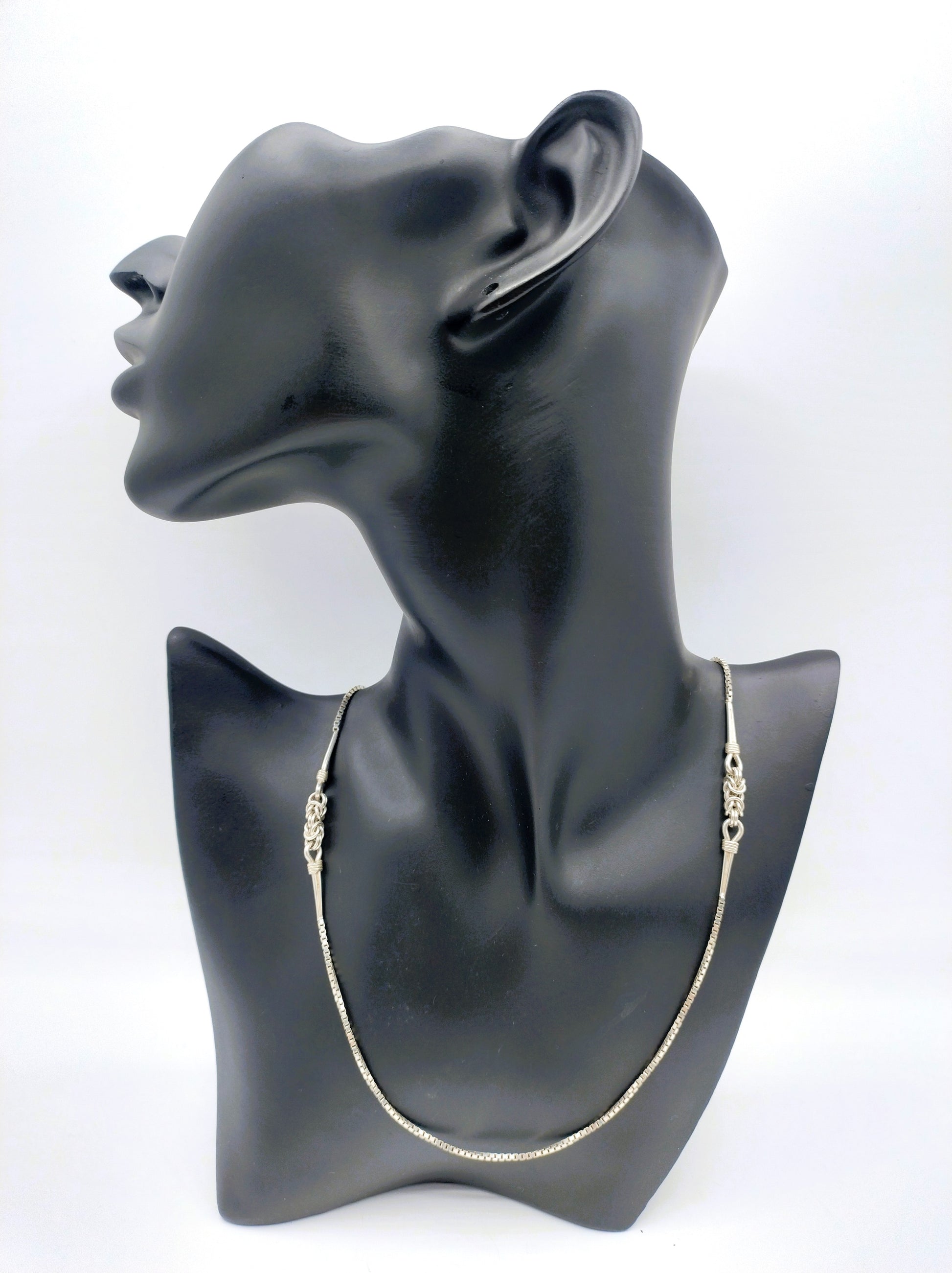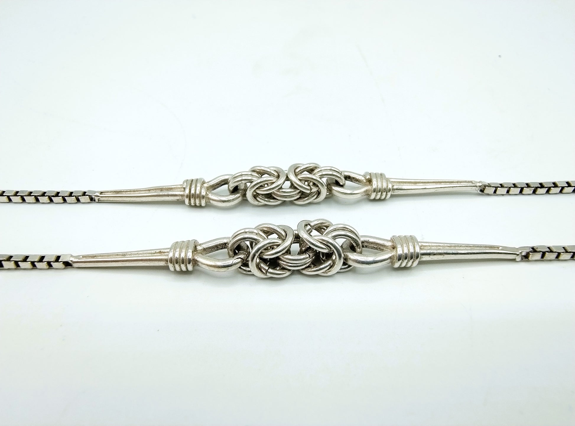 Lange Silberkette mit geflochtenen Designgliedern auf beiden Seiten.