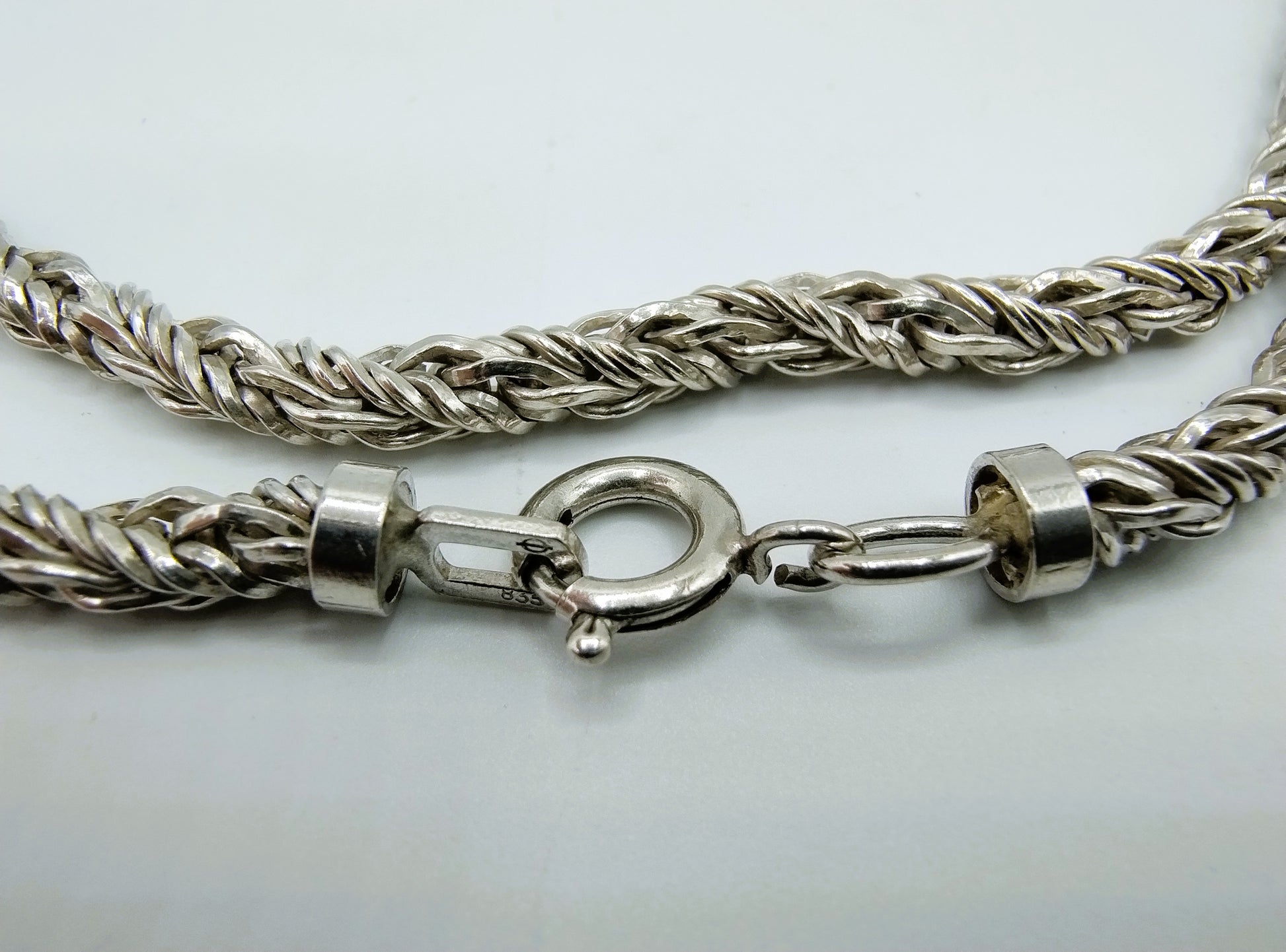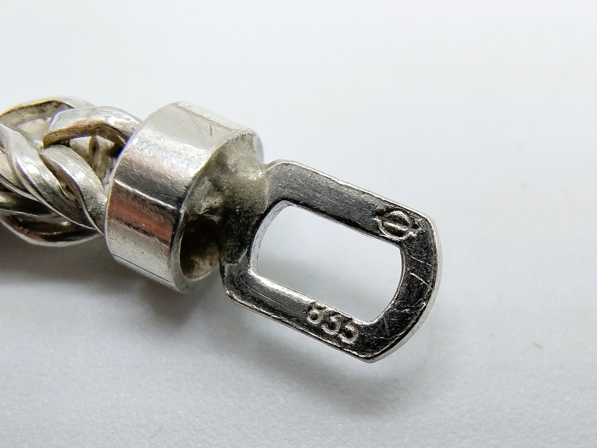 Die Halskette ist mit 835 für Silber zweiter Güteklasse und einem Meisterpunzenzeichen mit einem Kreis und einem Kreuzstrich gekennzeichnet.