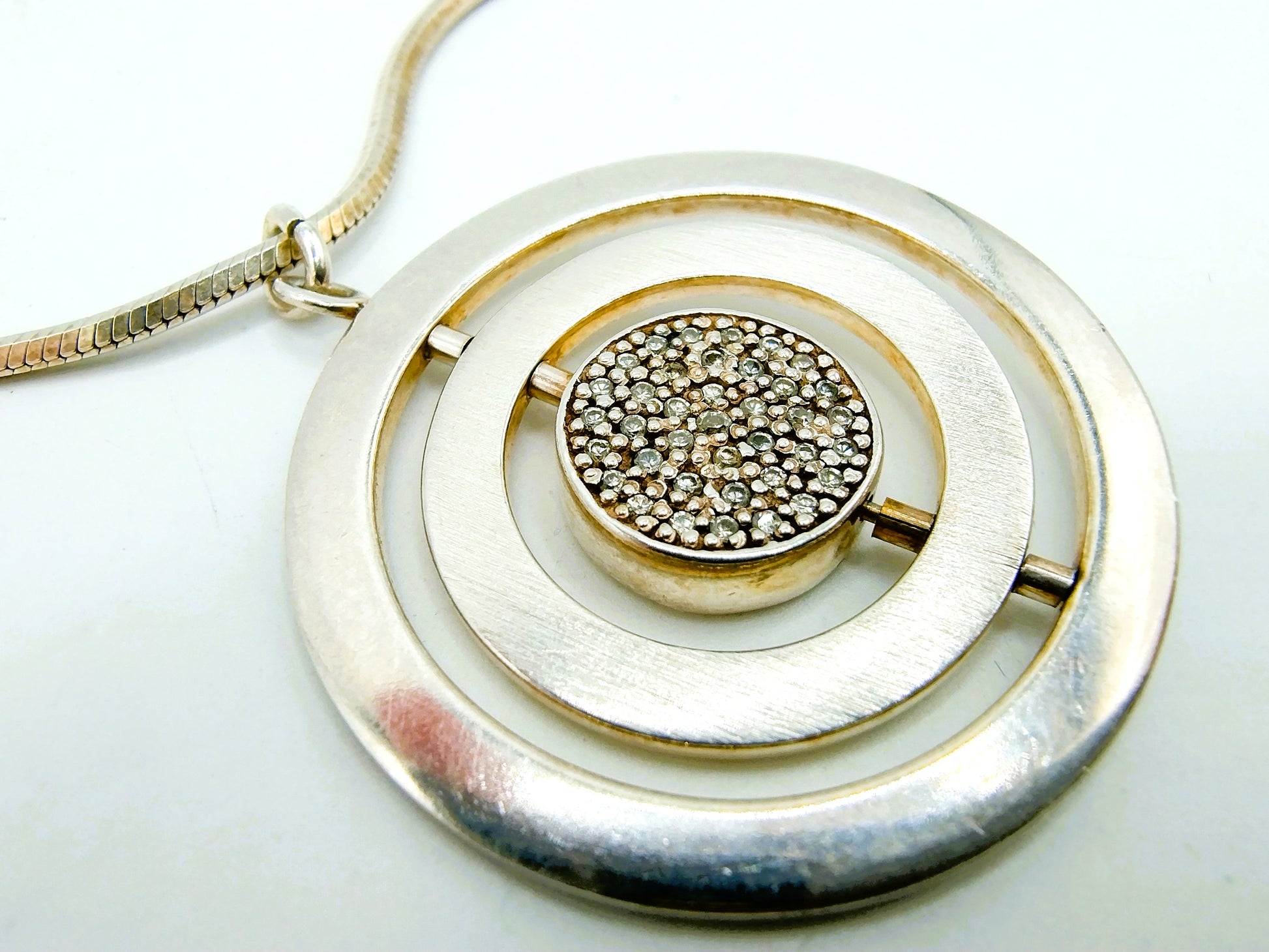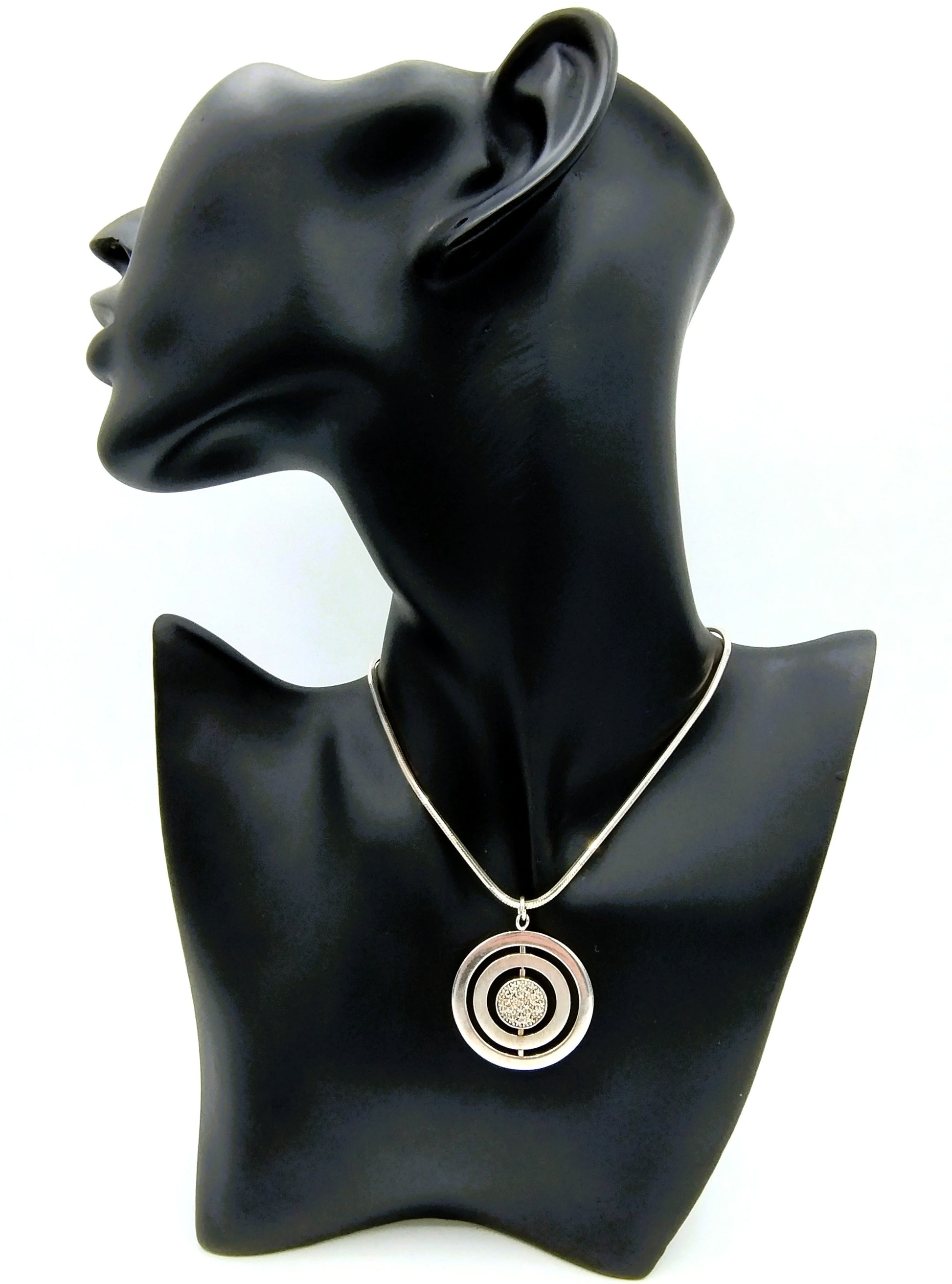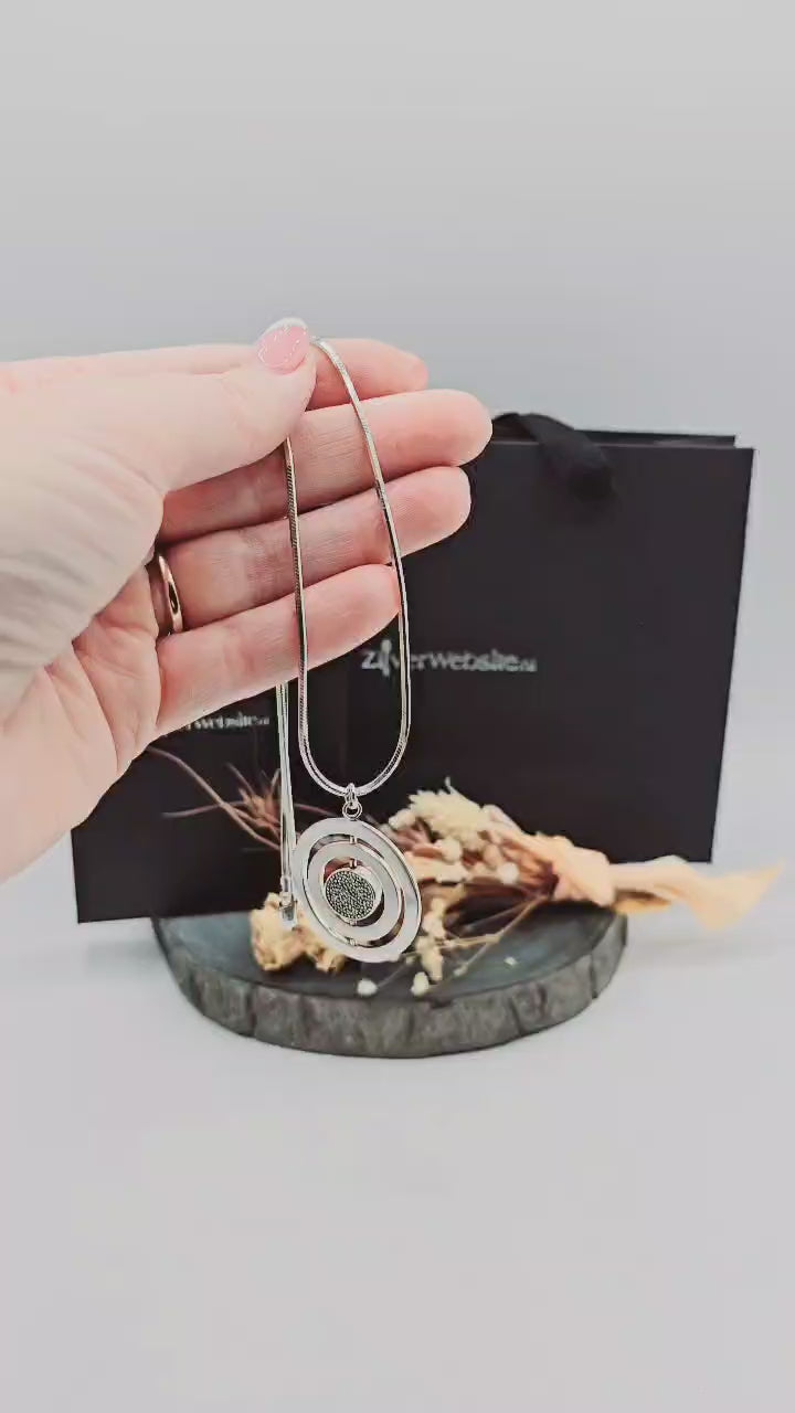 Silberne Halskette mit einem silbernen Designanhänger. Der Anhänger lässt sich separat in 3 Teile drehen.