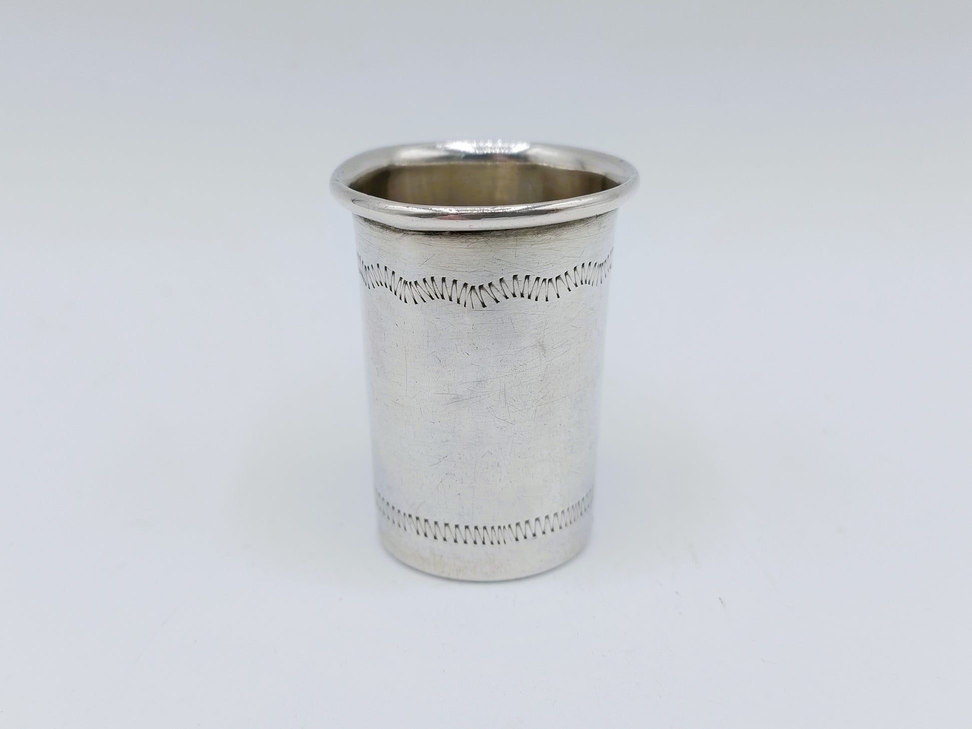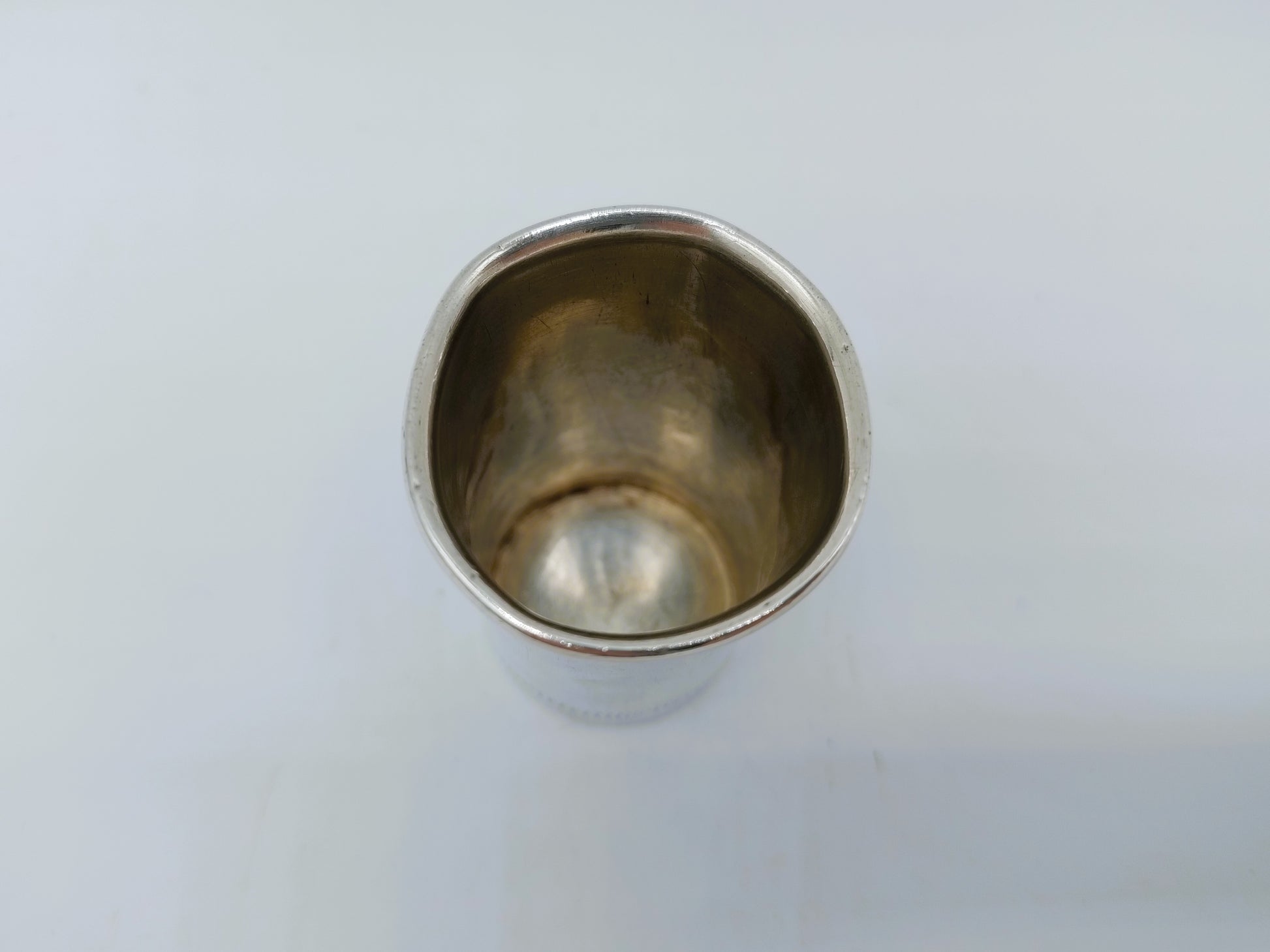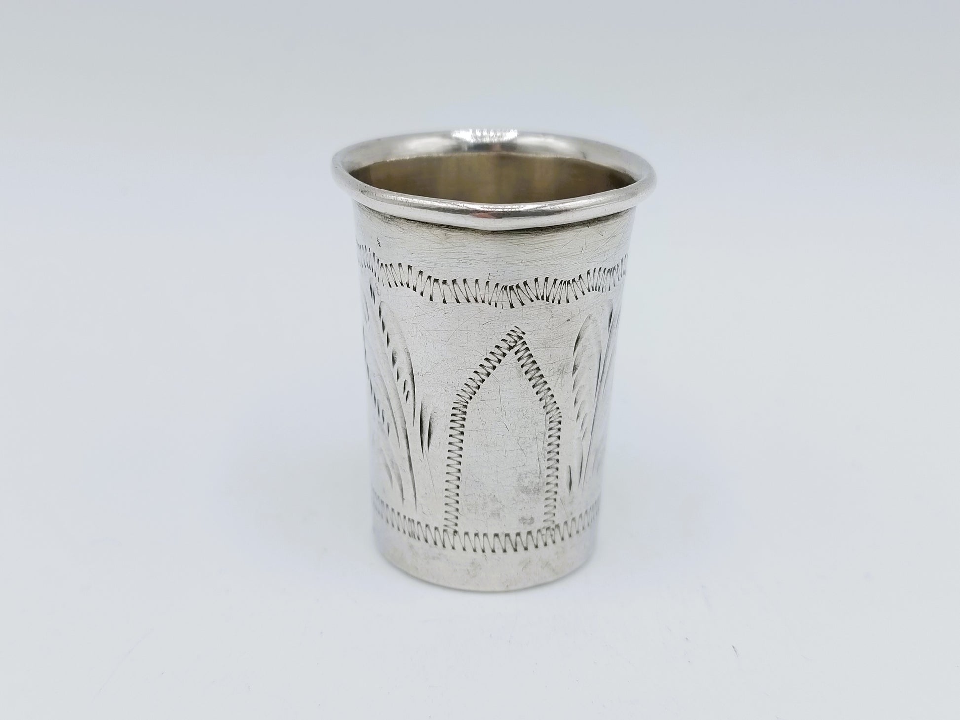 Dieser außergewöhnliche Kidduschbecher ist ein historisches Sammlerstück aus dem Jahr 1907 und wurde in Berditschew vom Kiewer Prüfamt punziert. Der Becher weist eine außergewöhnliche und gut dokumentierte Kombination von Punzen auf, die ausschließlich in diesem Jahr verwendet wurden.