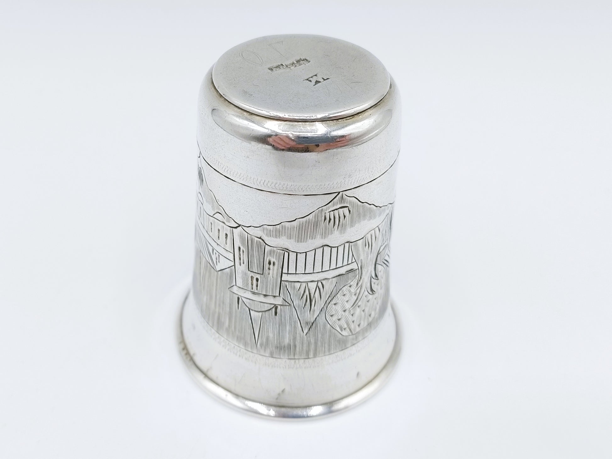 Dieser außergewöhnliche Kidduschbecher ist ein wahres historisches Prunkstück aus dem Russland des späten 19. Jahrhunderts. Das Objekt wurde zwischen 1878 und 1882 in Moskau gefertigt und trägt die offiziellen Punzierungszeichen jener Zeit.