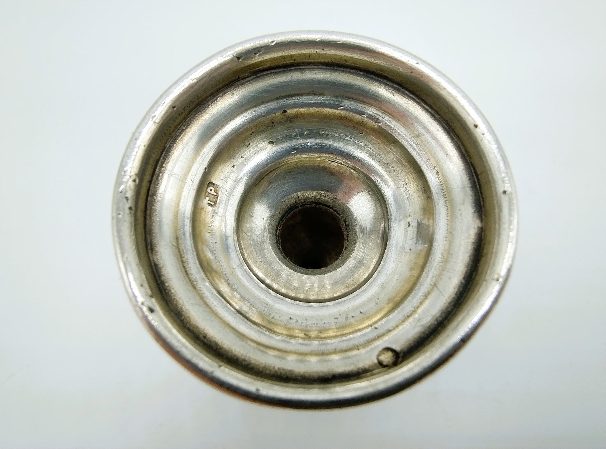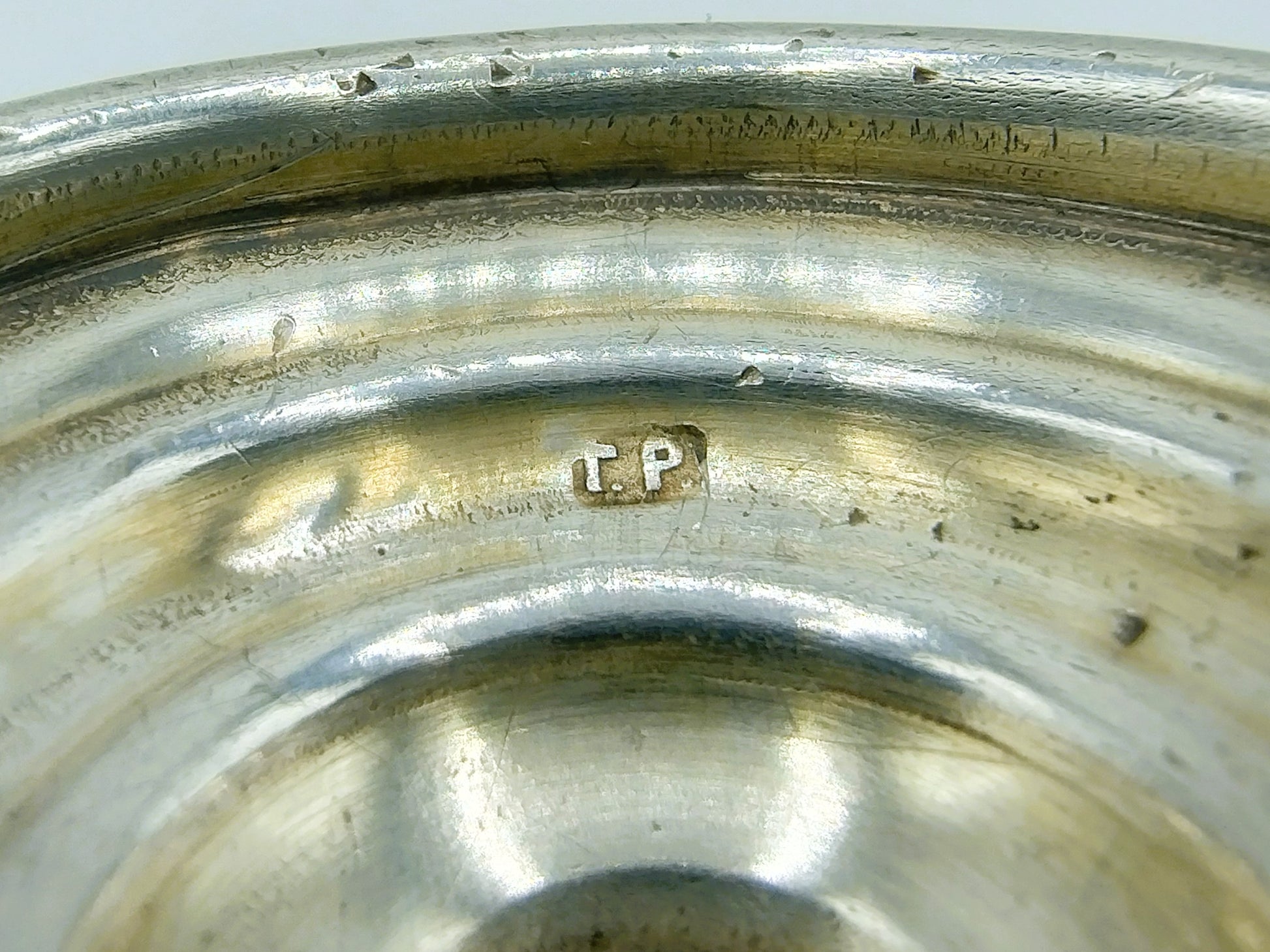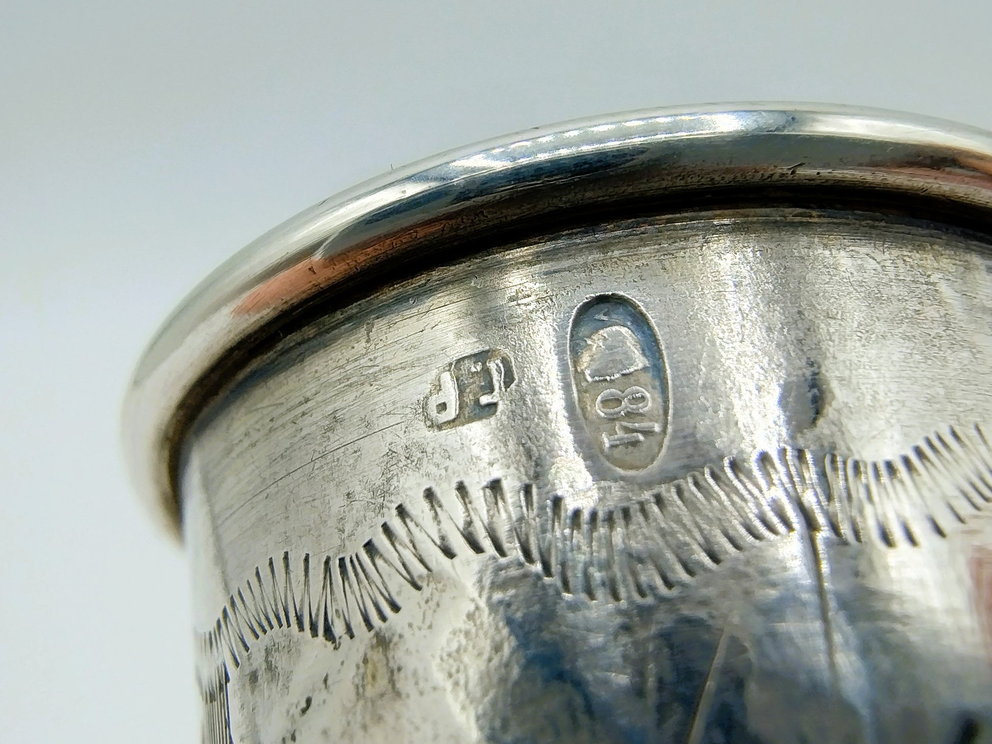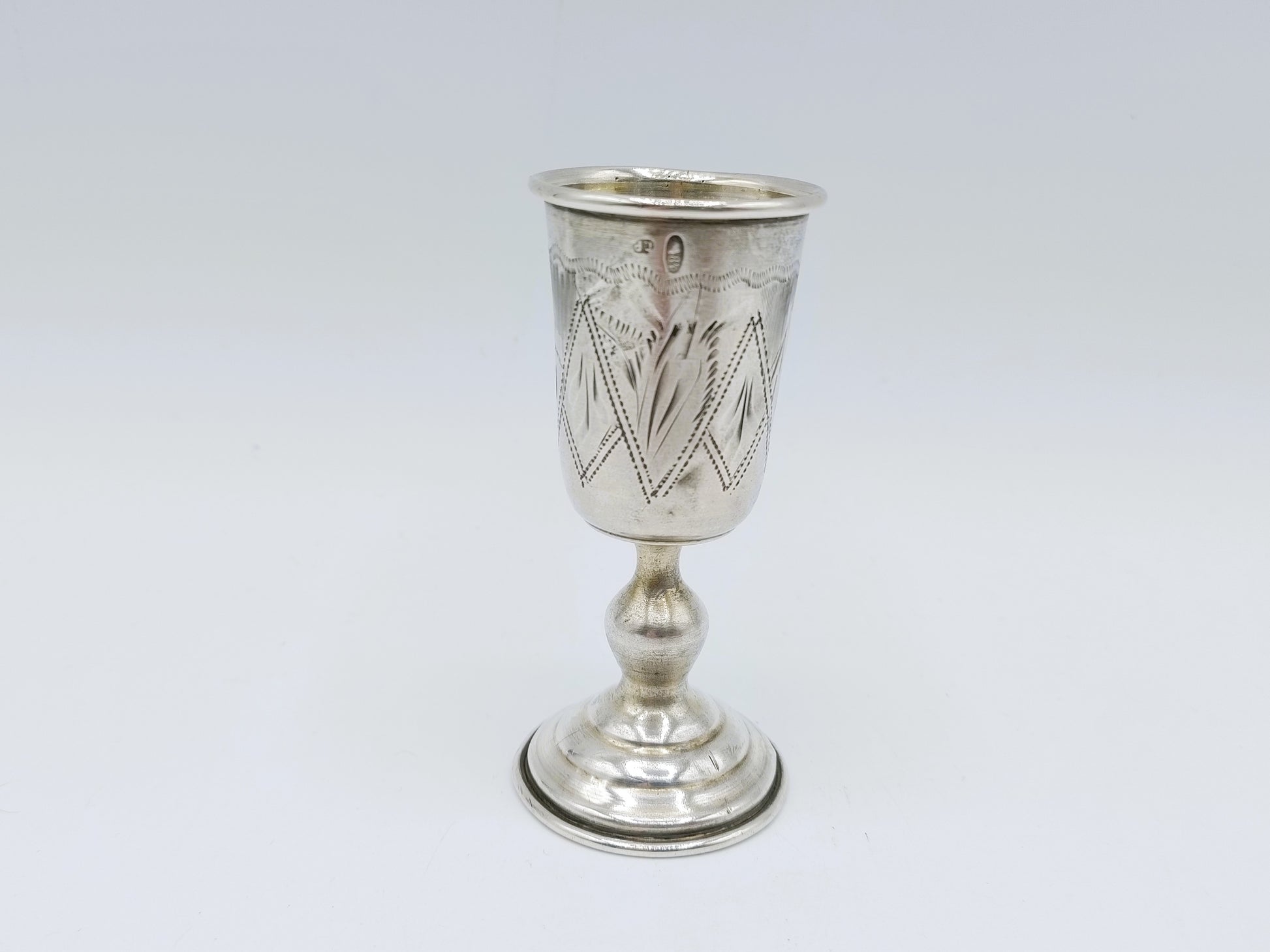 Der Becher trägt die Meistermarke ГР , die zu Гирш Равкин (Girsh Ravkin) gehört, einem bekannten Silberschmied und Hersteller von Judaica.