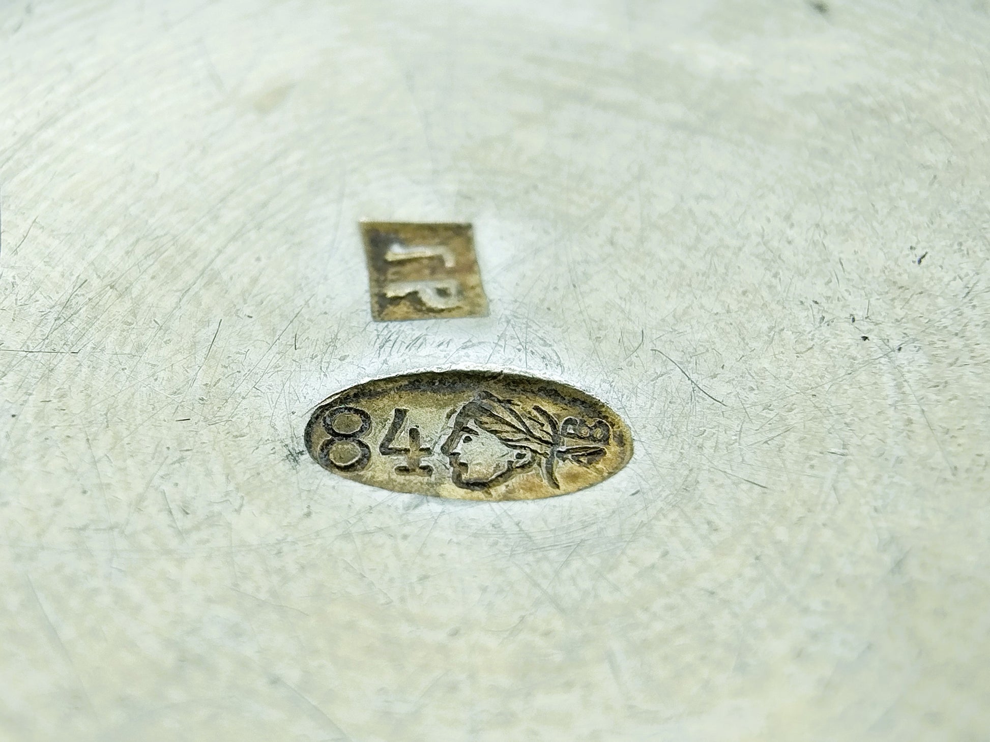 Der Becher trägt die Meistermarke ГР , die zu Гирш Равкин (Girsh Ravkin) gehört, einem bekannten Silberschmied und Hersteller von Judaica.