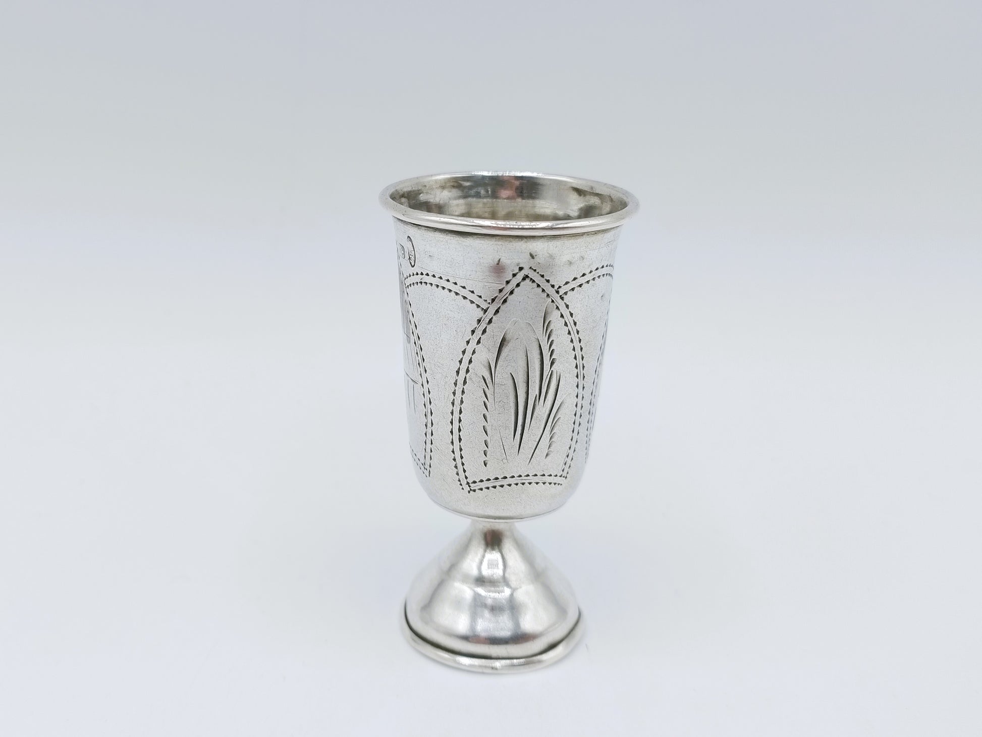 Dieser authentische Kidduschbecher ist ein wunderschönes Beispiel jüdischer Silberschmiedekunst des späten 19. Jahrhunderts. Das Stück wurde in Berditschew gefertigt und um 1900 vom Kiewer Prüfamt punziert – zu einer Zeit, als die Stadt ein bedeutendes Zentrum der Judaica-Produktion war.