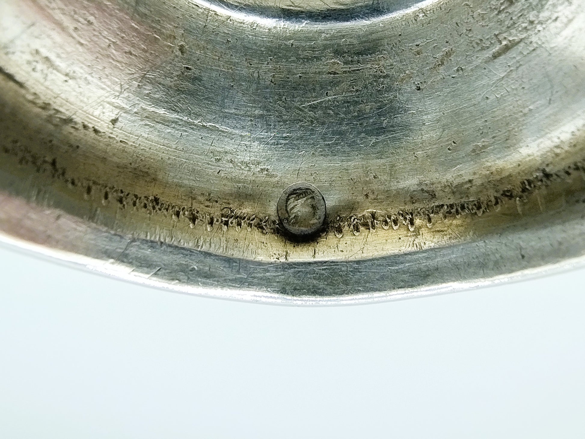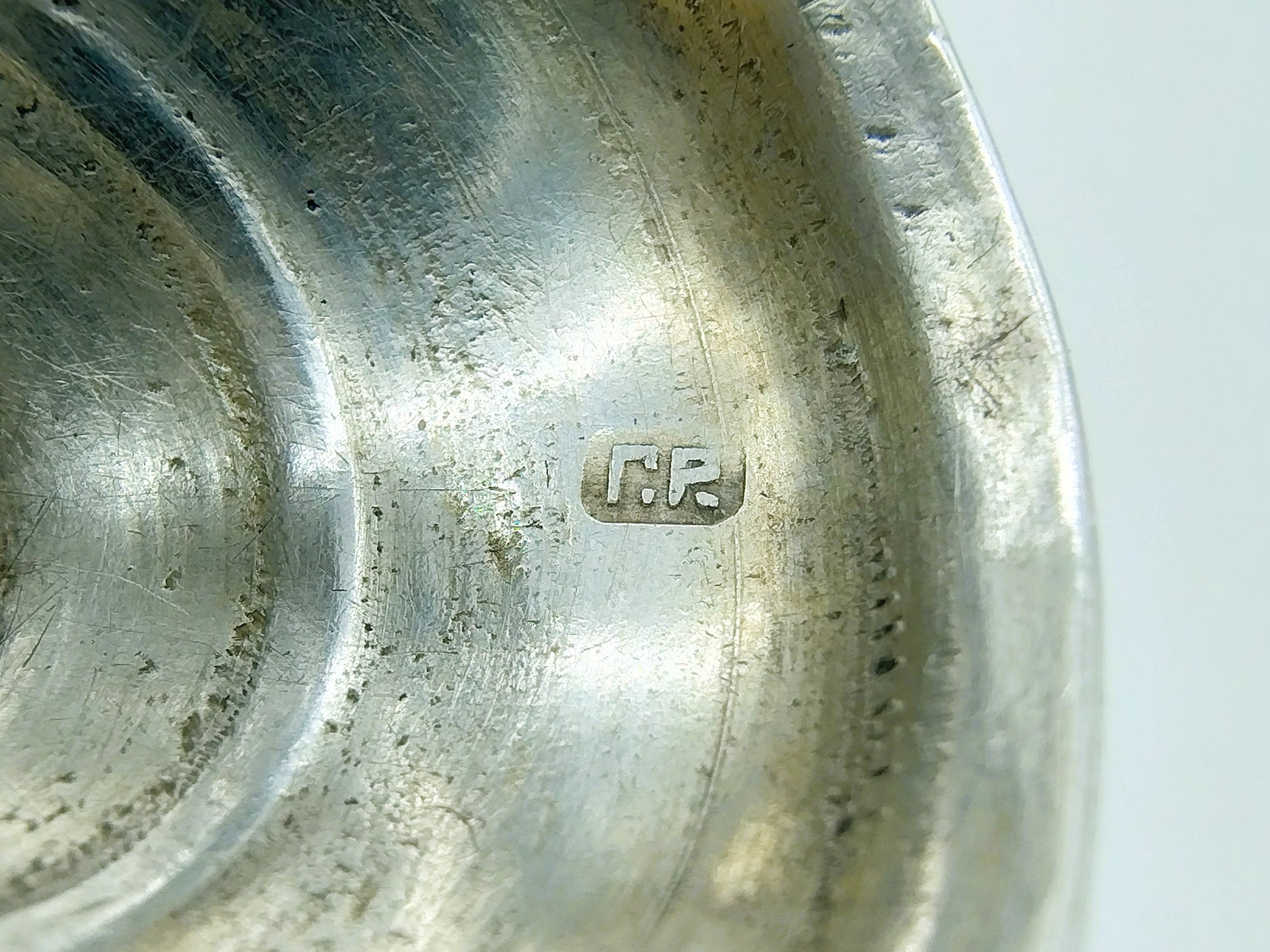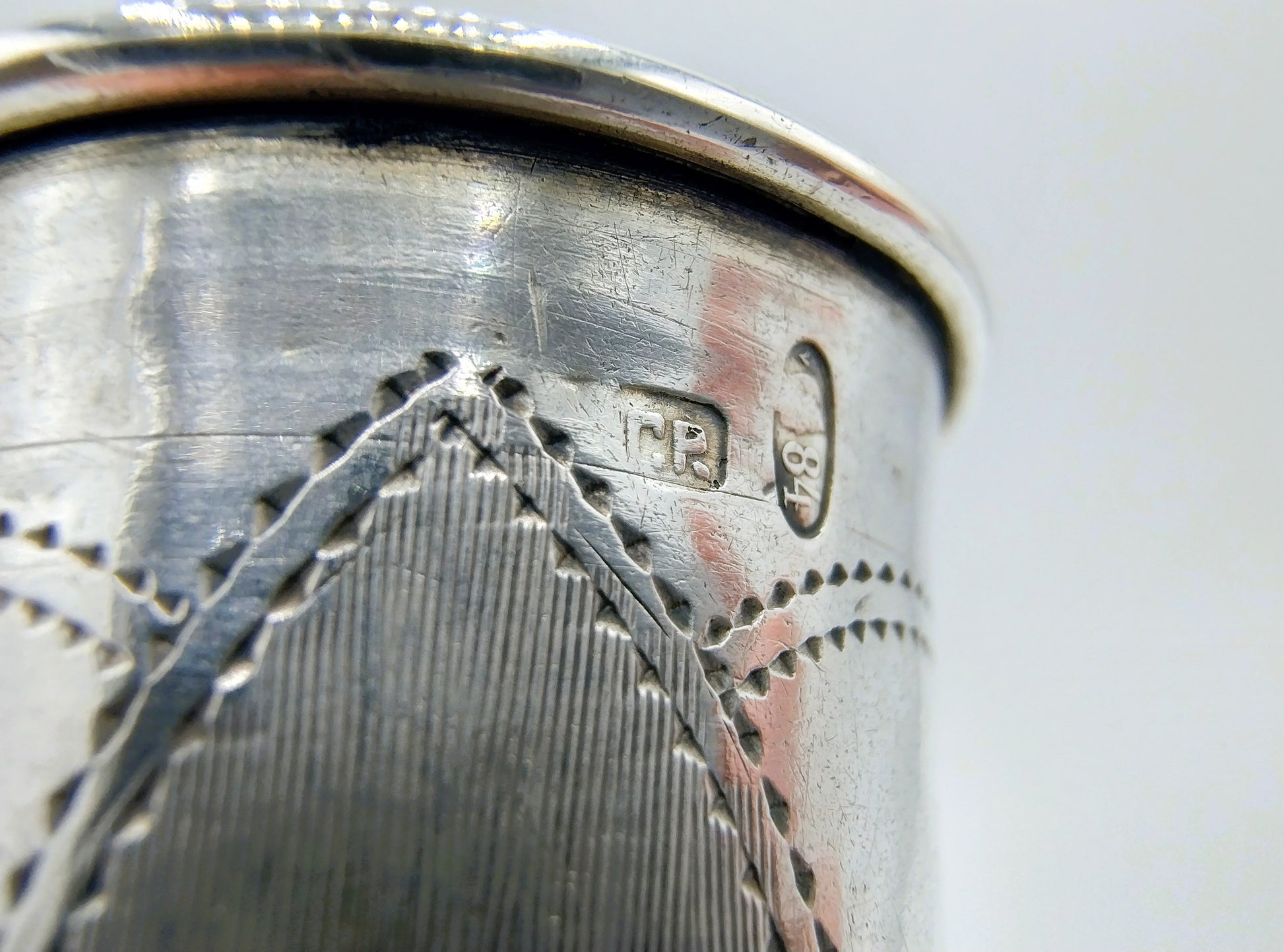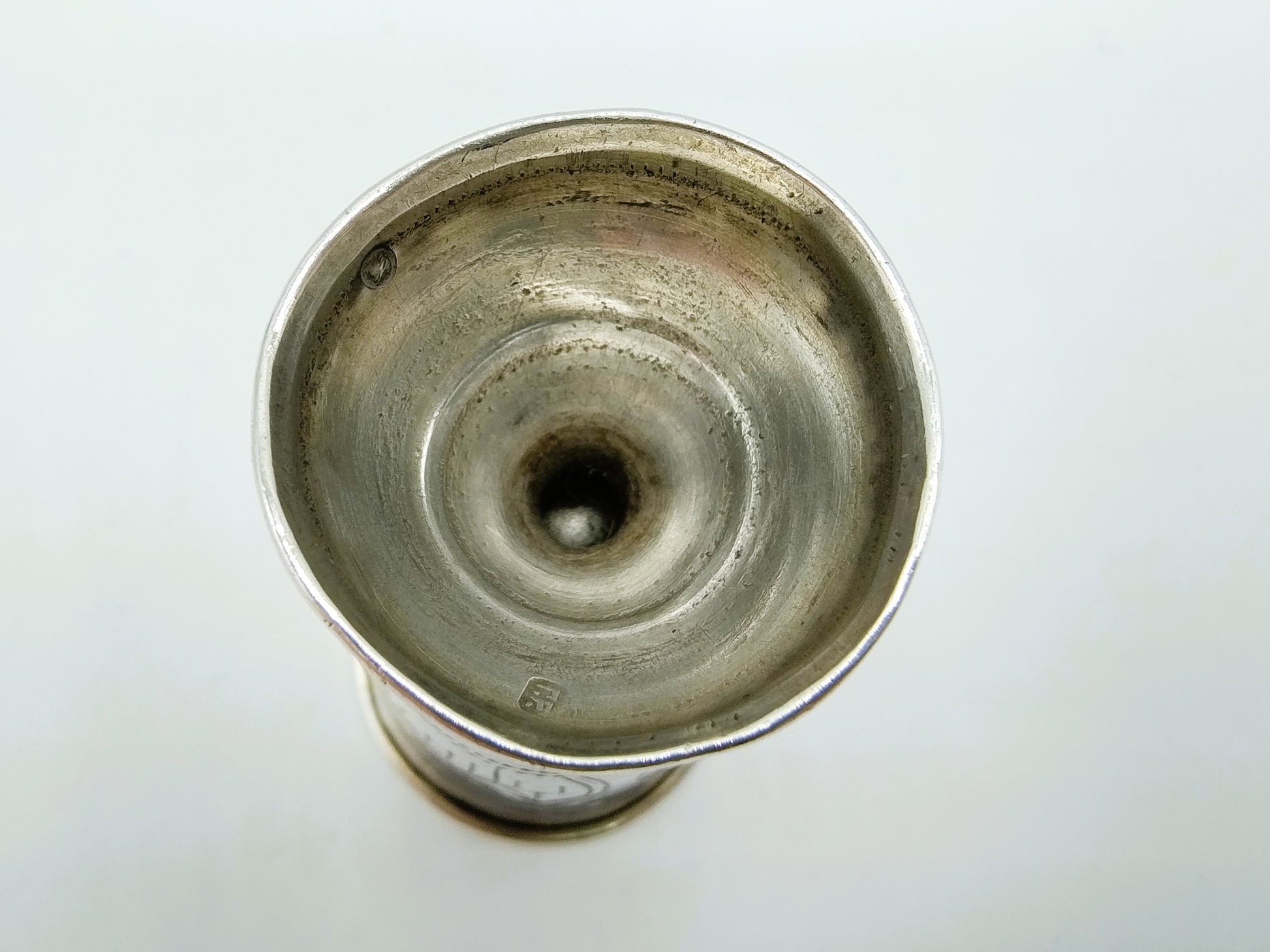 Der Becher trägt die Meistermarke ГР , die zu Гирш Равкин (Girsh Ravkin) gehört, einem bekannten Silberschmied und Hersteller von Judaica.
