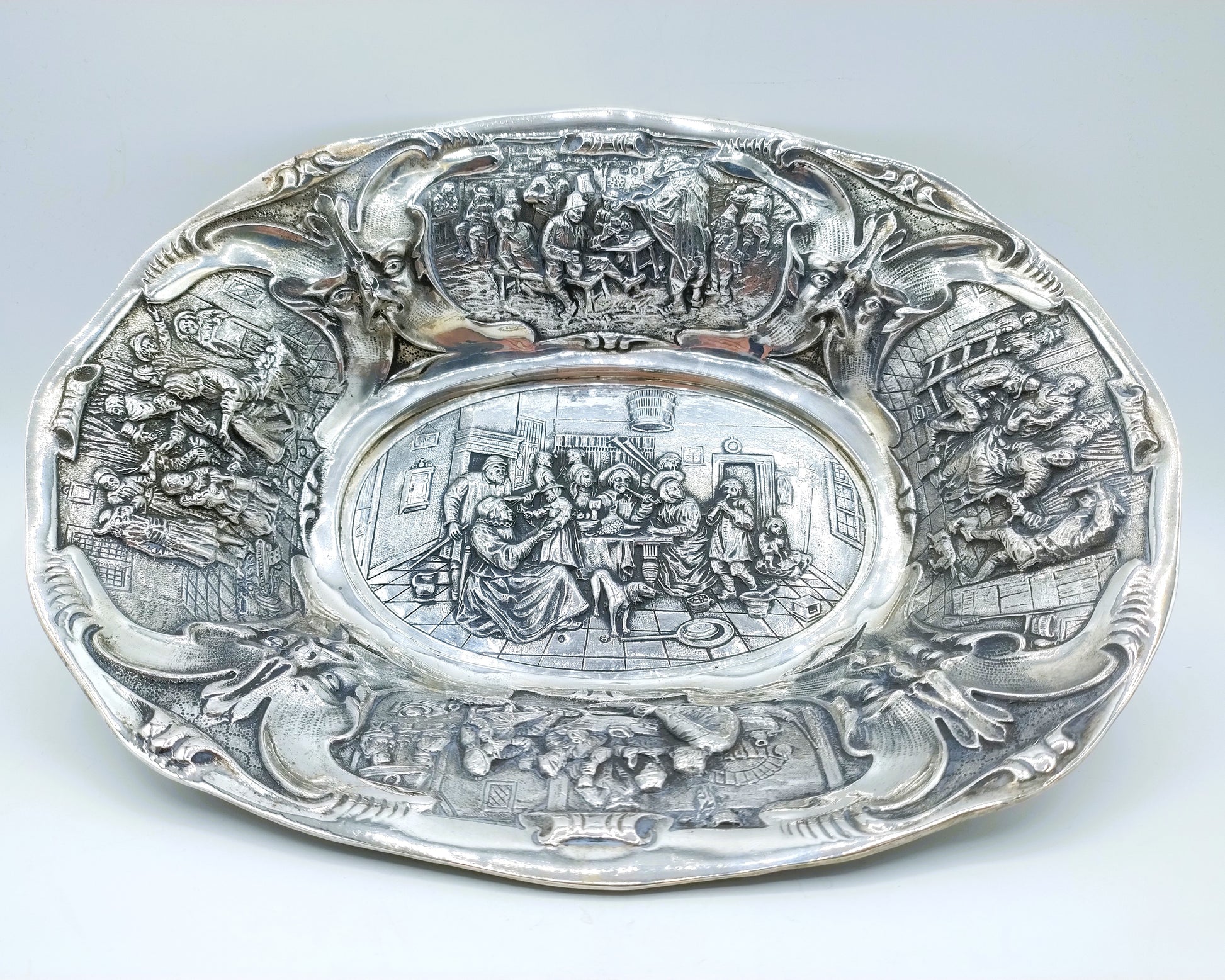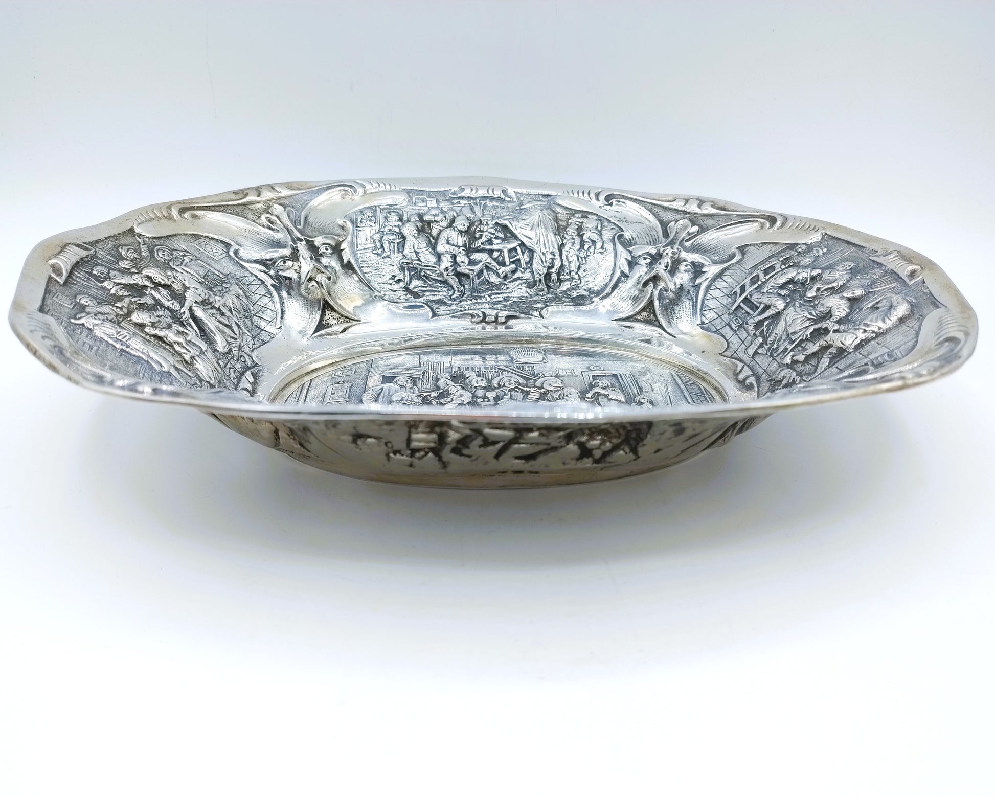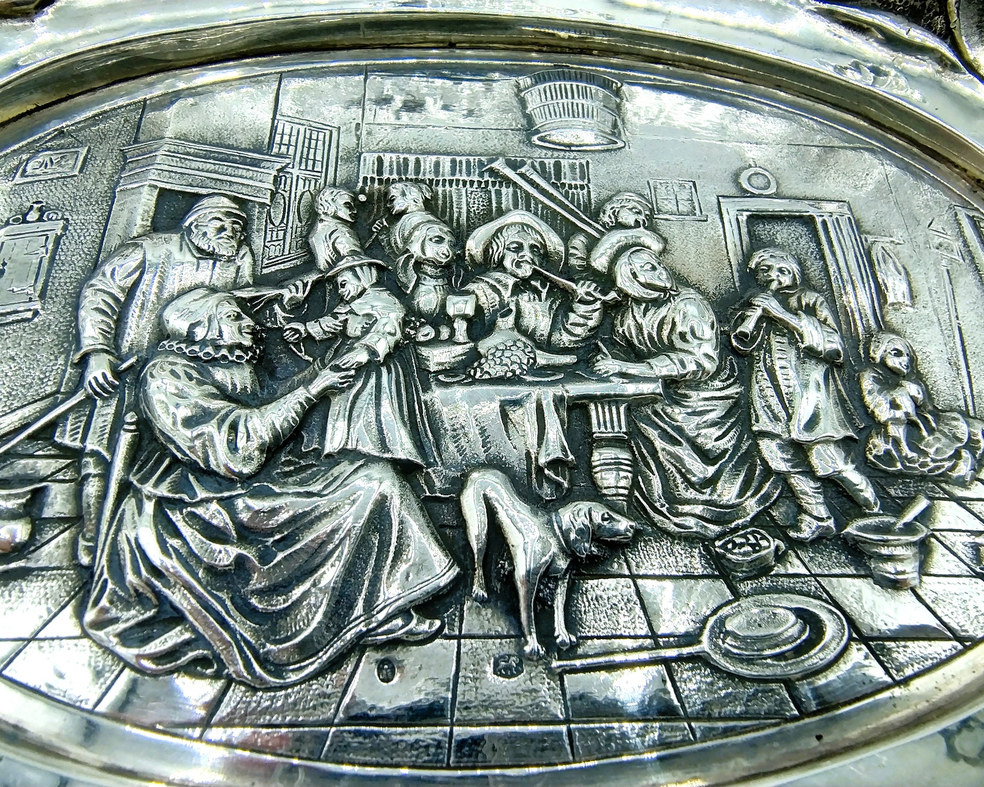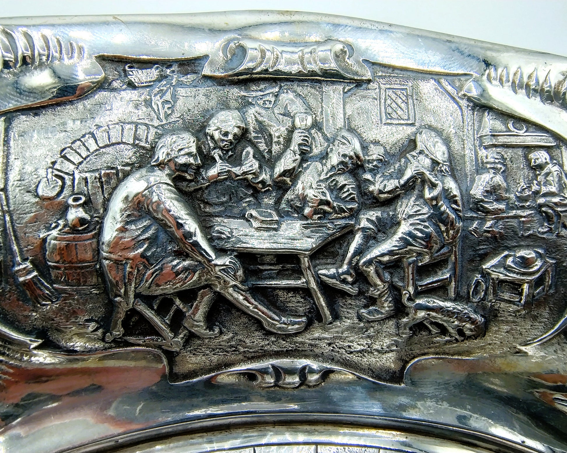 Silberne Keksschale mit alten holländischen Wirtshausszenen, hergestellt von der Fa. Dahlie aus Amsterdam. Die Meistermarke wurde zwischen 1920 und 1958 verwendet.