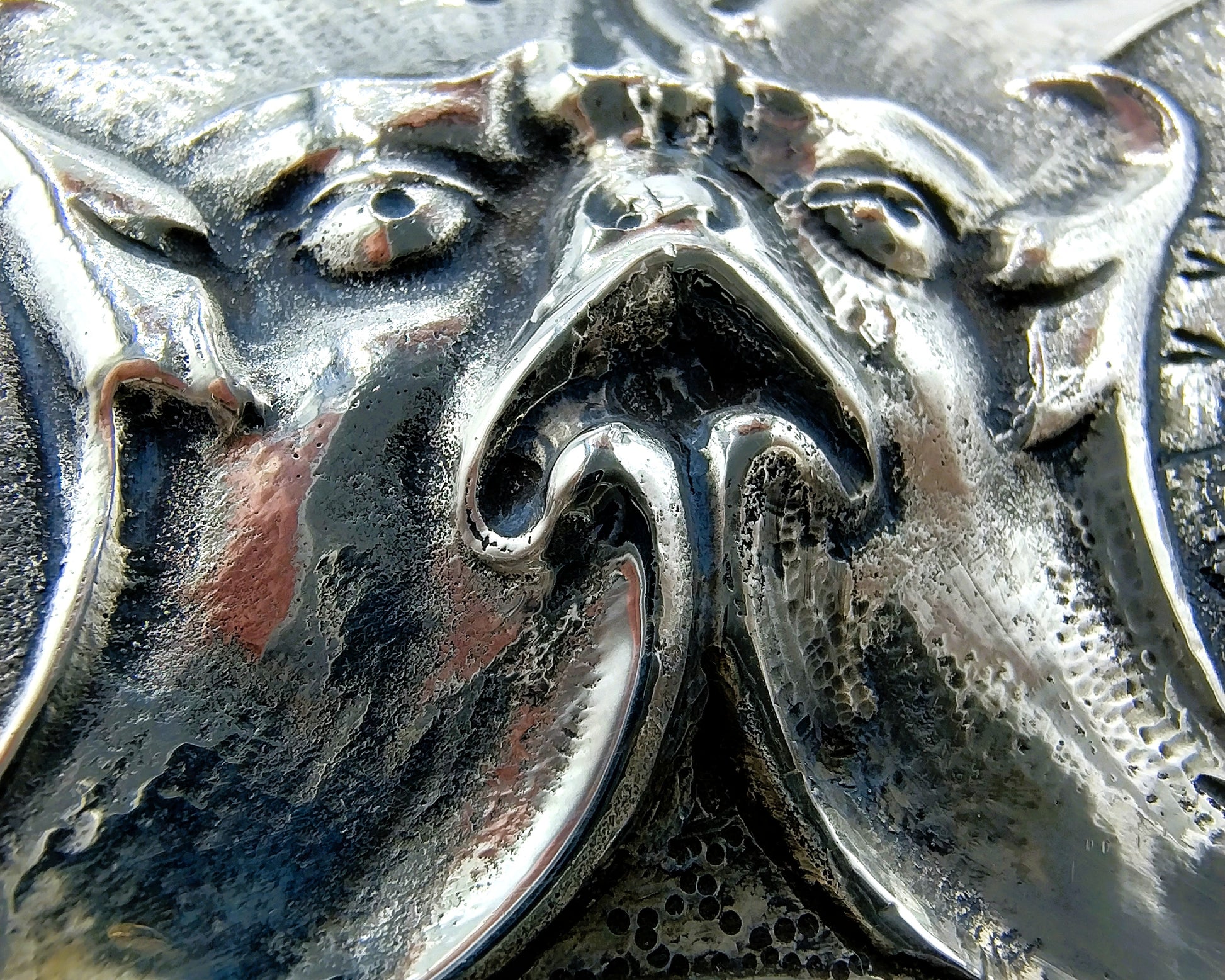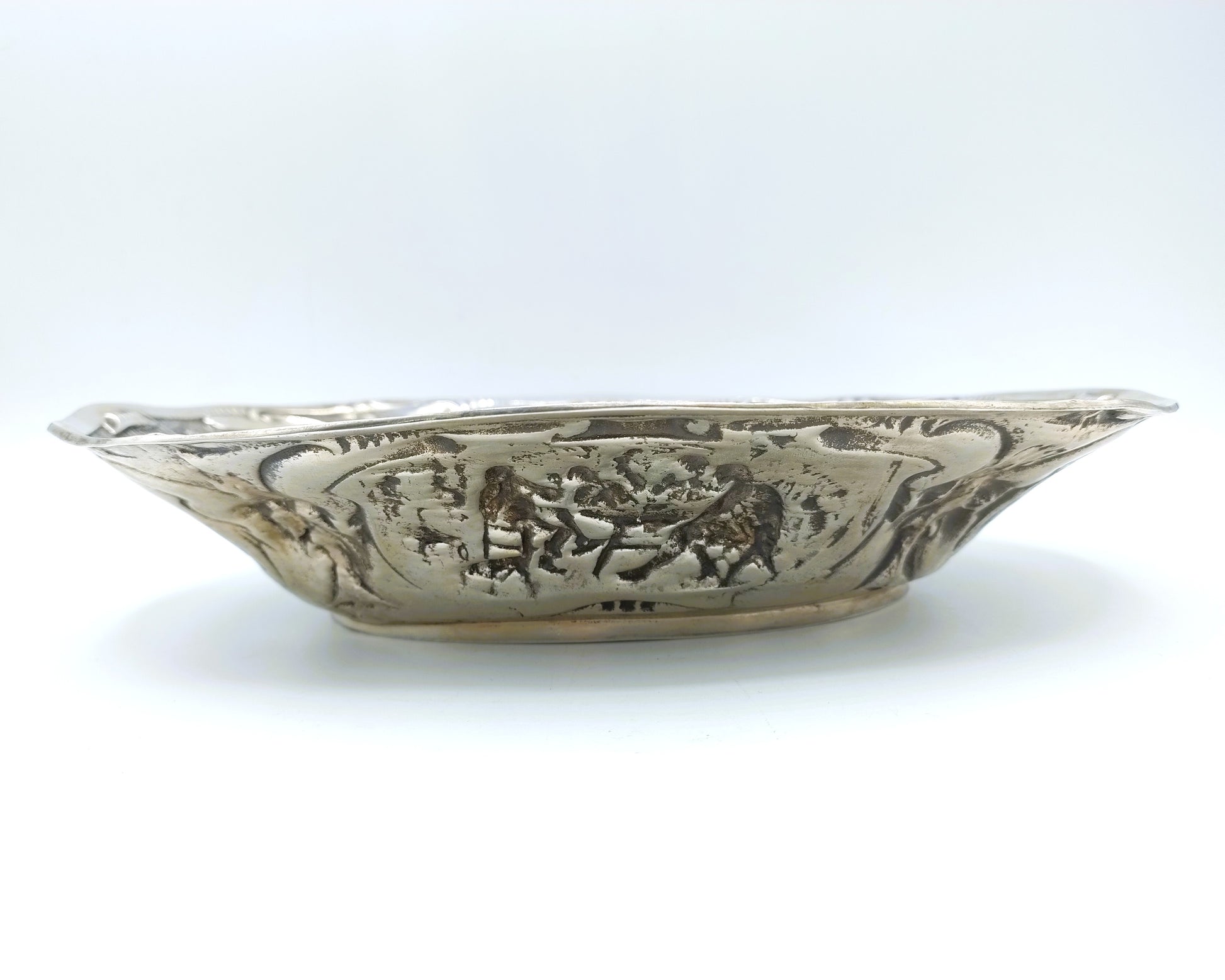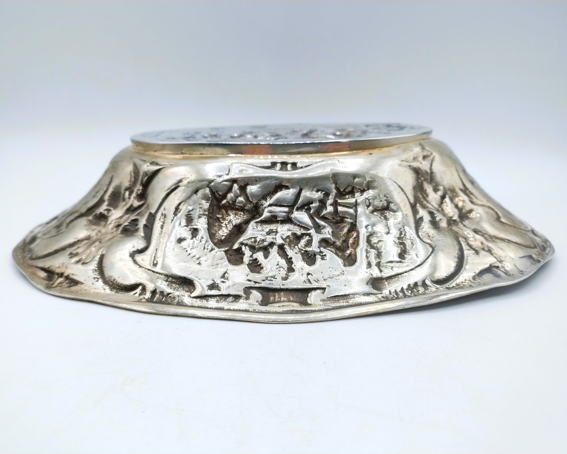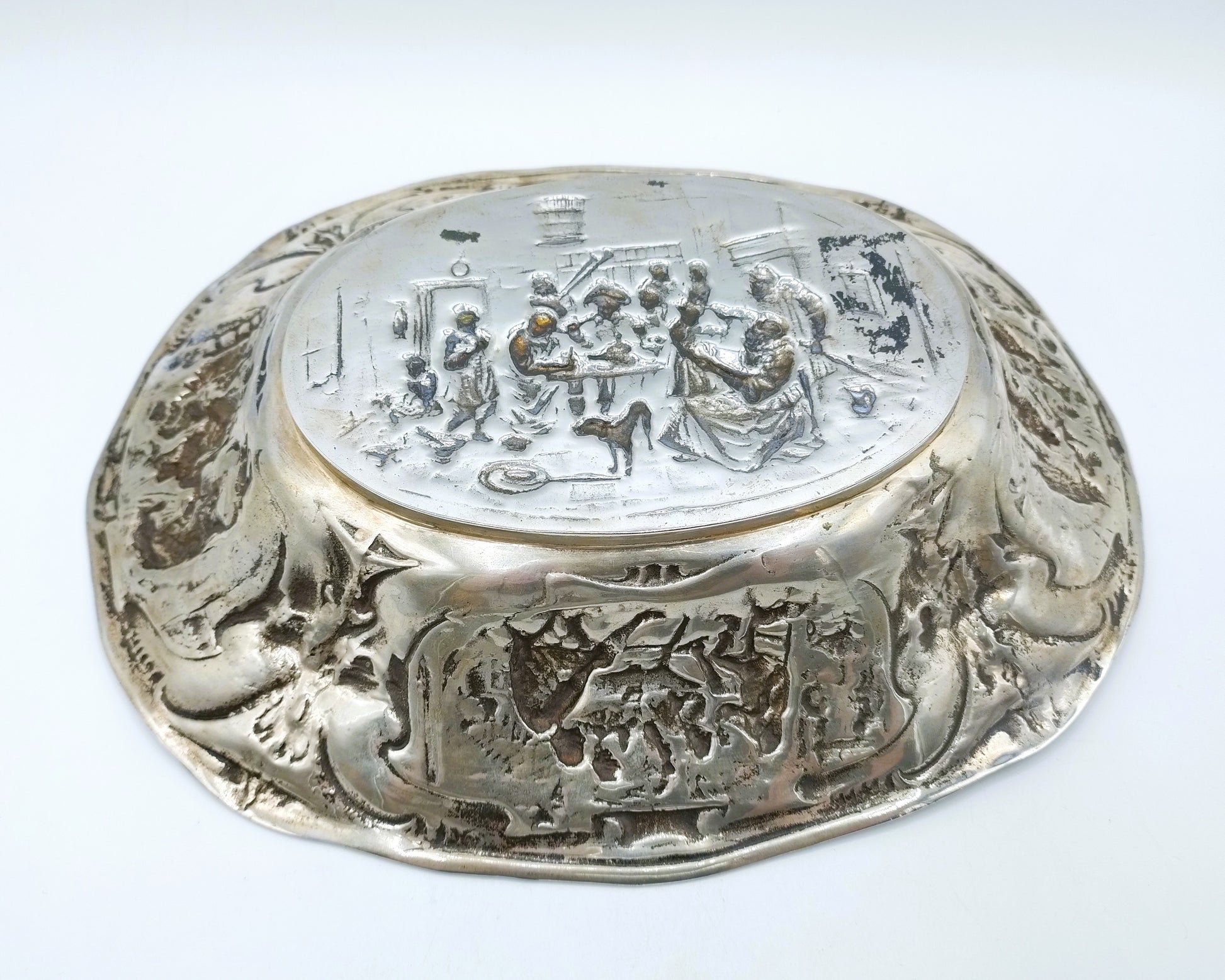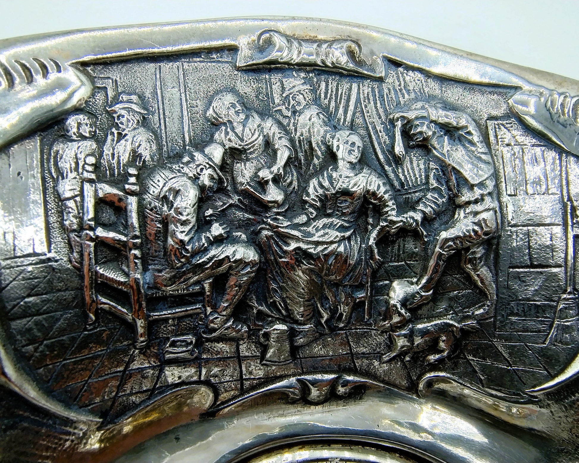 Silberne Keksschale mit alten holländischen Wirtshausszenen, hergestellt von der Fa. Dahlie aus Amsterdam. Die Meistermarke wurde zwischen 1920 und 1958 verwendet.