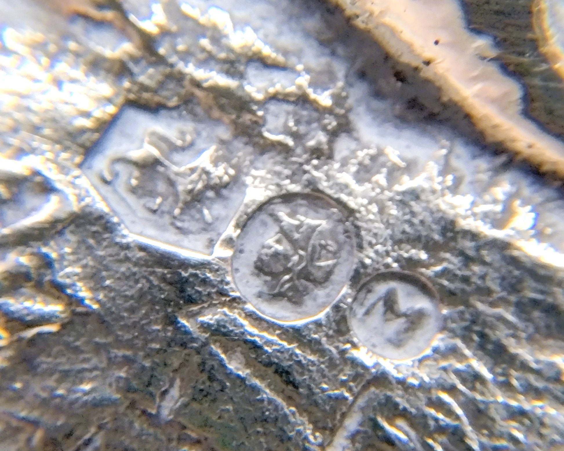 Die Schale ist mit der Meistermarke D Baum S, dem zweiten Qualitätszeichen (835/1000), dem Minerva-Kopf und dem Jahresbuchstaben m für 1947 gekennzeichnet.