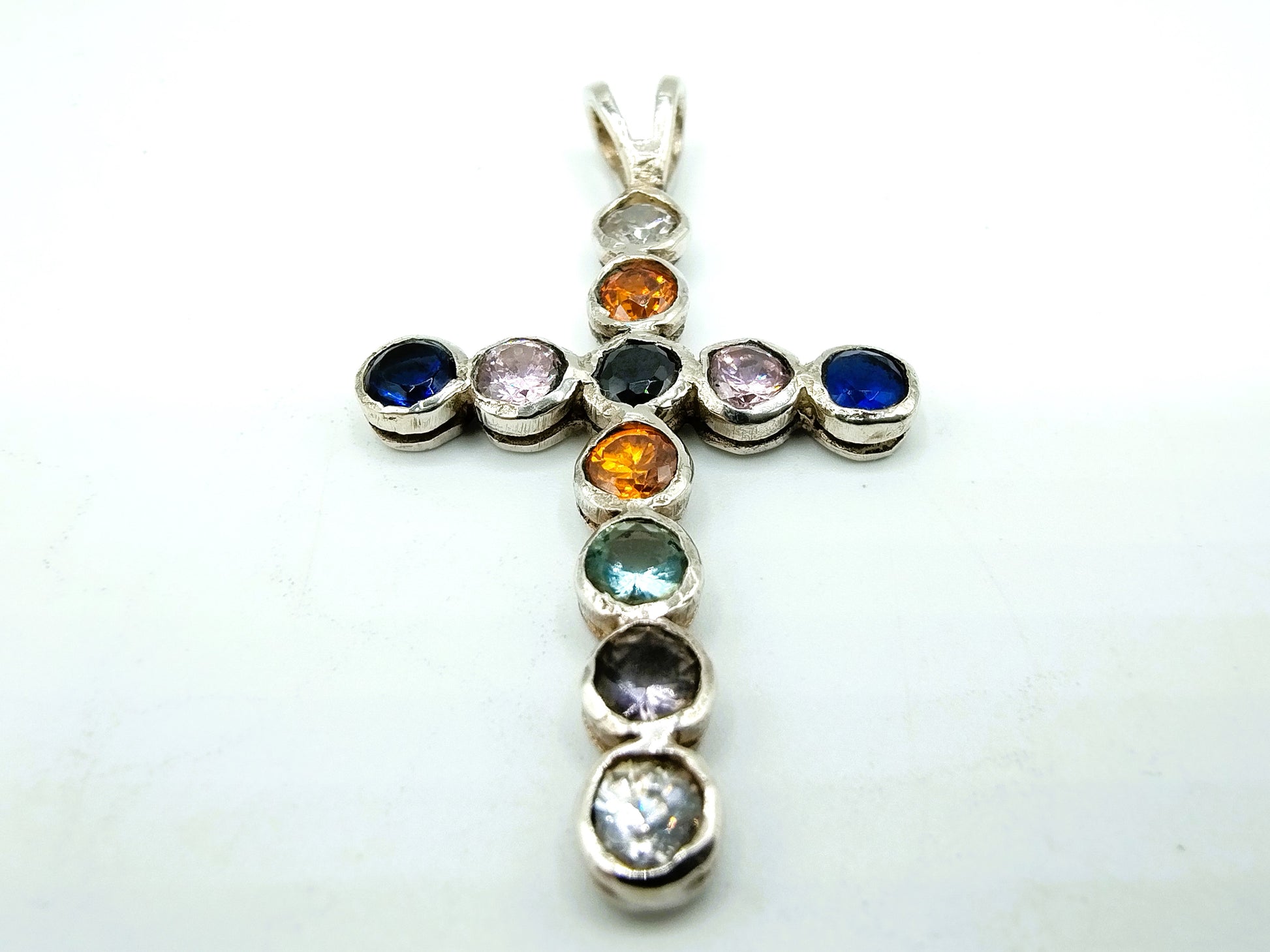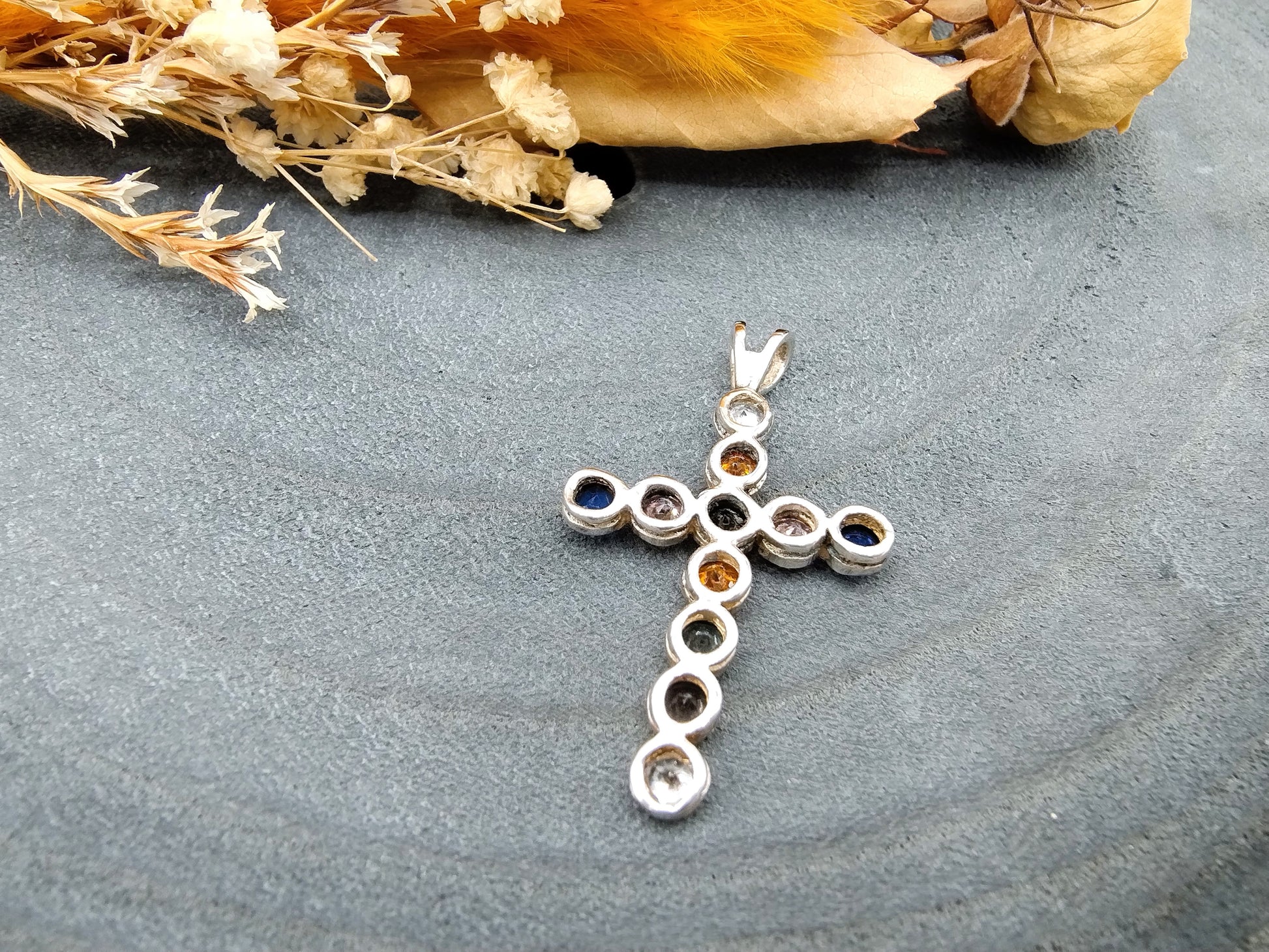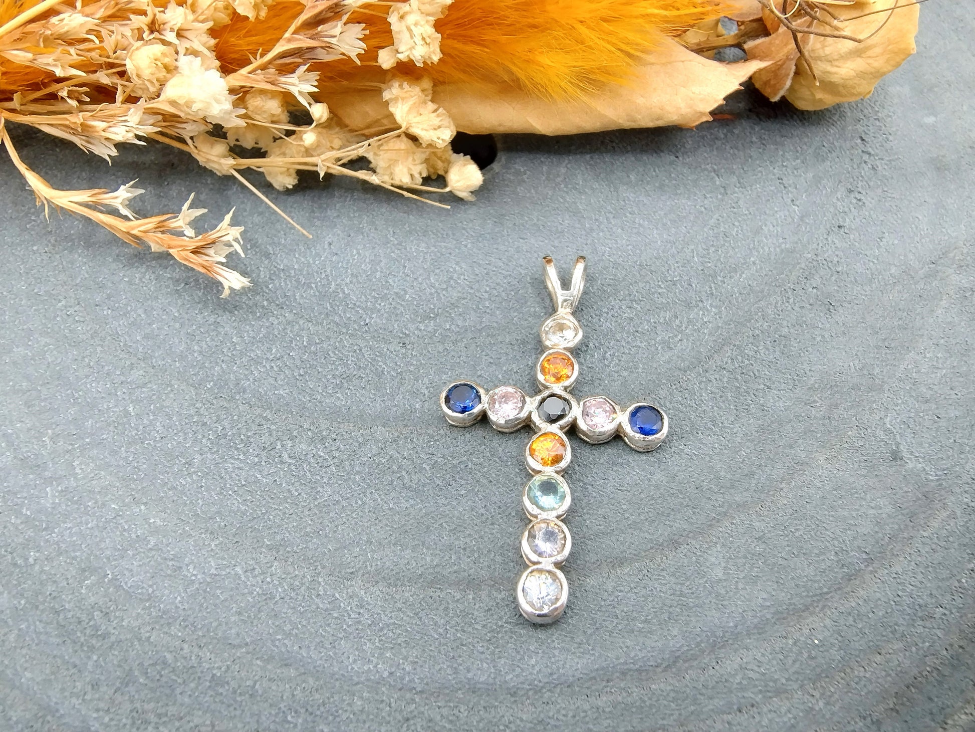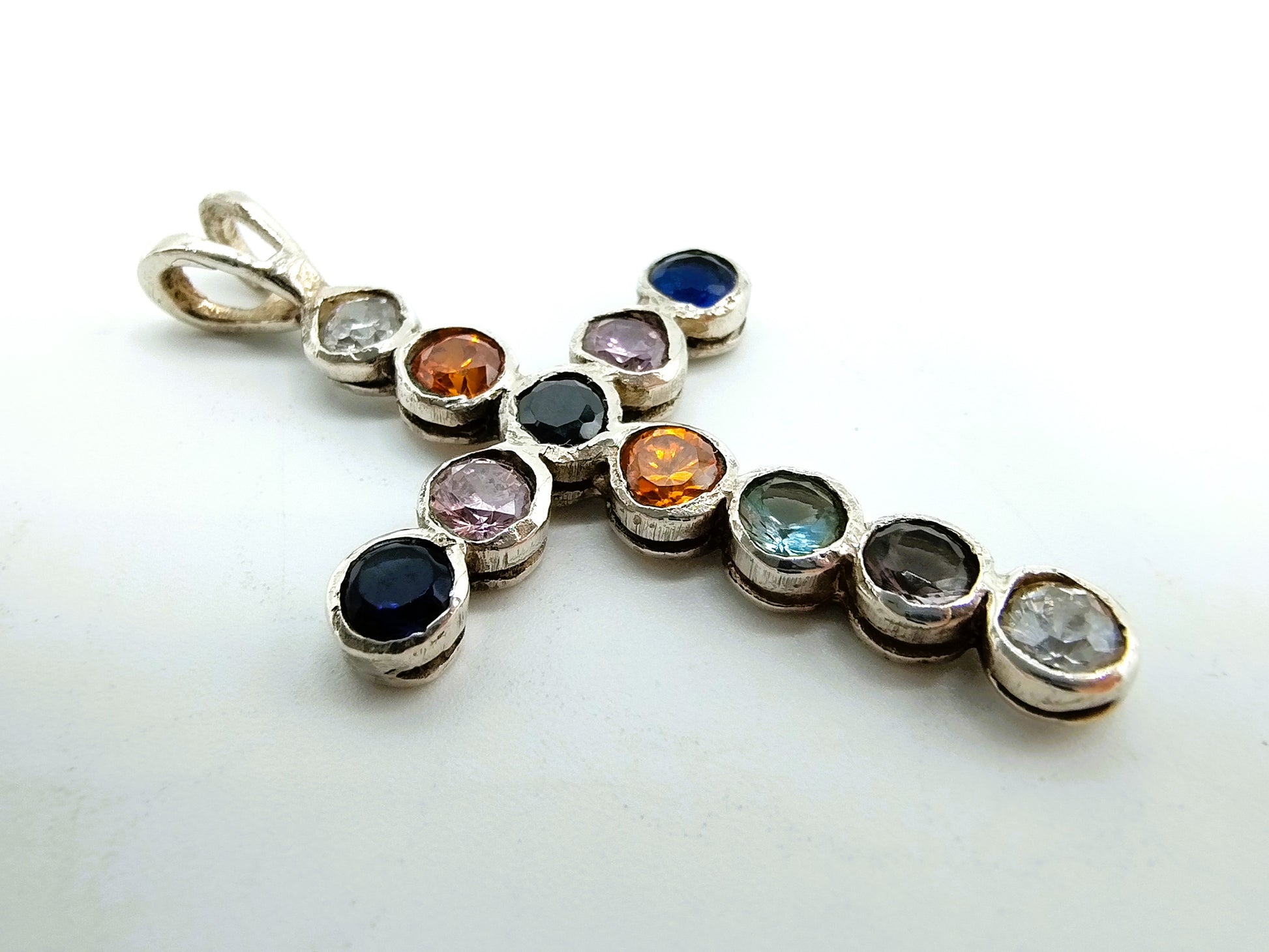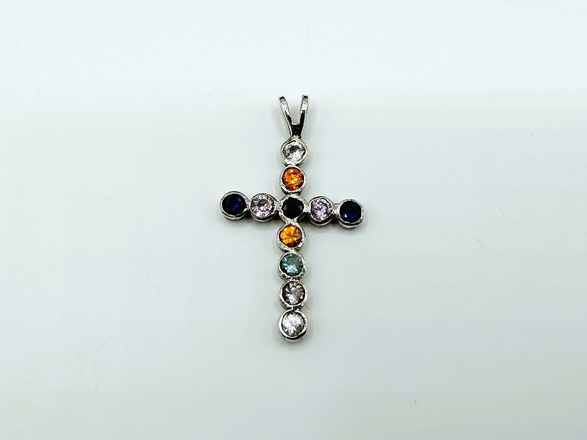 Silberner Kreuzanhänger mit farbigen Steinen im Brillantschliff in dichter Fassung.