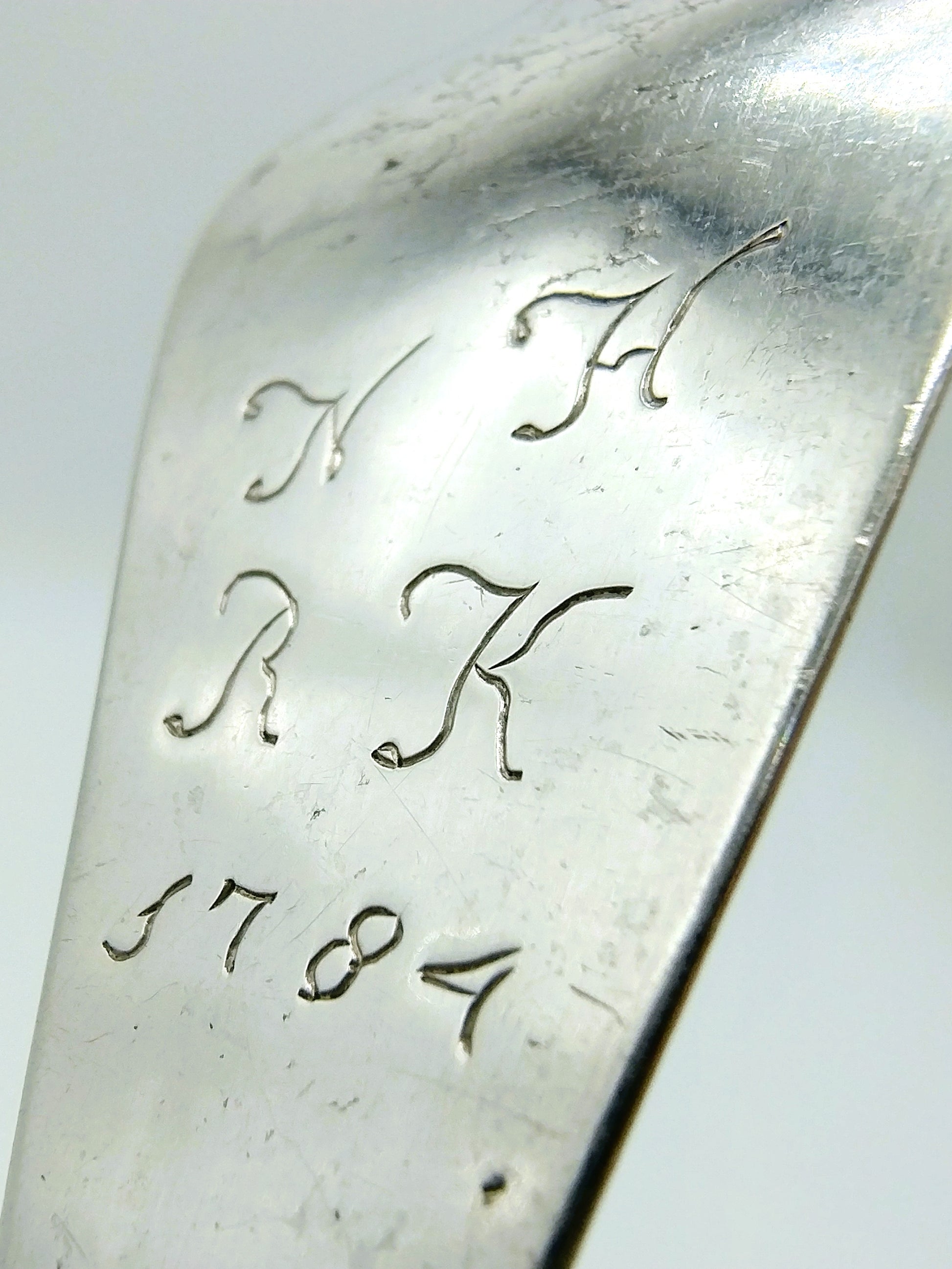 Der Löffel trägt auf der Rückseite die Inschrift: NHRK 1784.