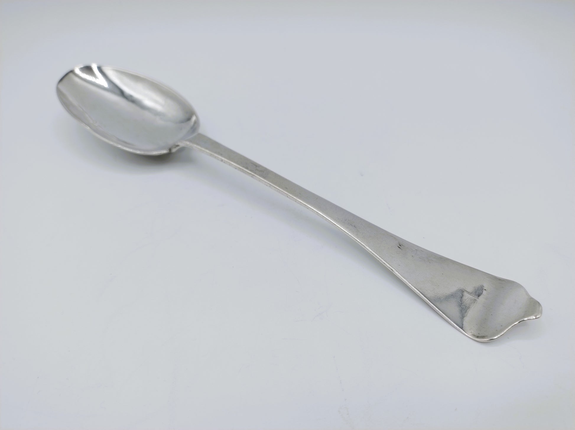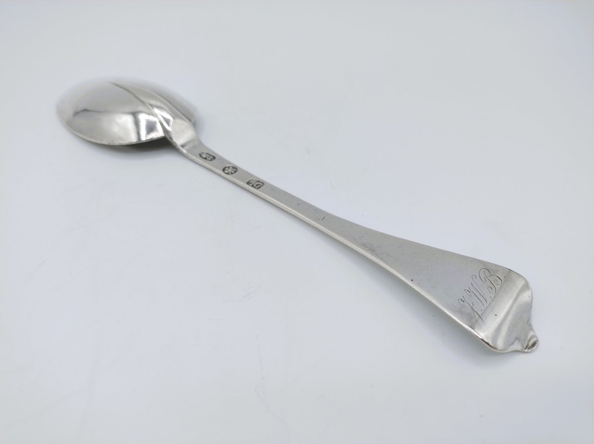 Silberner Löffel mit klammerförmigem Stielende, hergestellt von Willem Scholten aus Deventer. Er arbeitete von 1776 bis 1809.