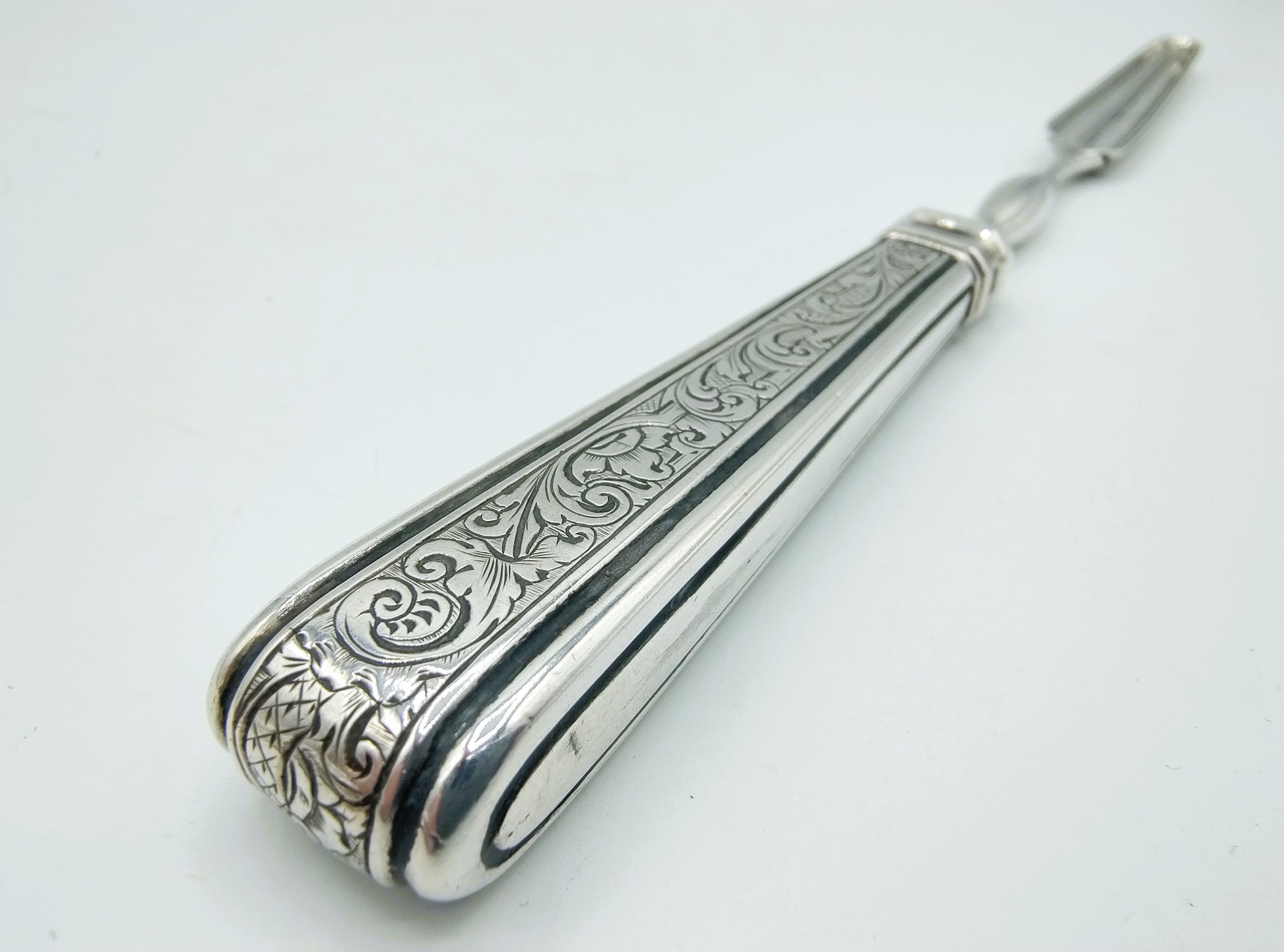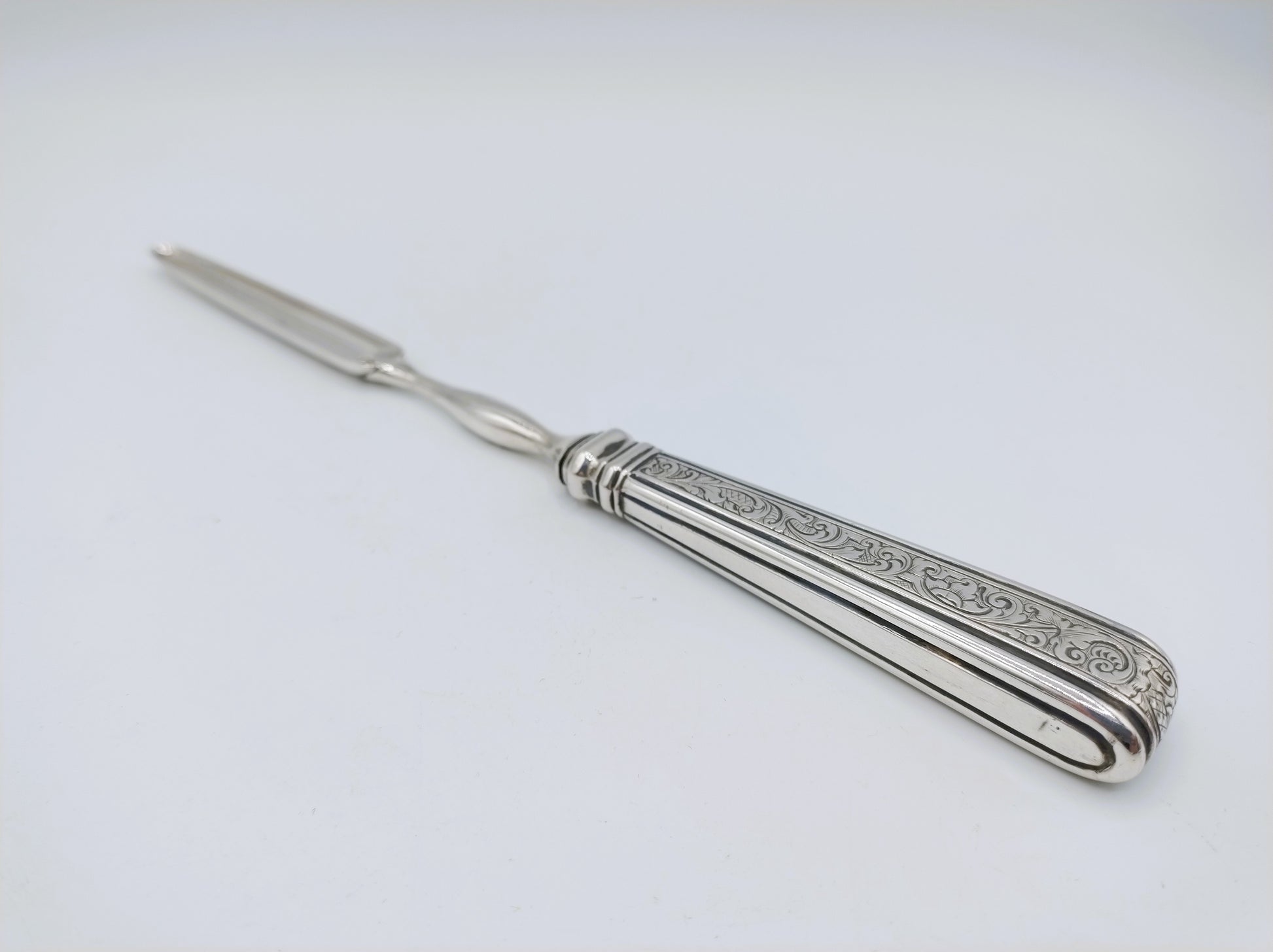 Der Markbohrer hat einen reich verzierten Griff mit Schnörkelmotiven. Der Griff ist mit dem Schwert für Silber 2. Klasse gepunzt.