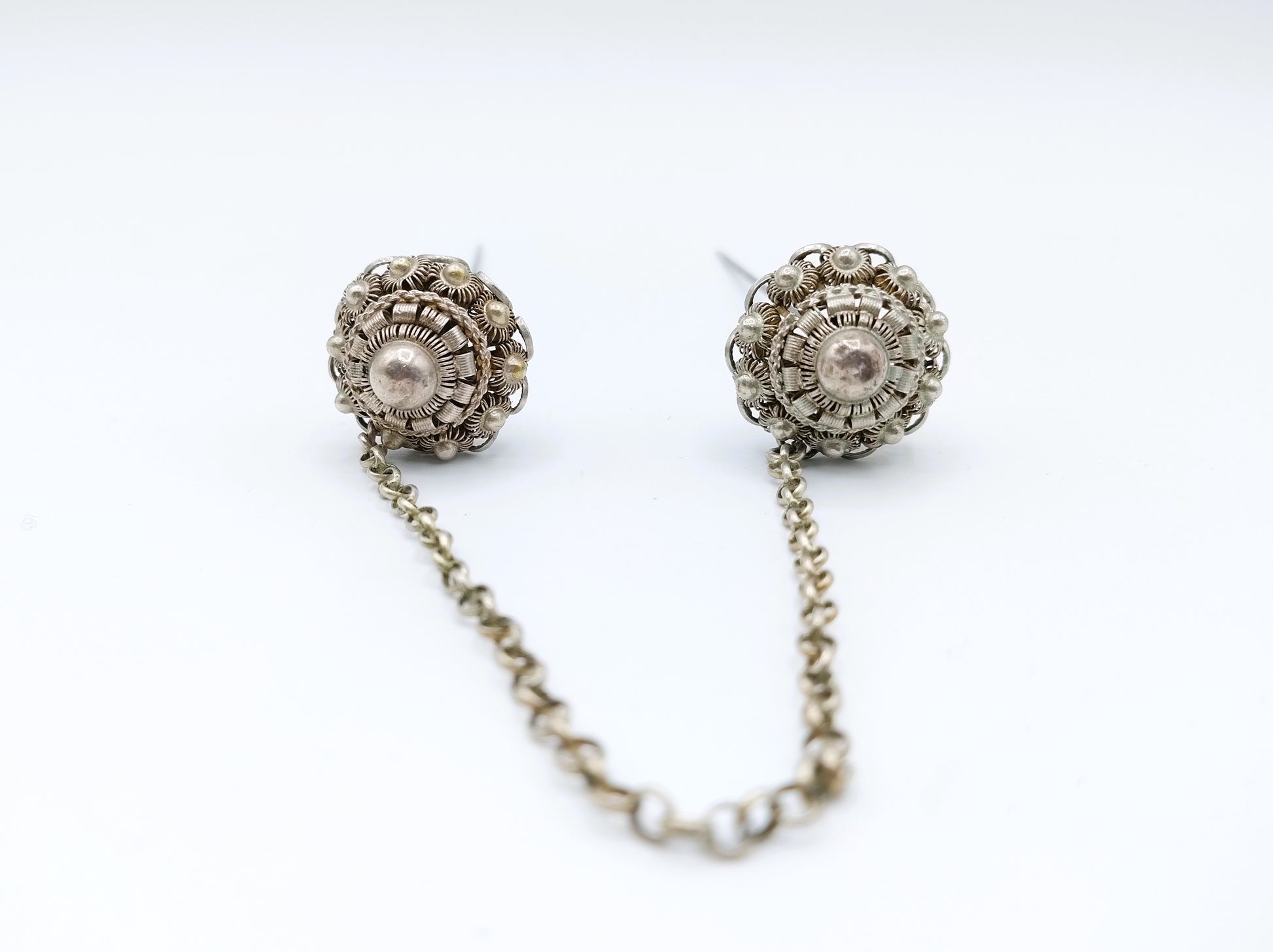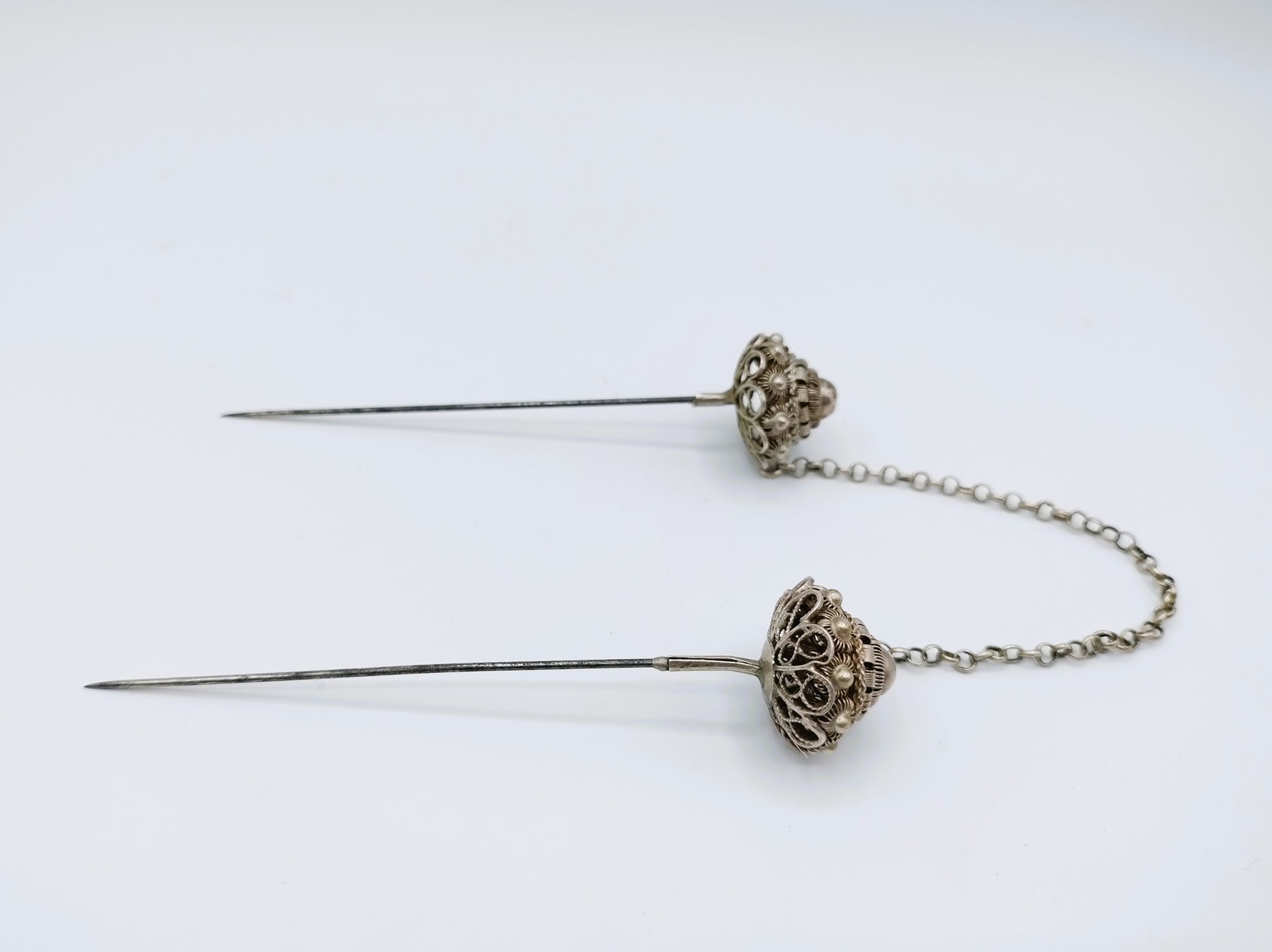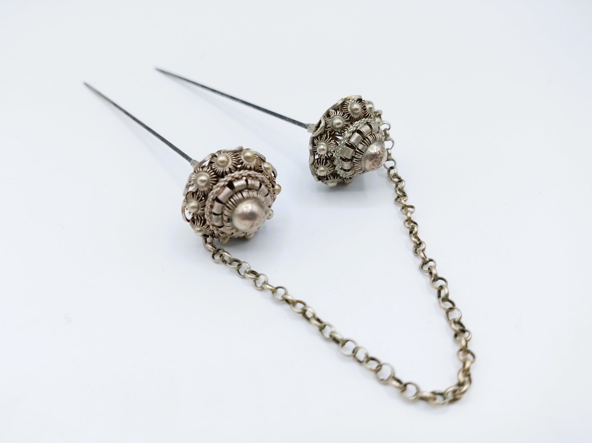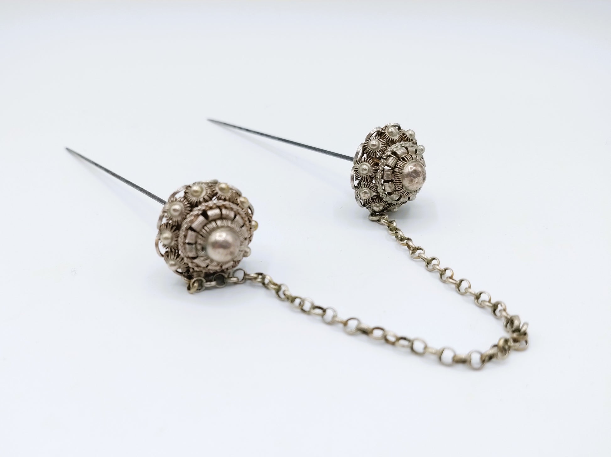 Silberne Hutnadeln mit einem Zeeland-Knopf, verbunden mit einer Jasseron-Kette.