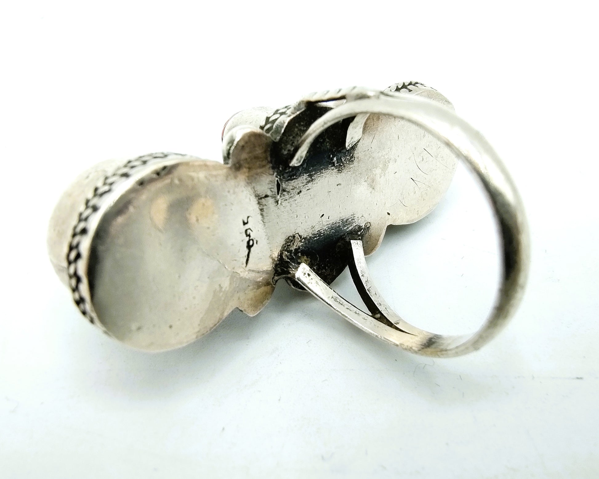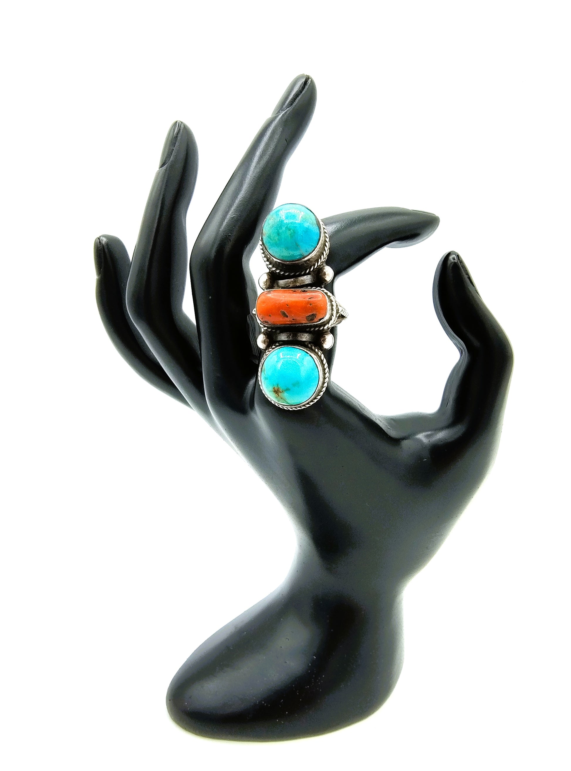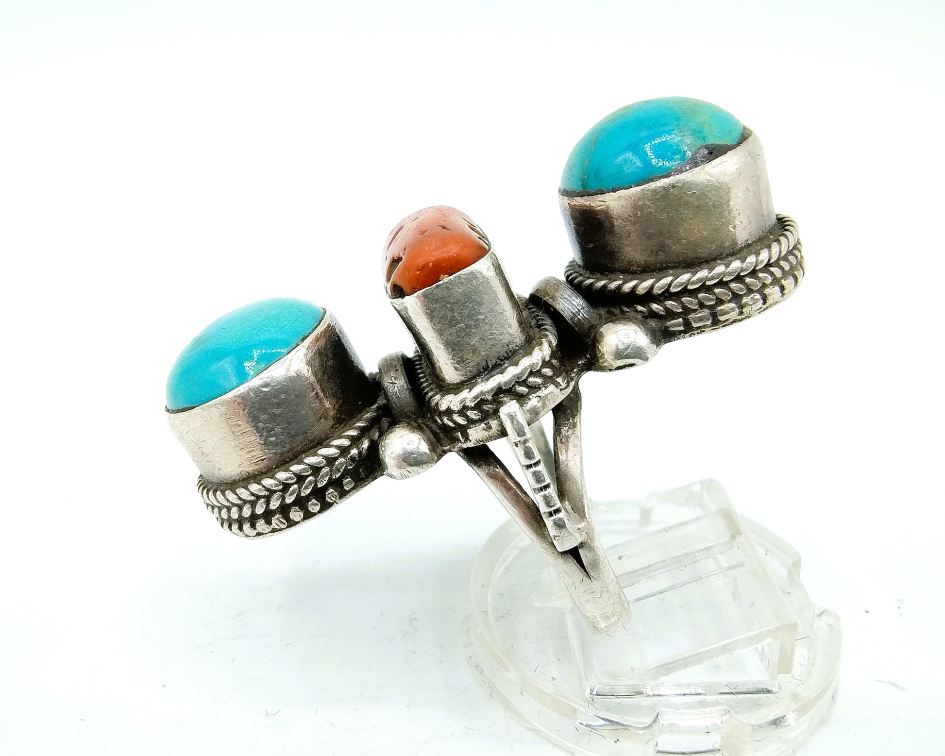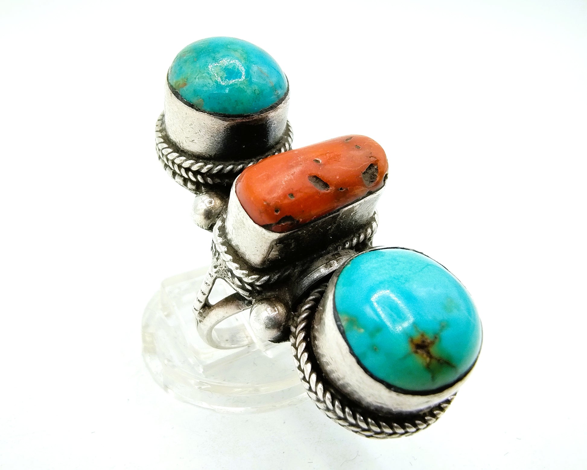 Silberner Navajo-Ring mit Koralle und Türkis, 19 mm.