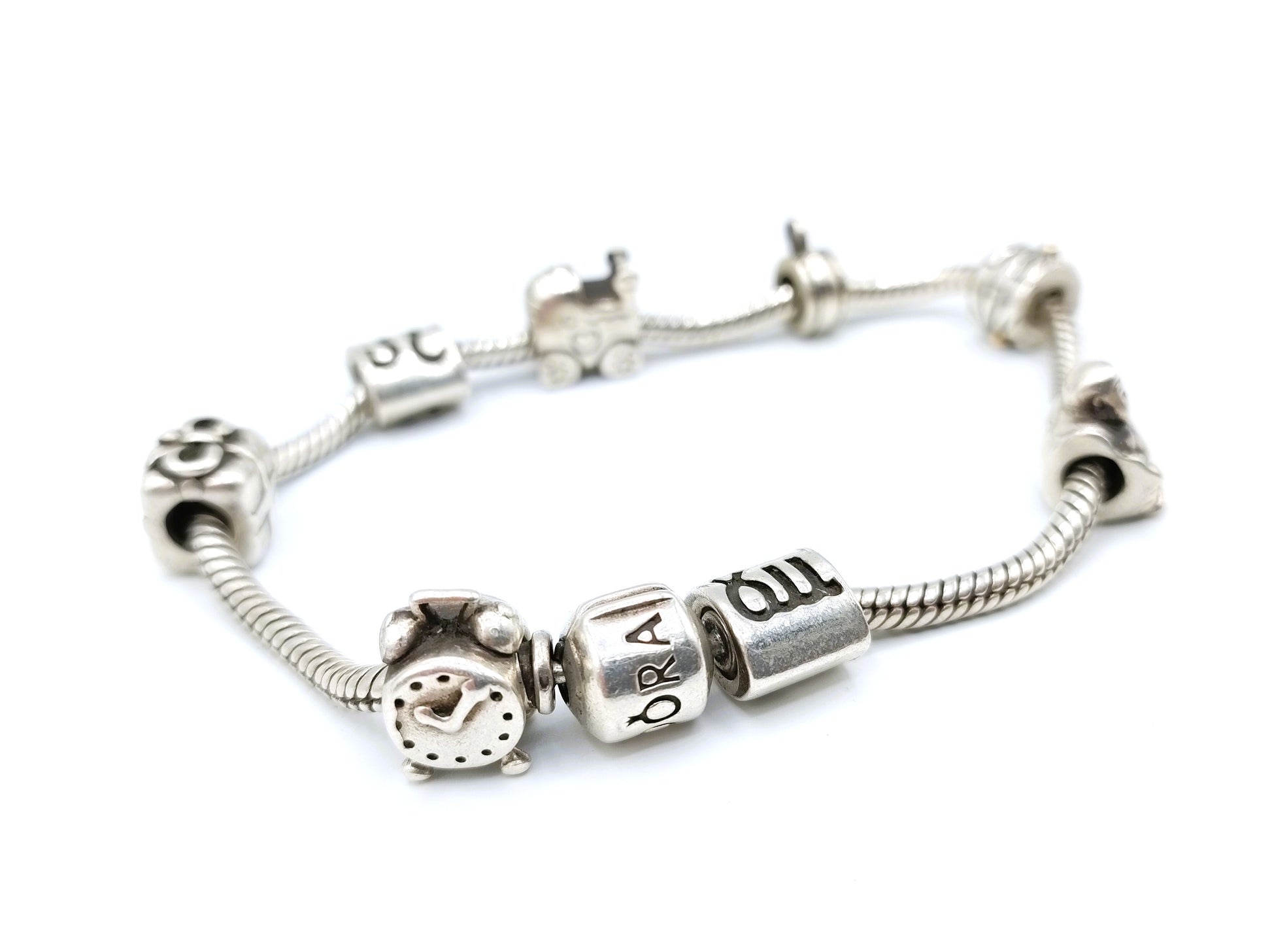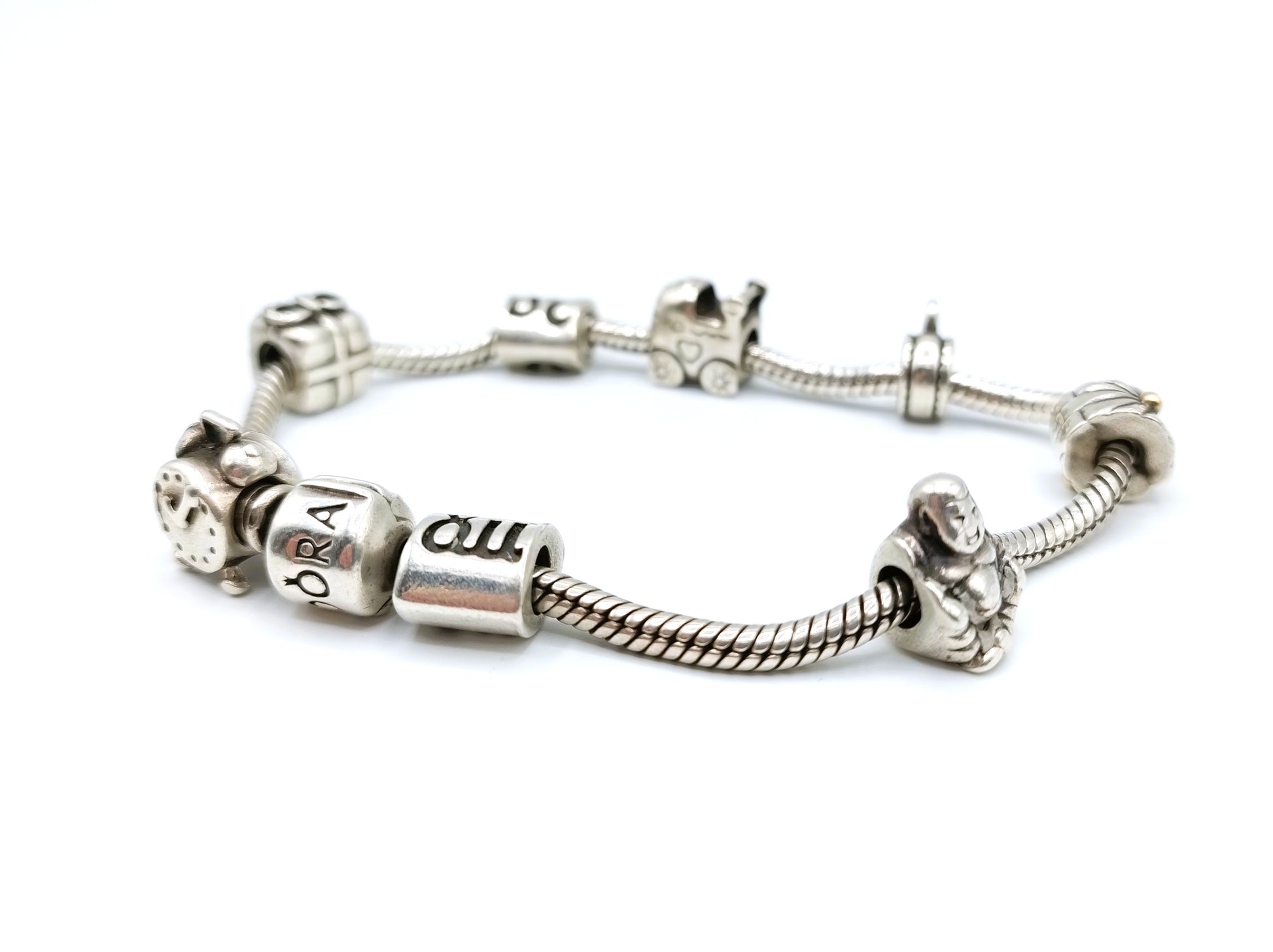 Das Armband hat 8 Charms und einen Verschluss mit der Aufschrift „Pandora“.