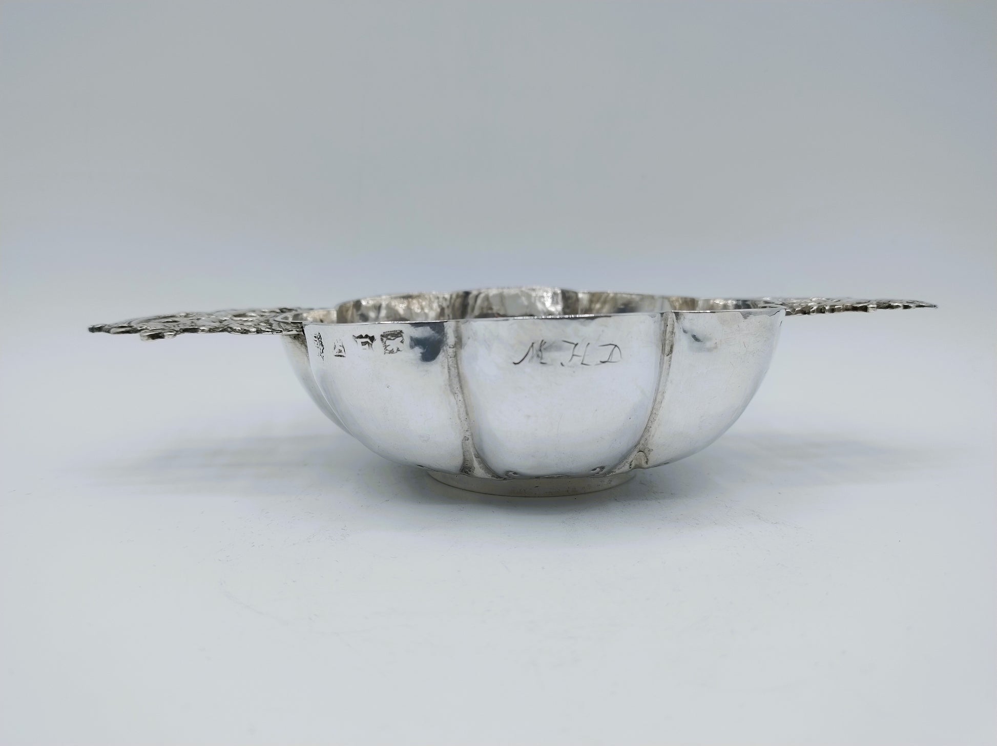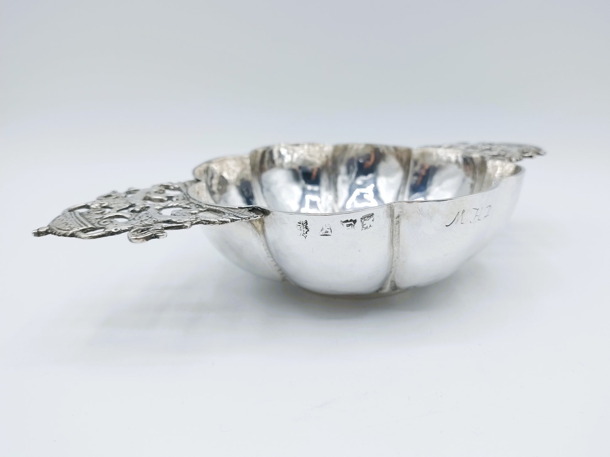Die Breischale trägt die halb sichtbare Delfter Stadtpunze, den Jahresbuchstaben E von 1734 und eine Meistermarke, die einen springenden Hund nach links zeigt. Jan Kruisweg besaß eine solche Punze, von der Biesboer, Delft Silver (S. 104), mindestens fünf Varianten gefunden hat. Schließlich ist sie mit dem Feingehaltszeichen 934/1000 punziert.