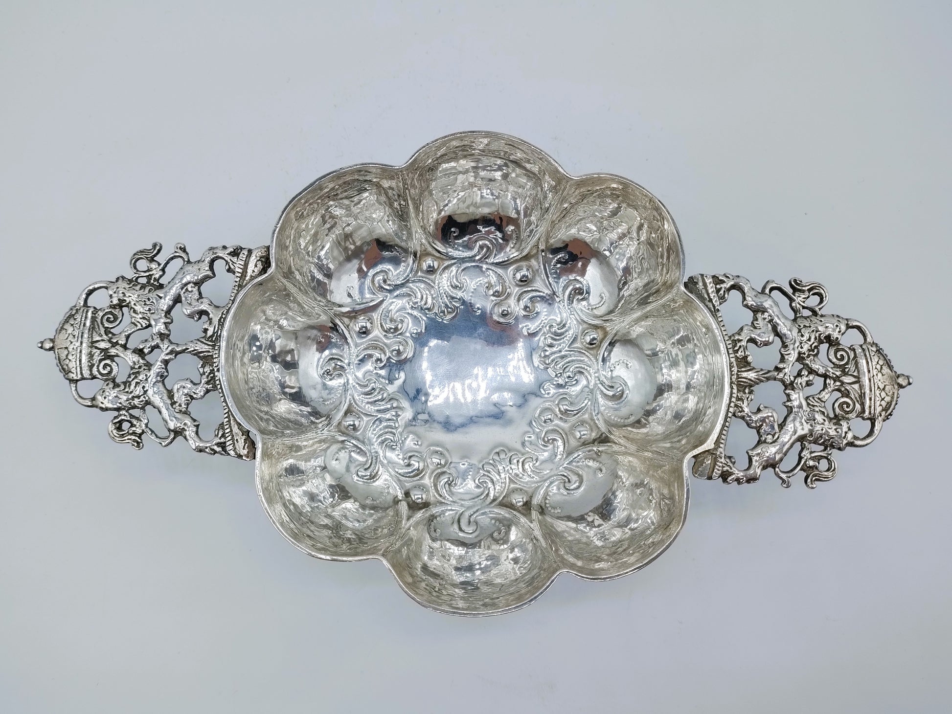Eine museale , geprägte silberne Breischüssel mit Henkeln in Form von kronentragenden Löwen, vermutlich hergestellt vom Silberschmied Jan Kruisweg aus Delft. Er arbeitete bis 1735.