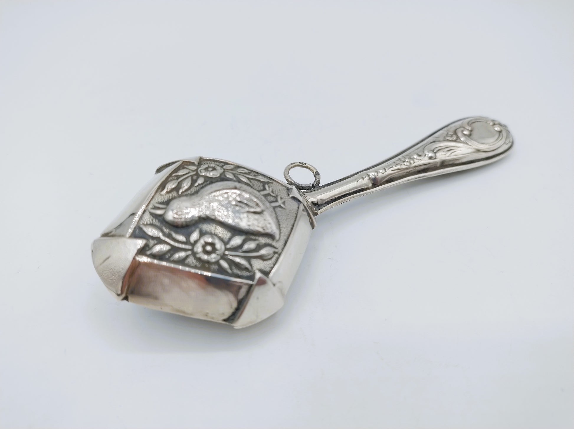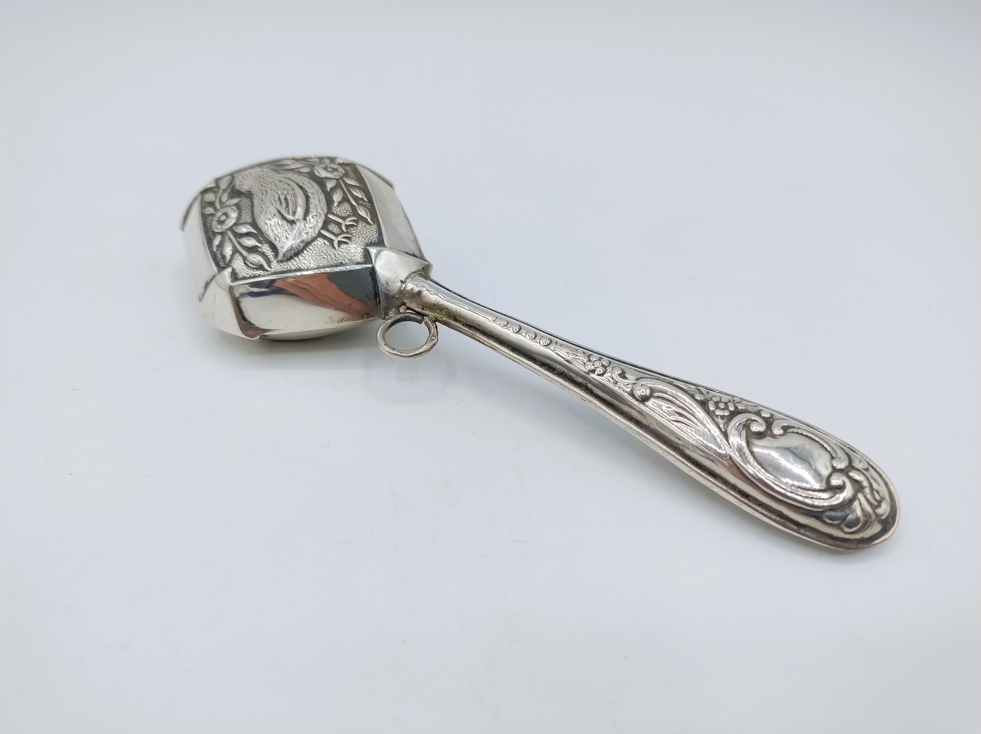 Die Rassel ist auf beiden Seiten mit einem Vogel und Blumen verziert.