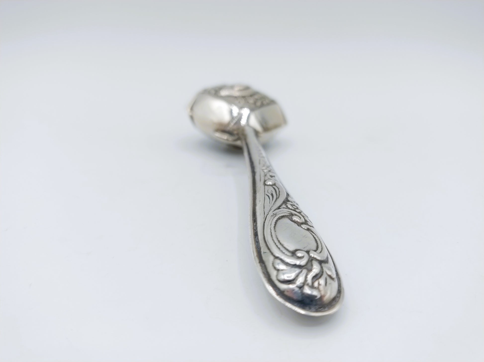 Die Rassel ist mit 833 und Z 11 für Silber zweiter Güteklasse gepunzt. Zusätzlich ist sie mit der Meistermarke A und einer schwer zu entziffernden Silberpunze versehen.