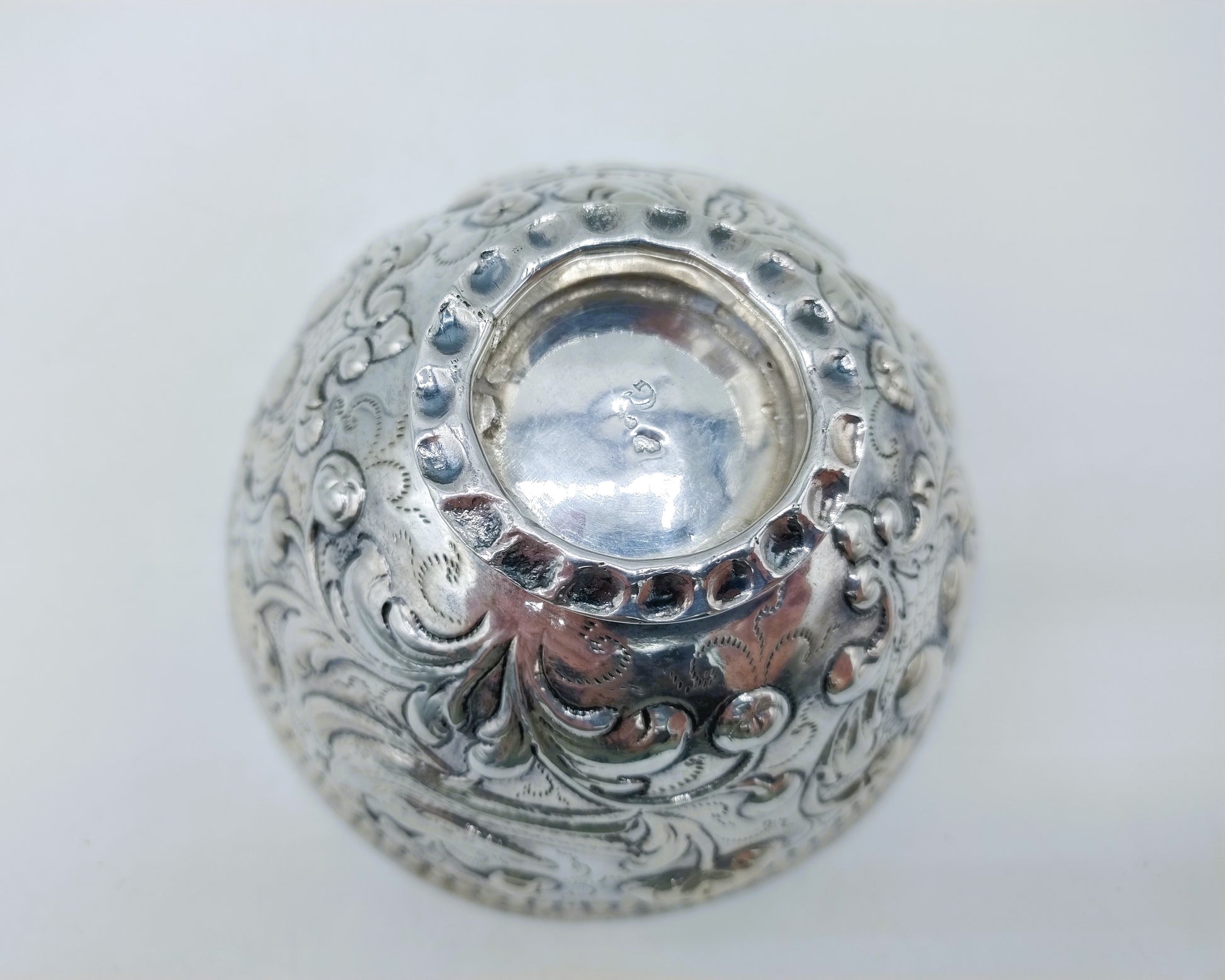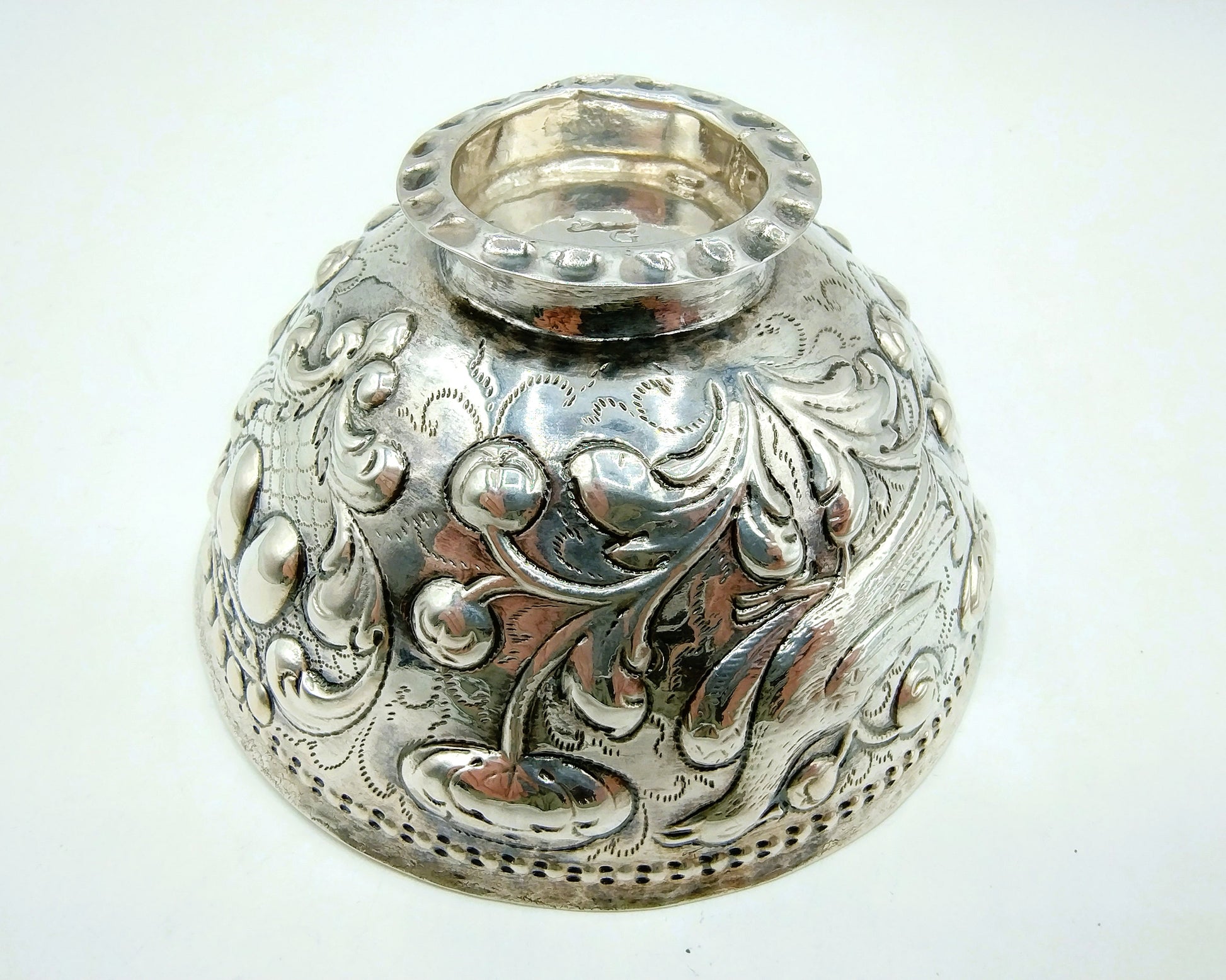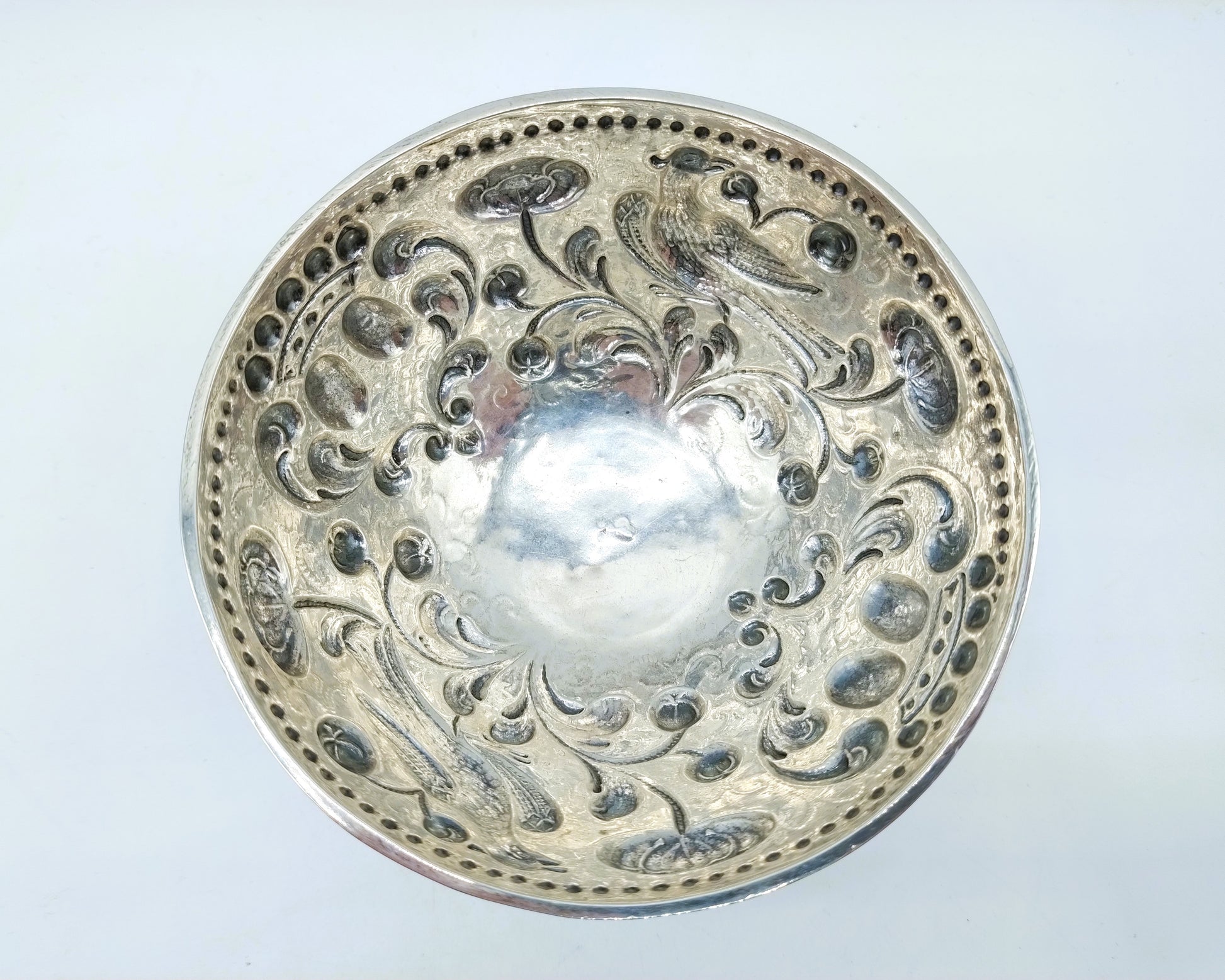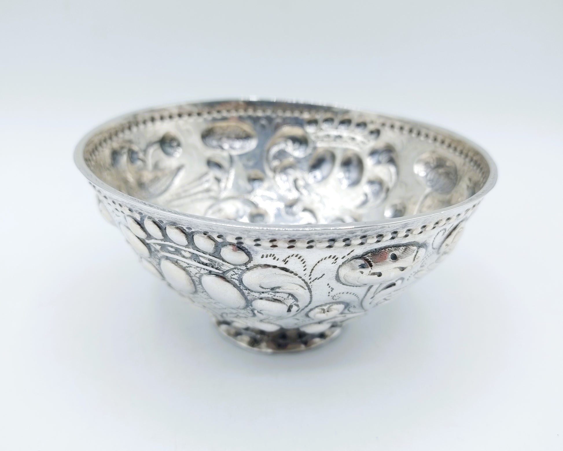 Die Schale ist mit einem wunderschön gemeißelten Schnörkelmotiv und Vögeln verziert.