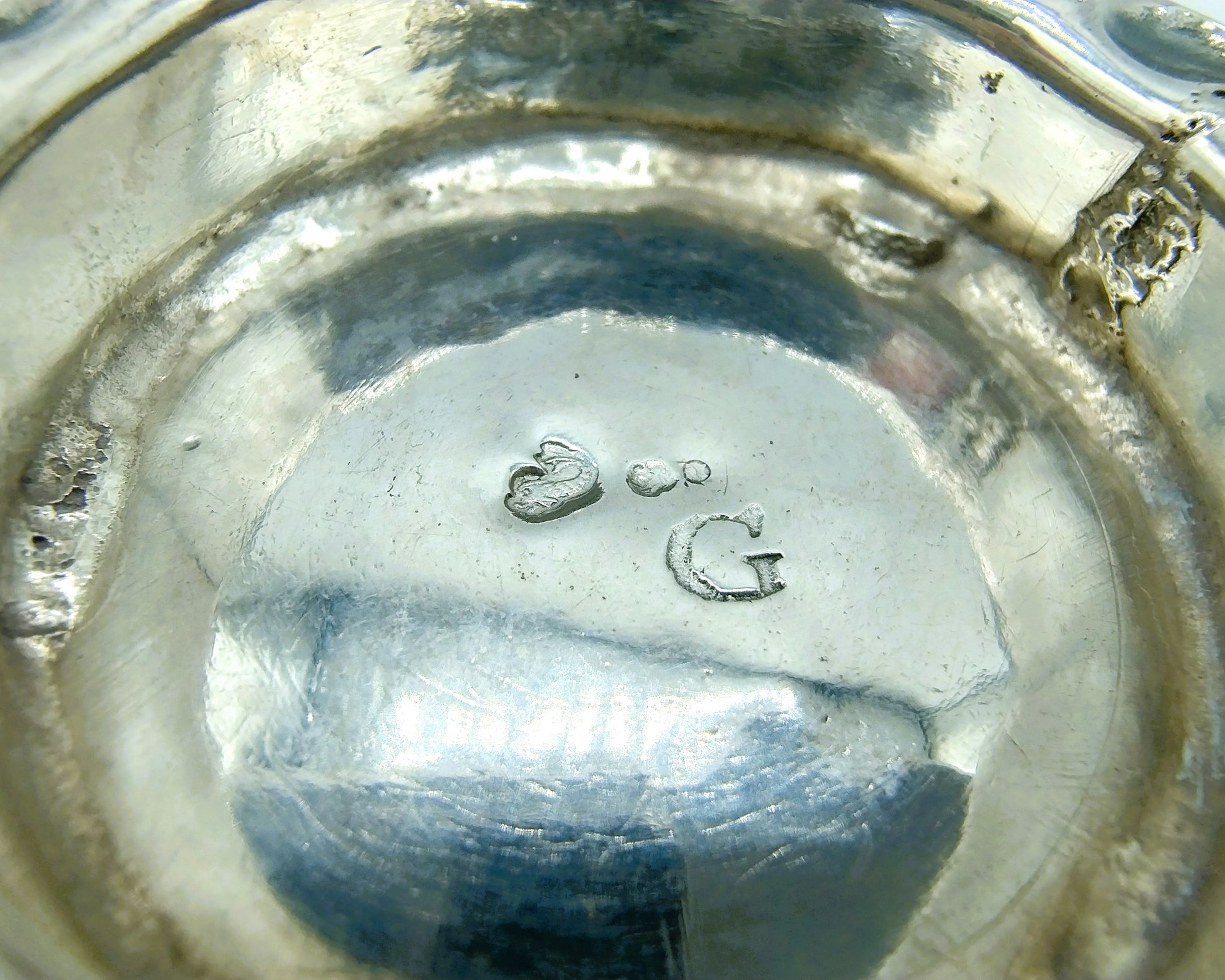 Die Schale ist mit verschiedenen Punzen versehen, dem Buchstaben G, dem Steuerpunzen-Delfin (1859), dem Steuerpunzen-Stern und dem schwer lesbaren Steuerpunzen. Datierung wahrscheinlich Anfang des 19. Jahrhunderts, Ende des 18. Jahrhunderts.