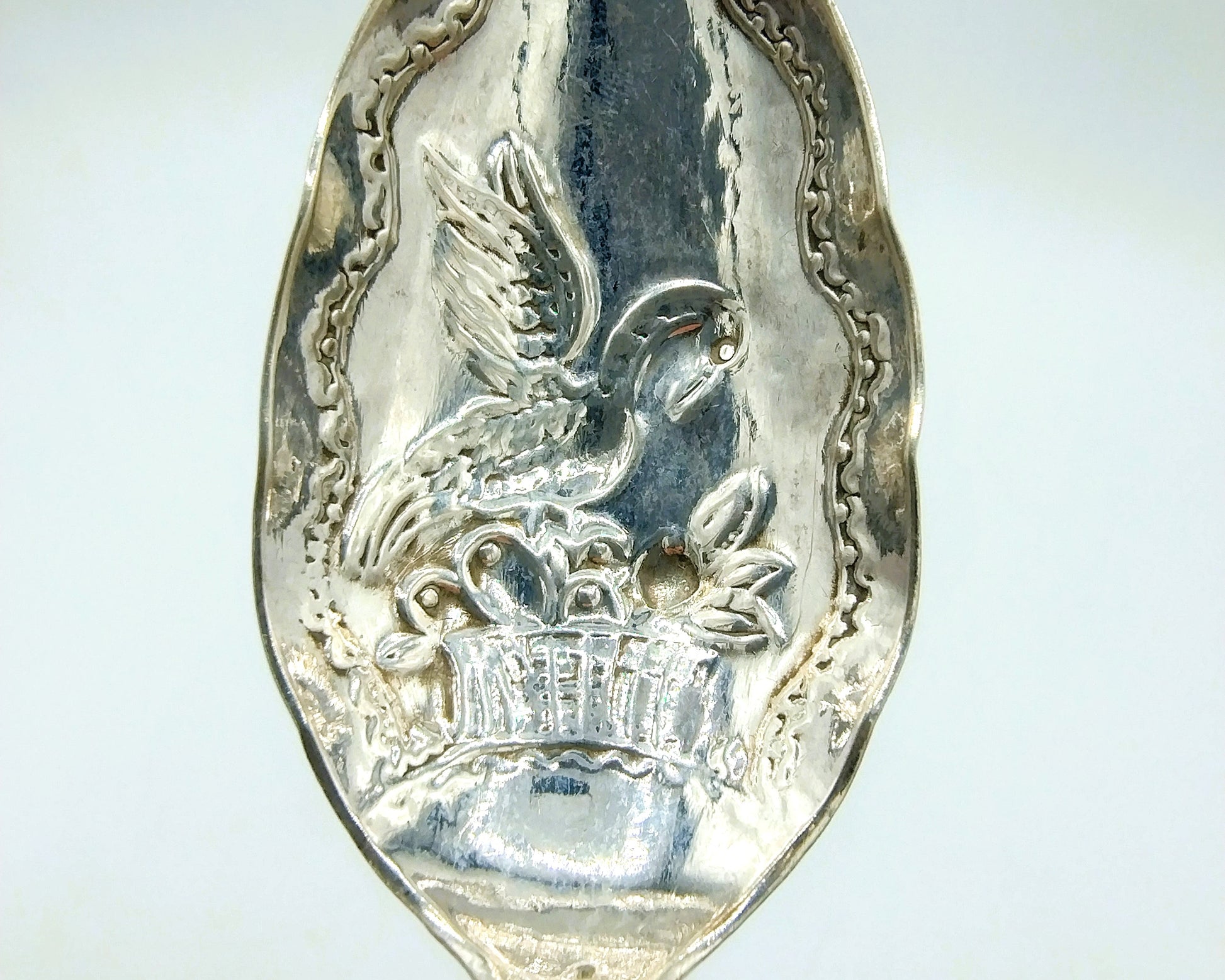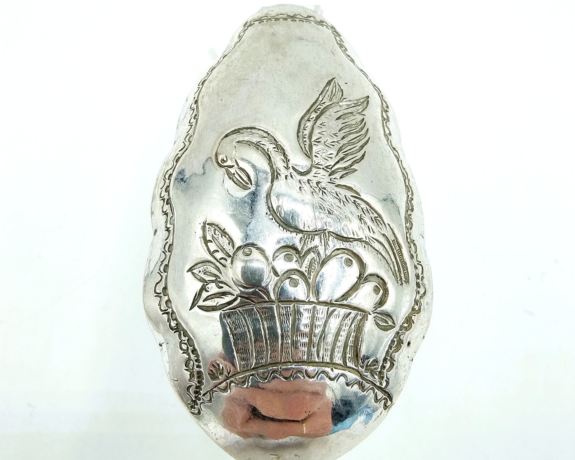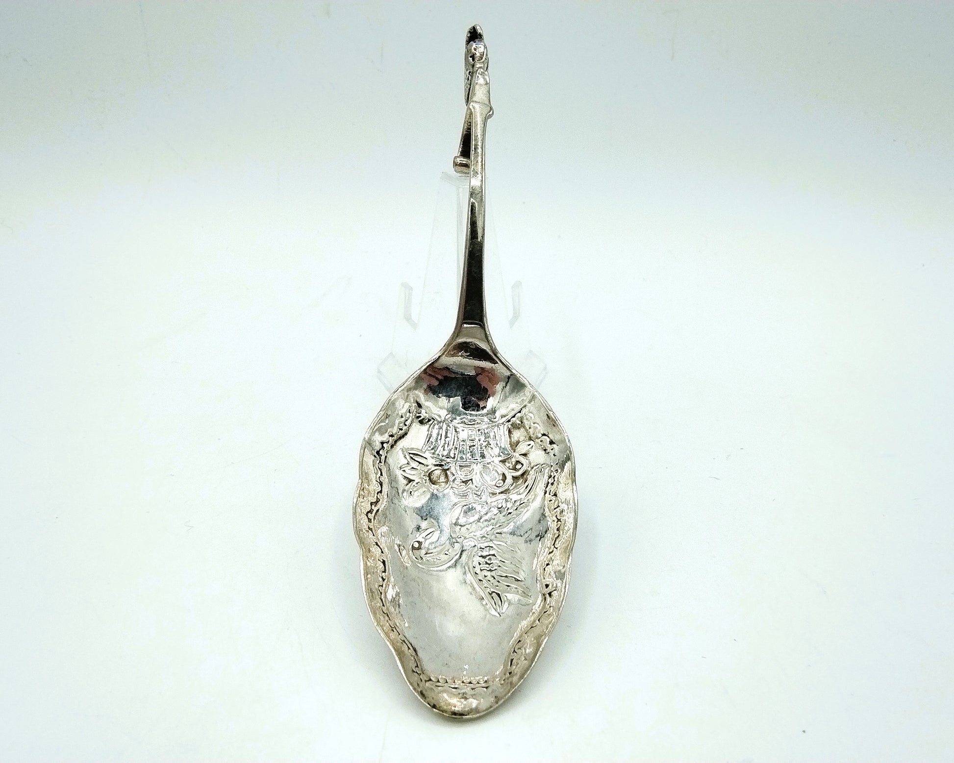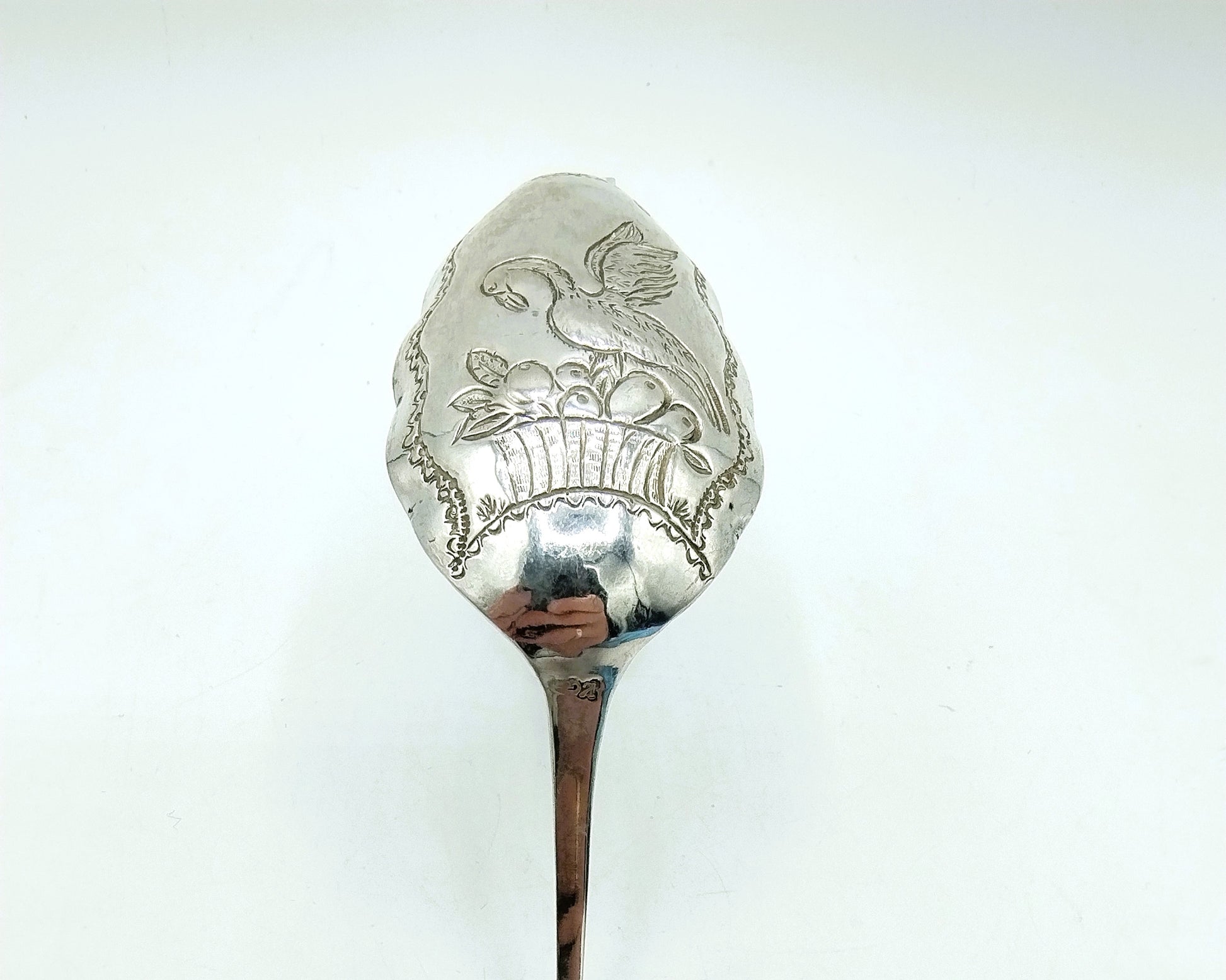Der Sahnelöffel ist mit einem Schwan gekrönt. Außerdem ist im Becken ein Schwan über einem Obstkorb abgebildet.