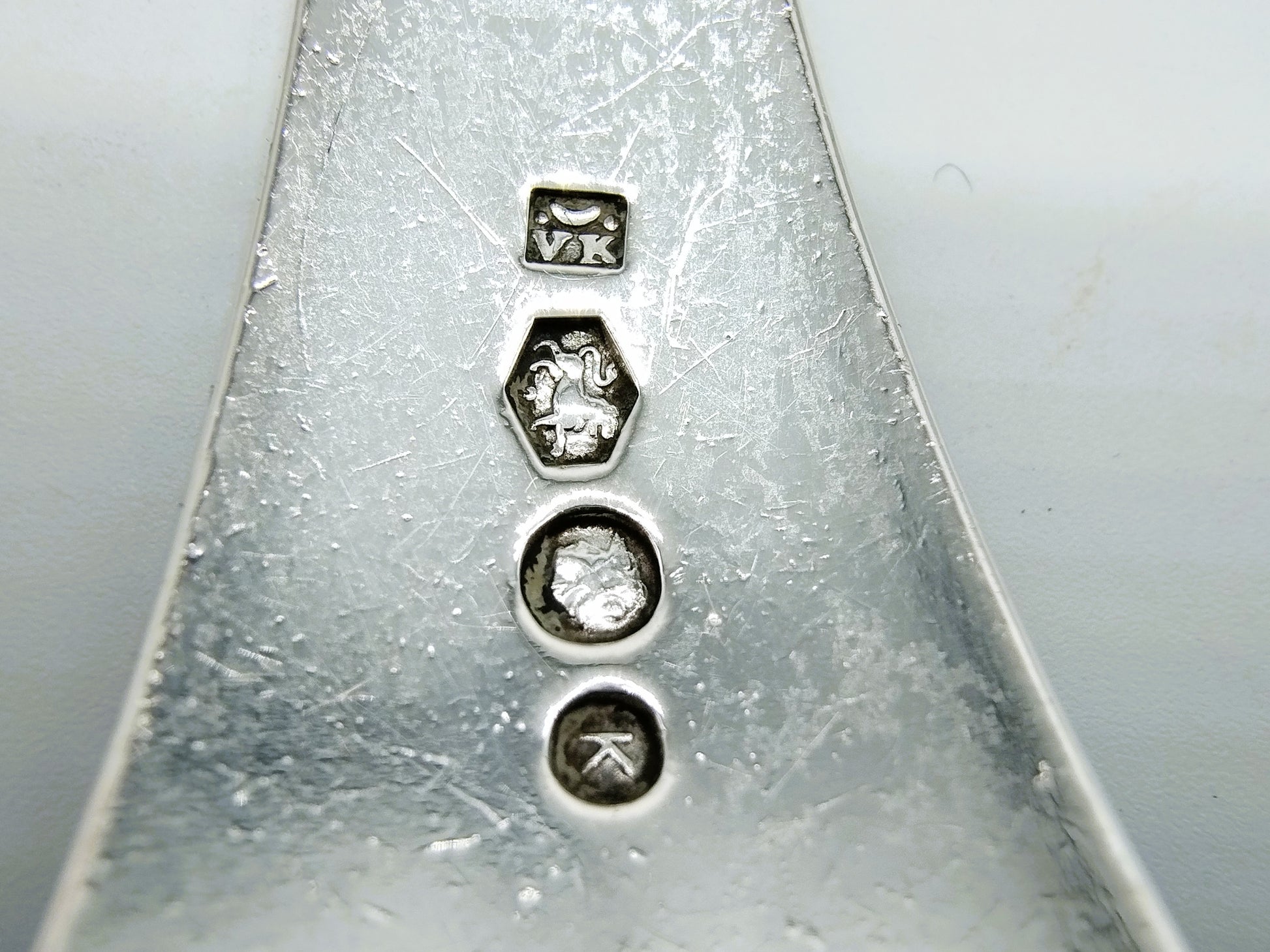 Der Löffel ist mit der Meisterpunze VK Halbmond, der zweiten Punze, dem Minerva-Kopf und dem Jahresbuchstaben K für 1920 gepunzt.