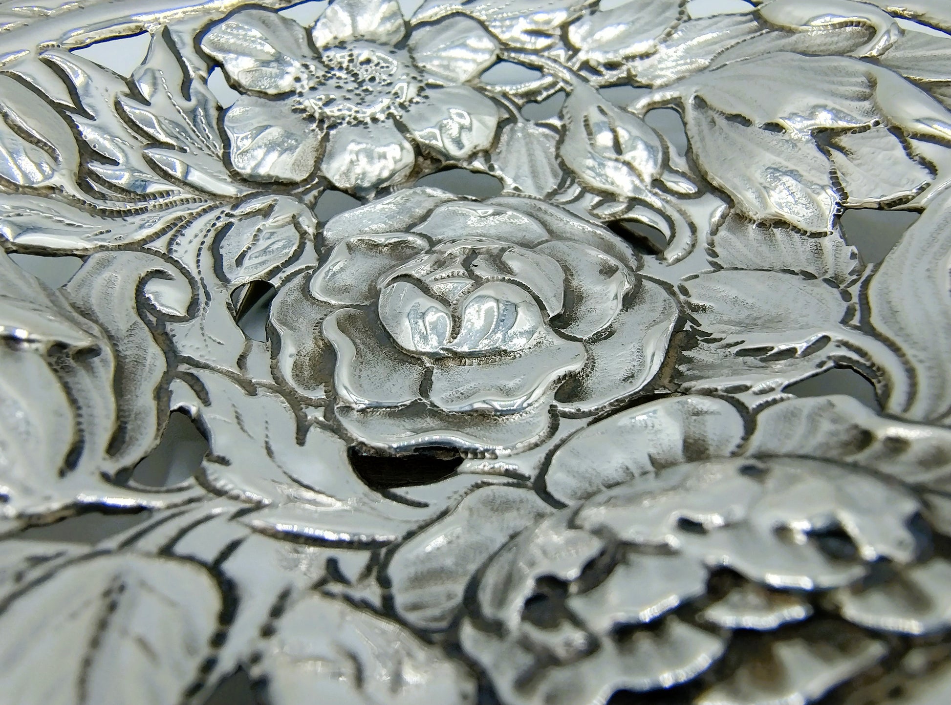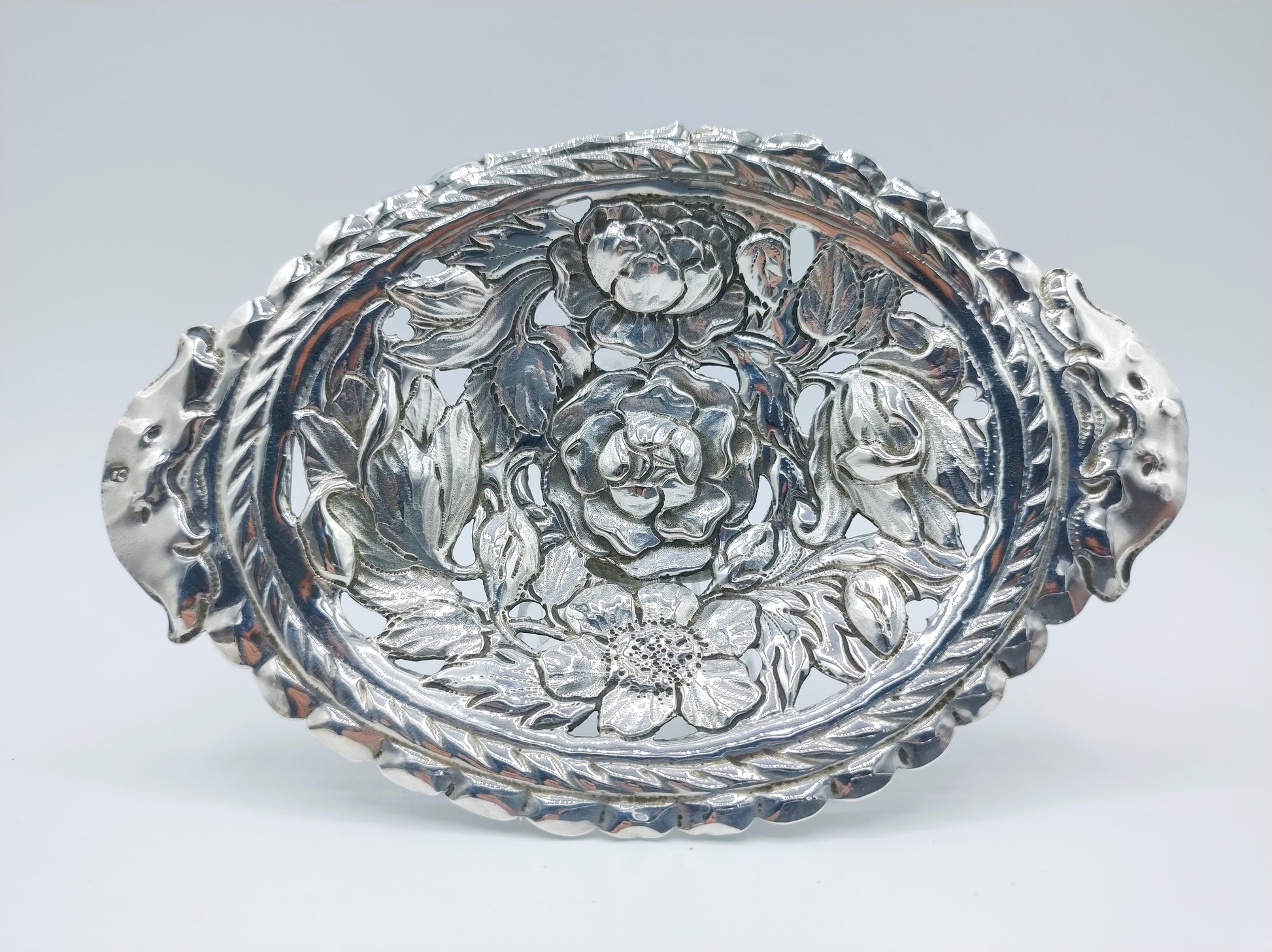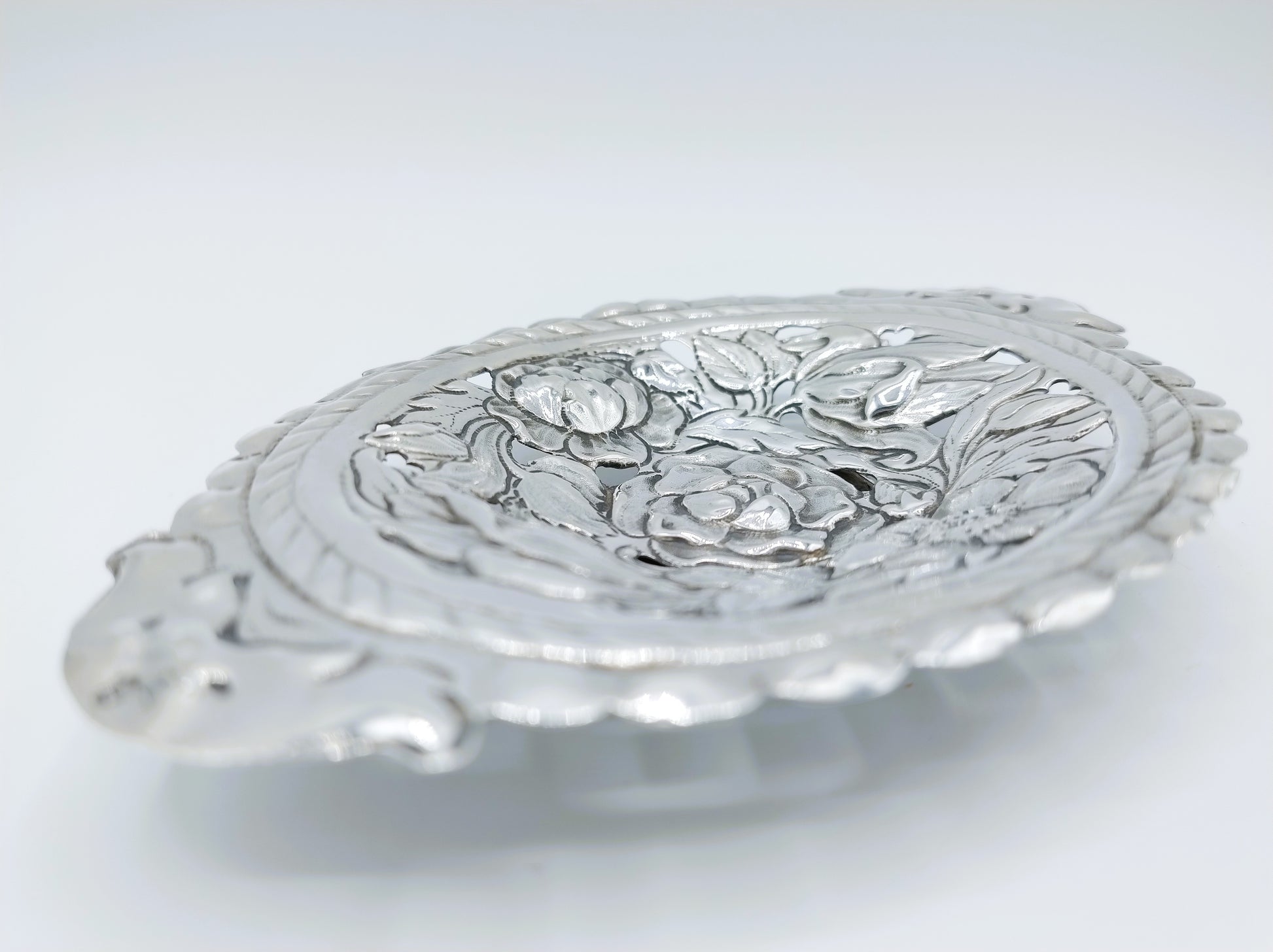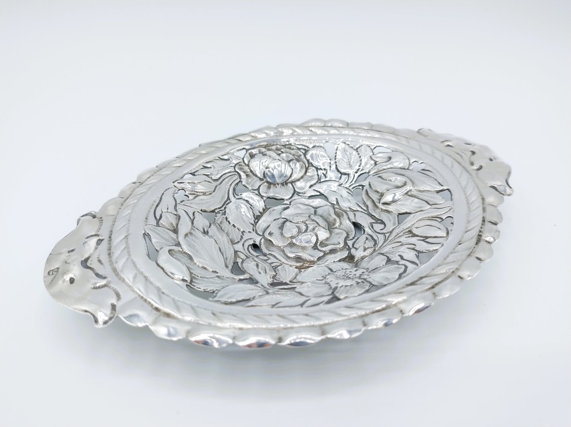 Silberschale mit floralem Dekor. Die Schale stammt aus Utrecht und wurde vom Silberschmied Joan Both gefertigt, der ab 1710 tätig war.