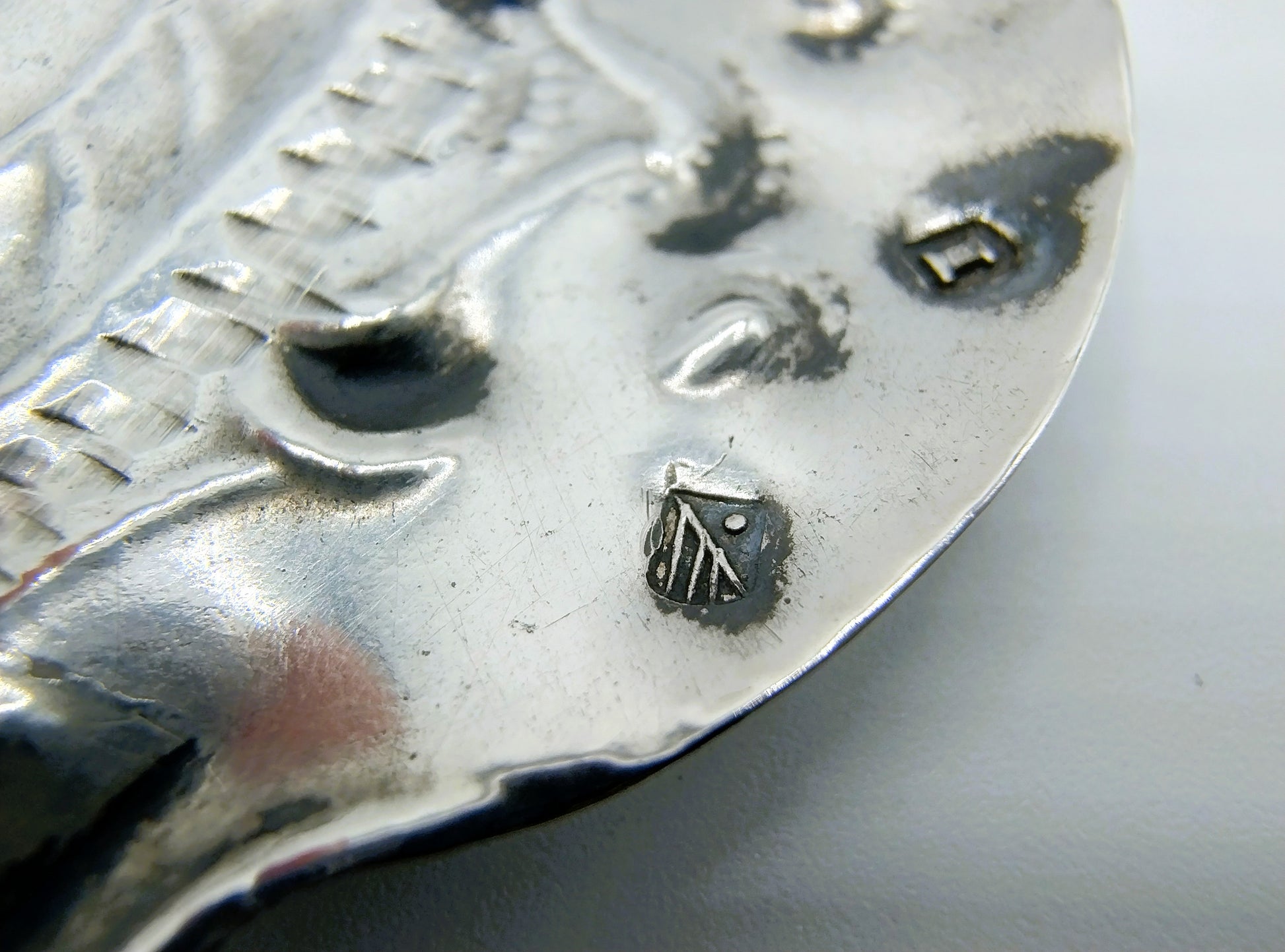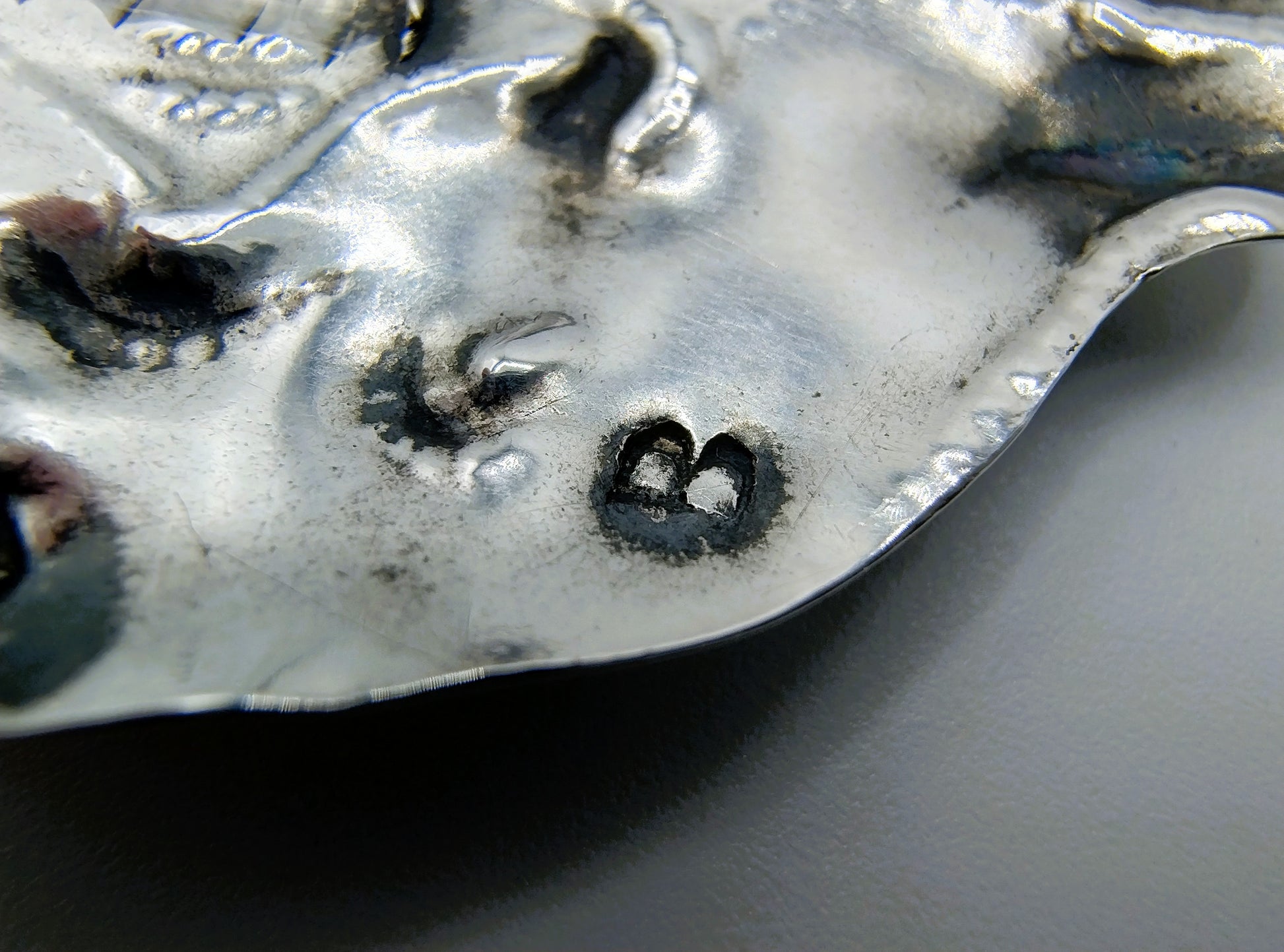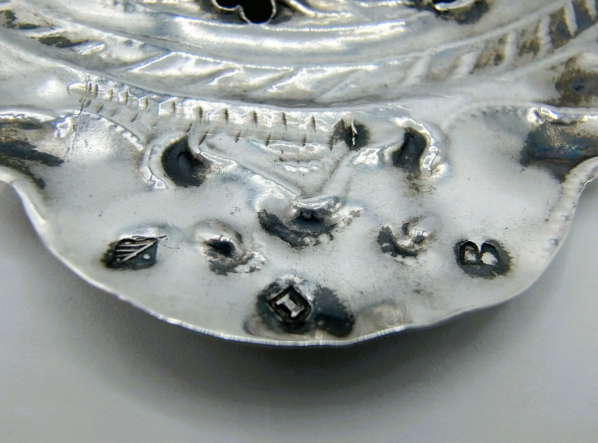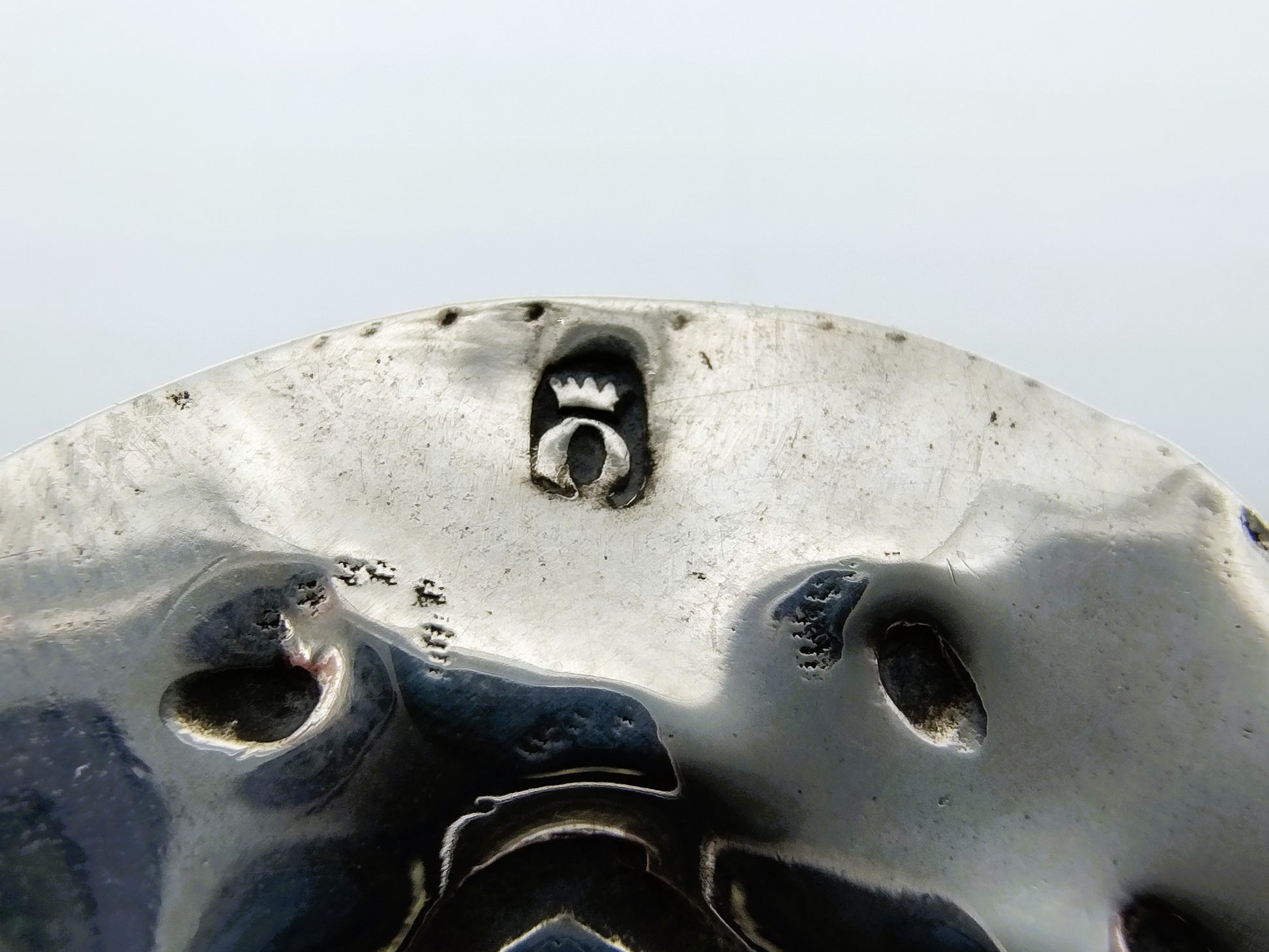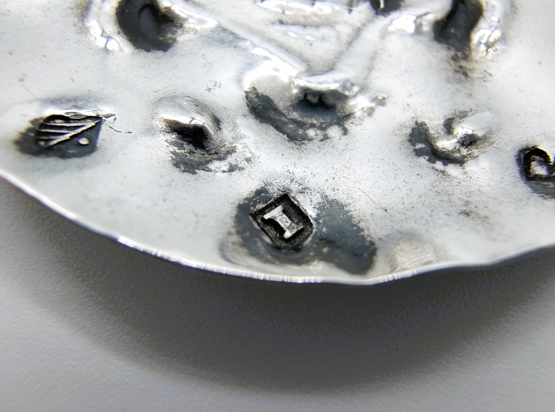 Gemarkt mit der Stadtmarke von Utrecht, Jahresbuchstabe i für 1720 und Meistermarke B (Meistermarke 283 B, Seite 50 Marken der Utrechter Goldschmiede 1598 - 1740). Des Weiteren ist die Schale mit einem Prüfstrich versehen, um den Silbergehalt zu prüfen. Abschließend wird das gekrönte O dekliniert.