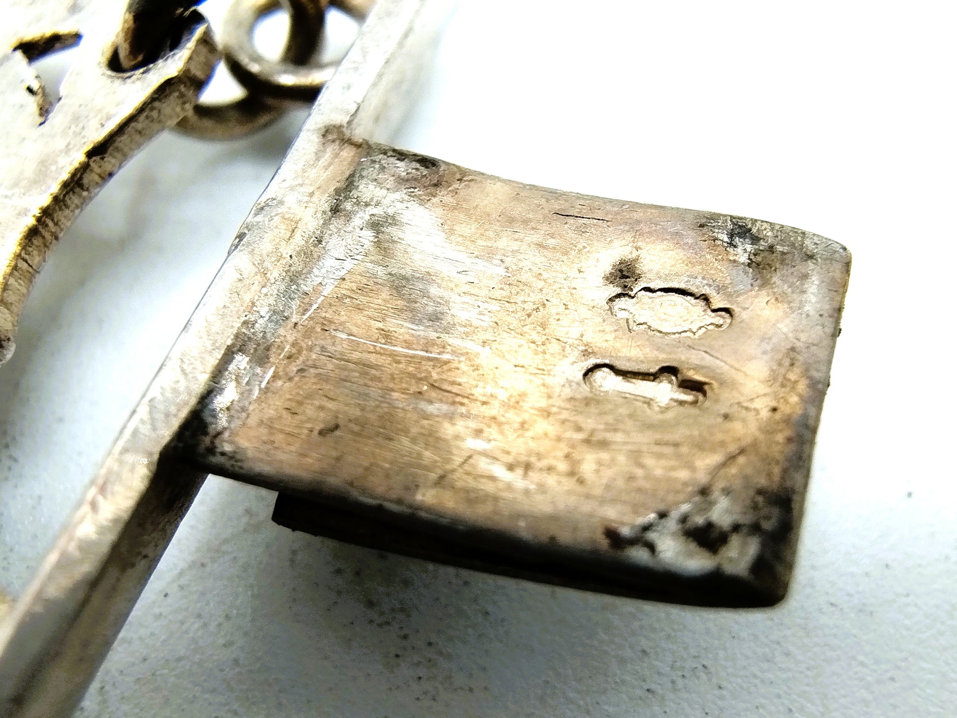 Das Schloss ist mit dem Schwert für Silber zweiter Güteklasse punziert. Am Schloss ist eine Sicherheitskette angebracht, um Verluste zu verhindern.