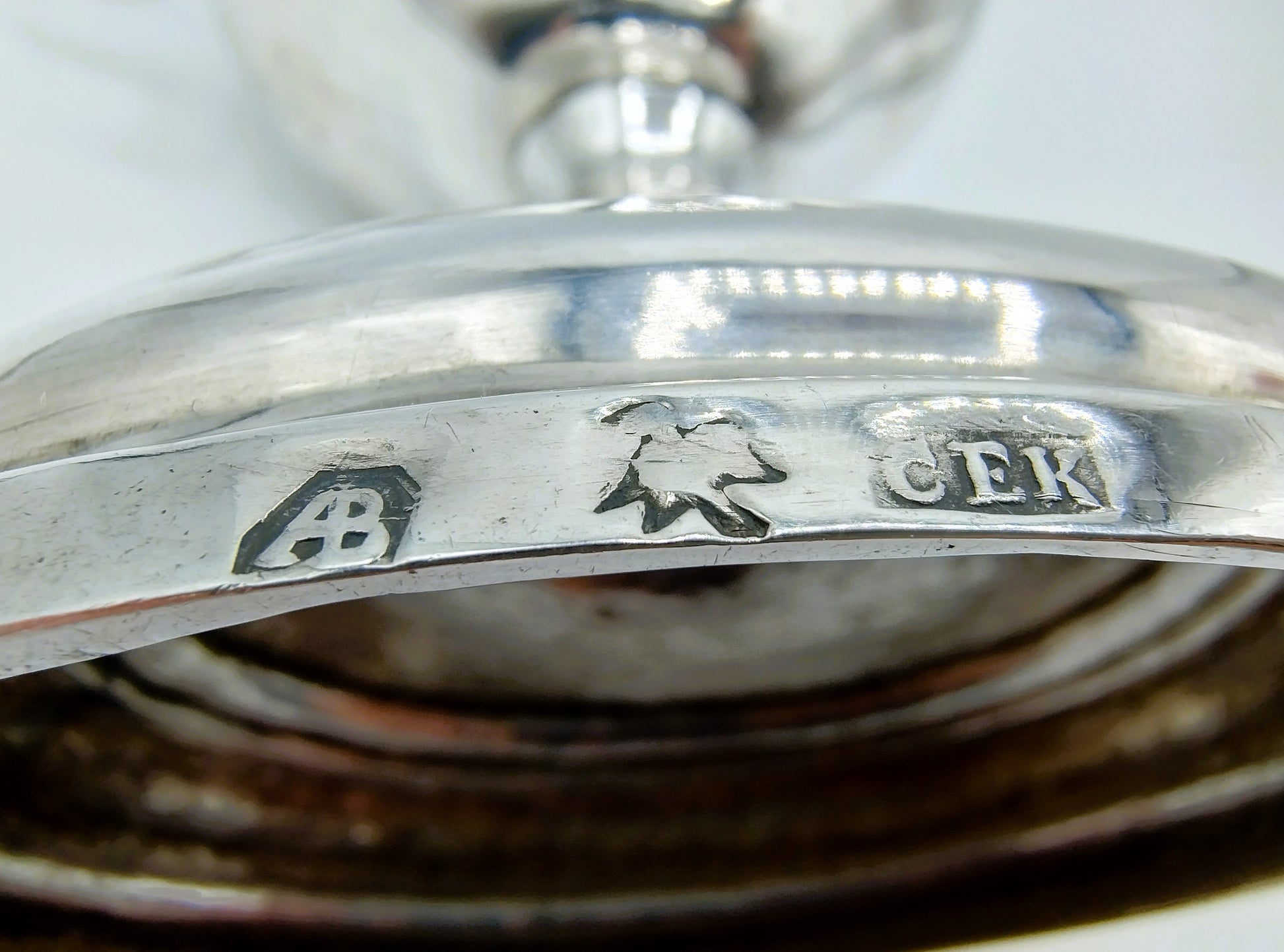 Die Kanne ist mit dem Stadtpunzenzeichen AB von Arensburg, dem Storch aus dem Stadtwappen und der Meisterpunzenmarke CEK gepunzt.