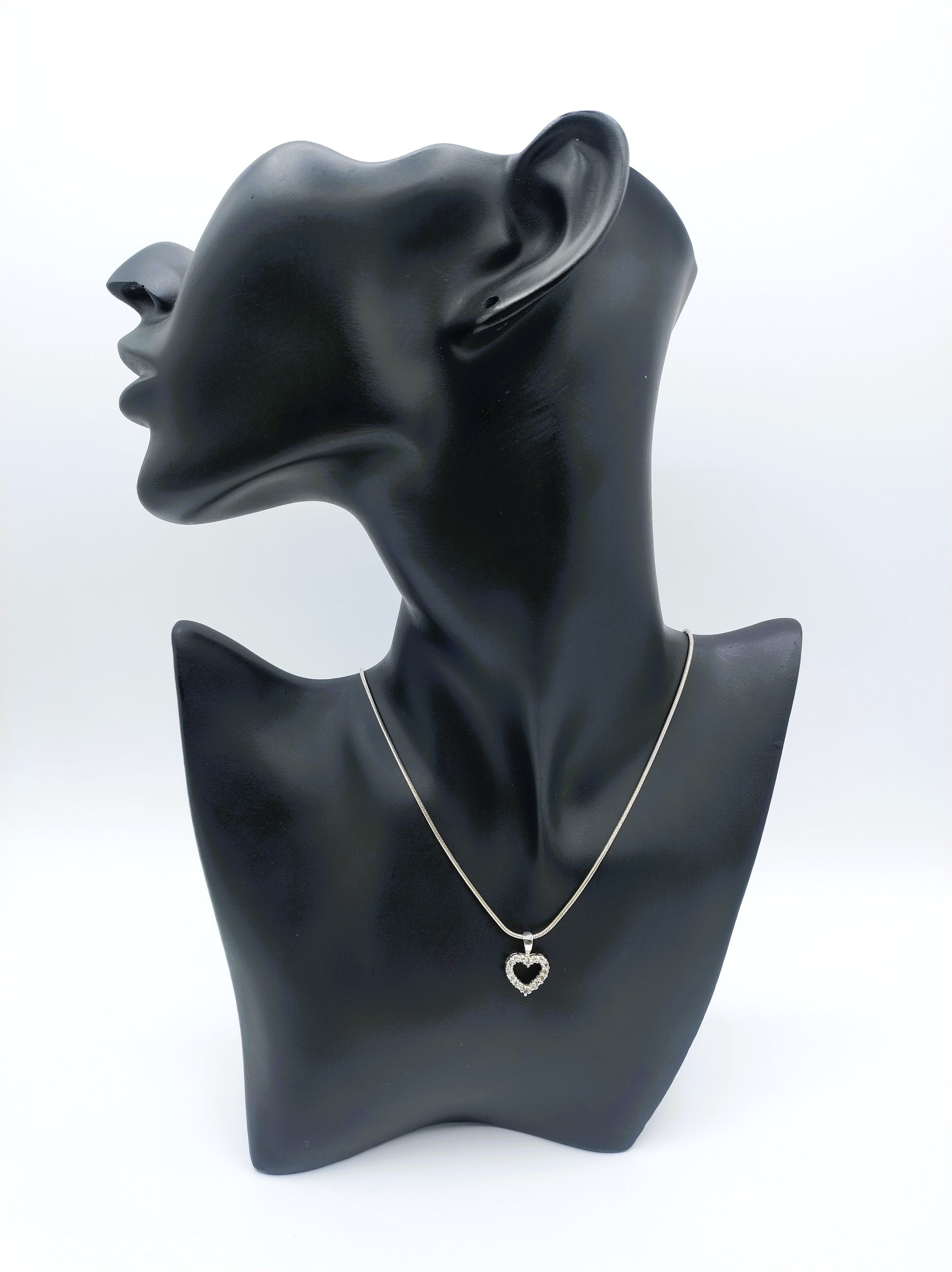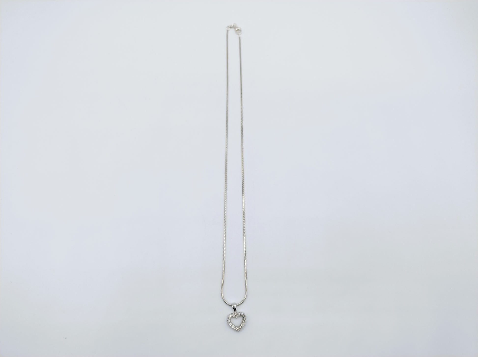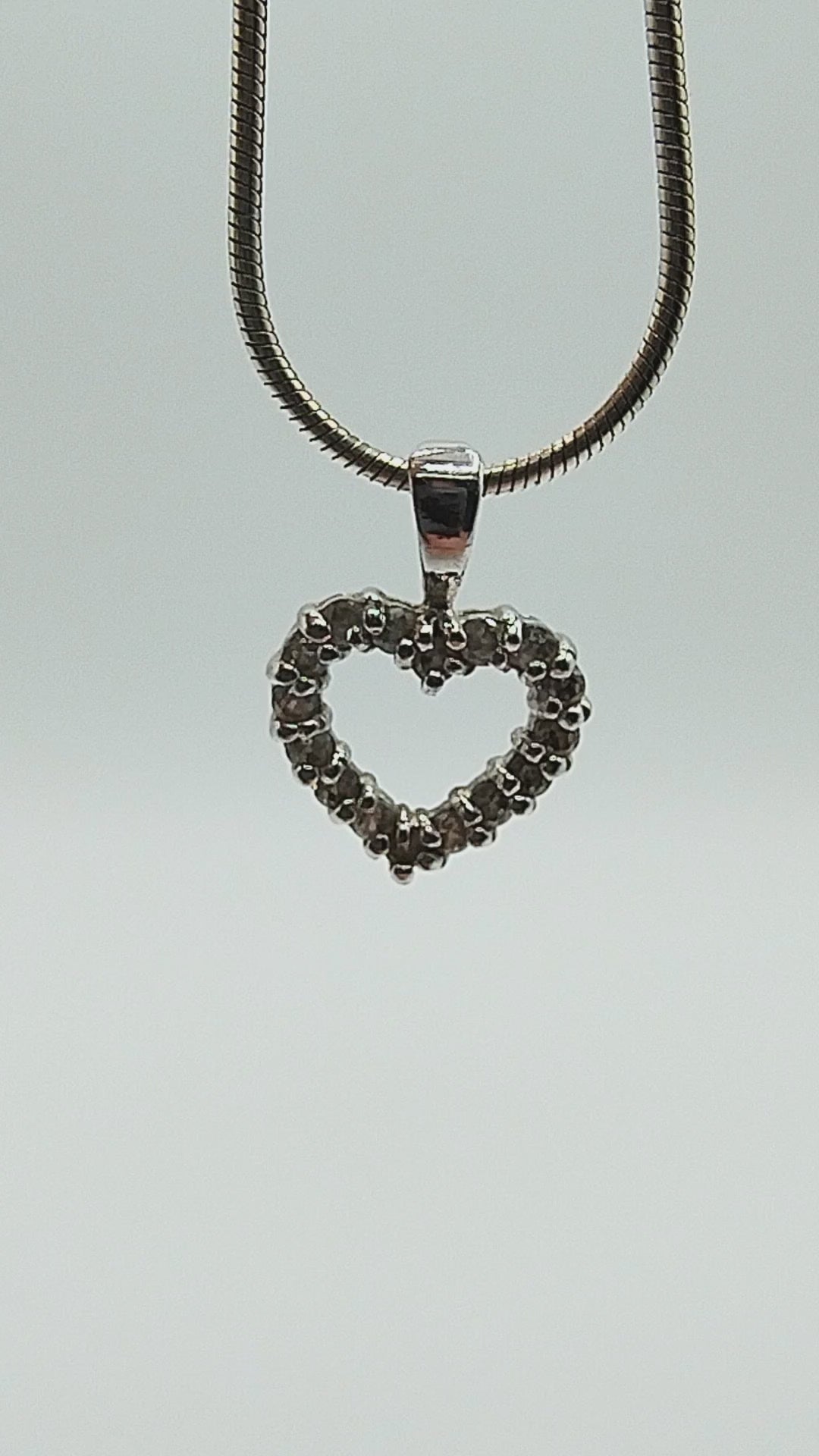 Silberne Schlangenkette mit einem Durchmesser von ca. 1 mm mit einem silbernen Anhänger in Form eines mit Zirkonia besetzten Herzens.