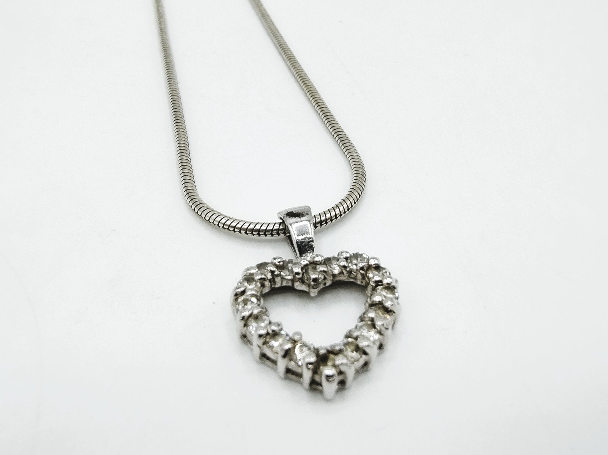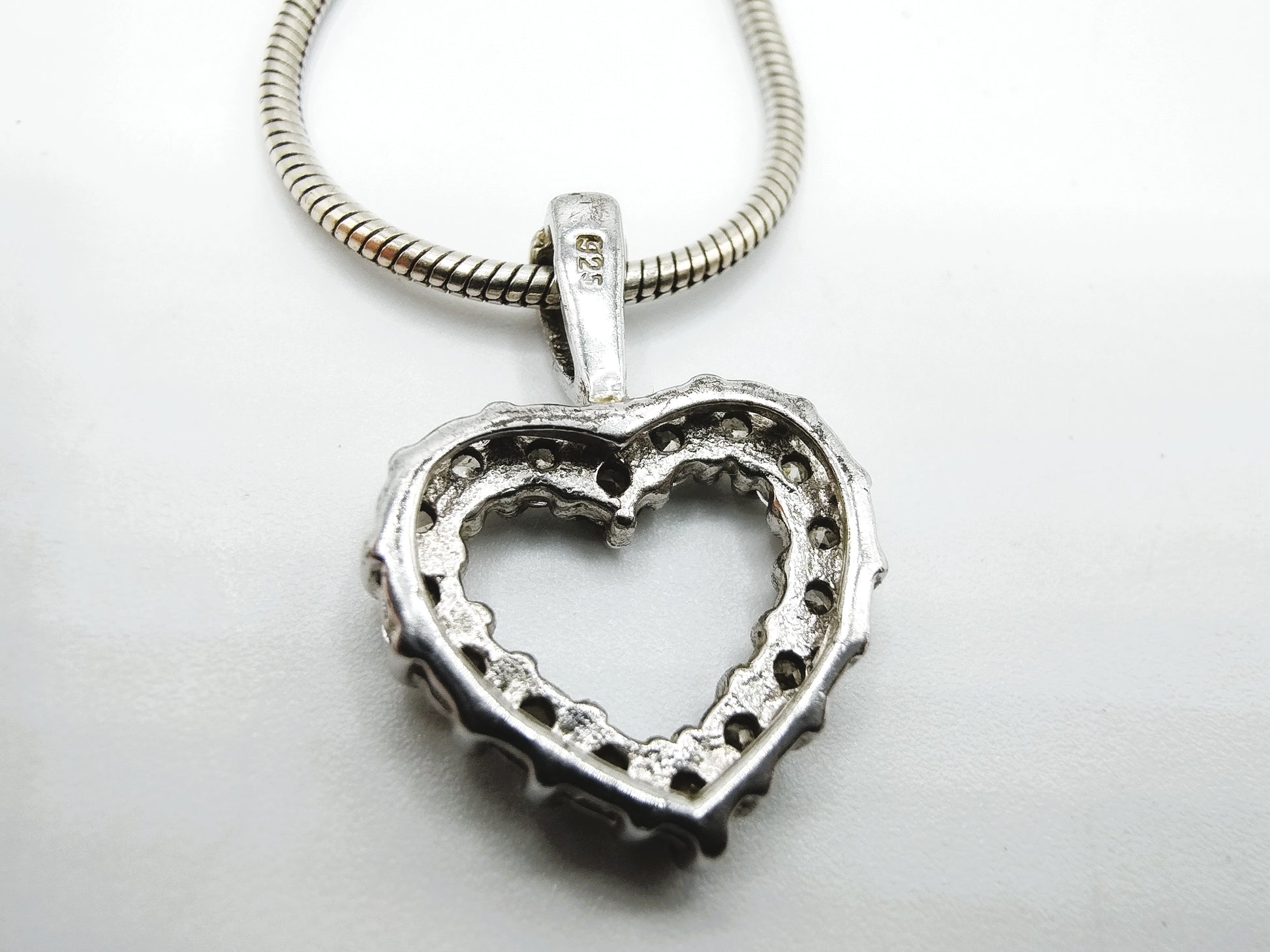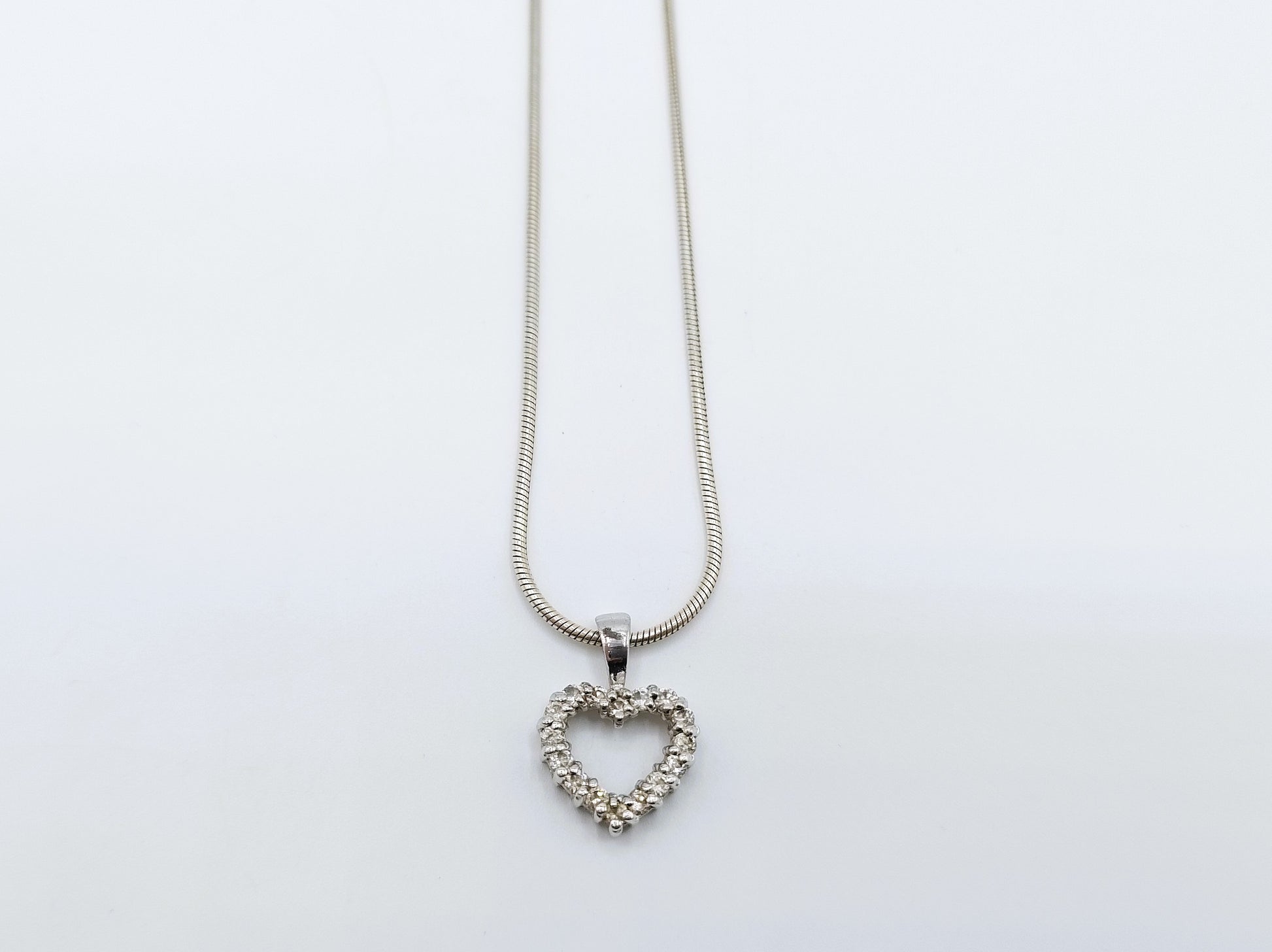 Silberne Schlangenkette mit einem Durchmesser von ca. 1 mm mit einem silbernen Anhänger in Form eines mit Zirkonia besetzten Herzens.