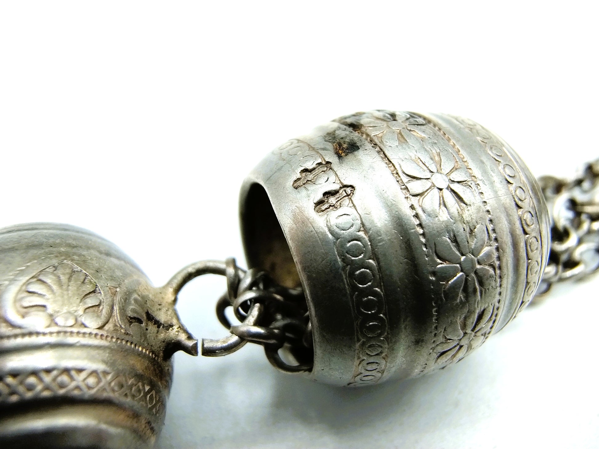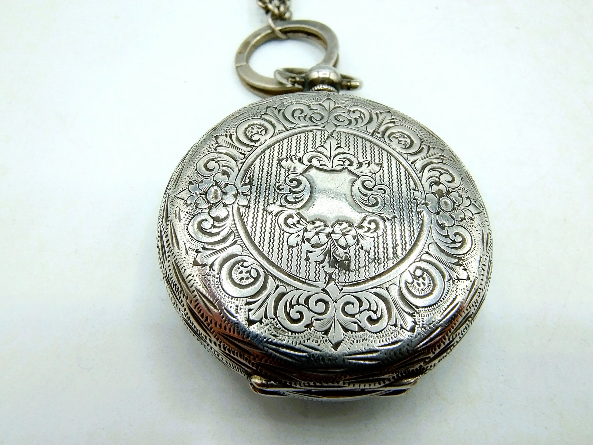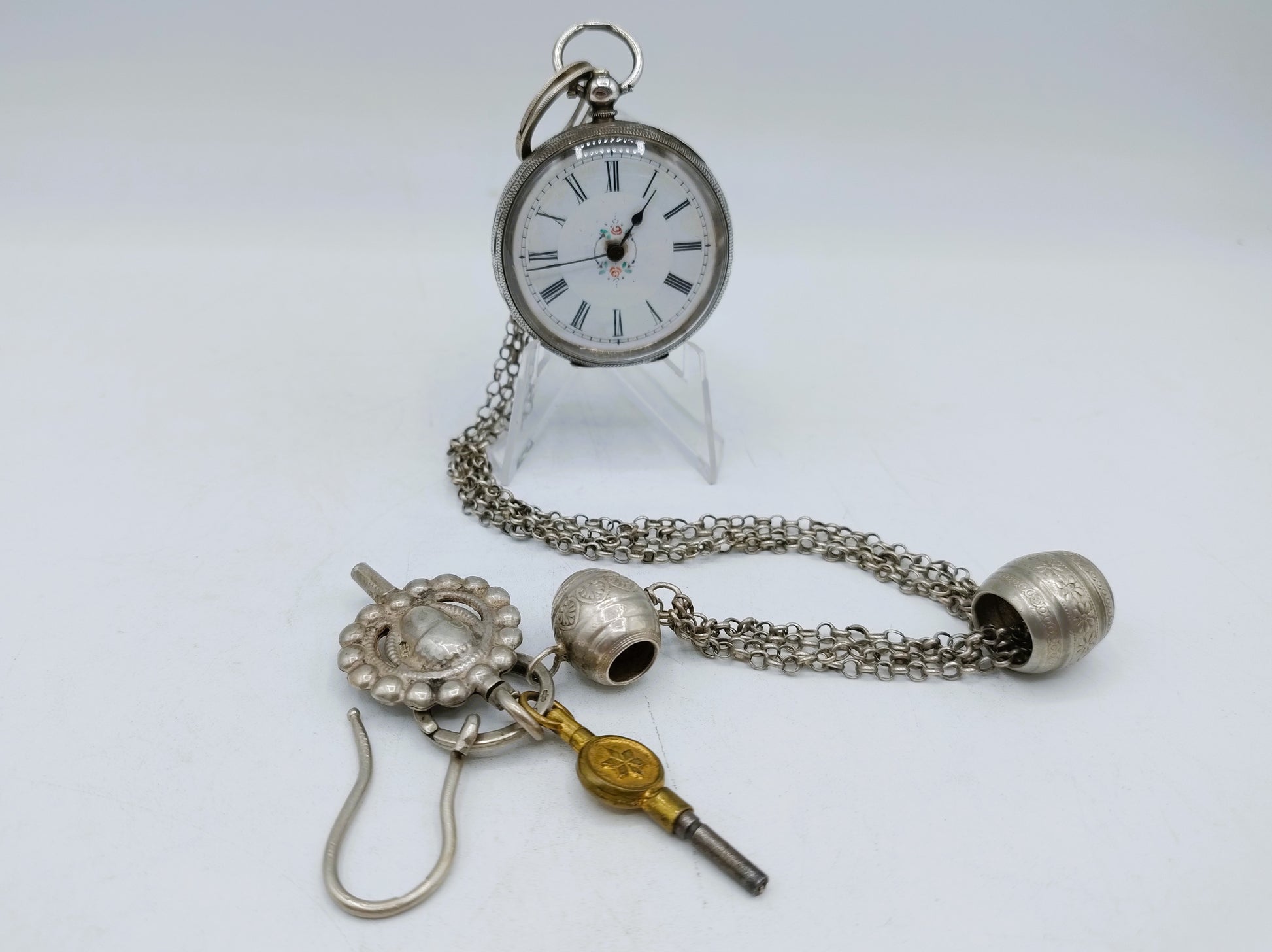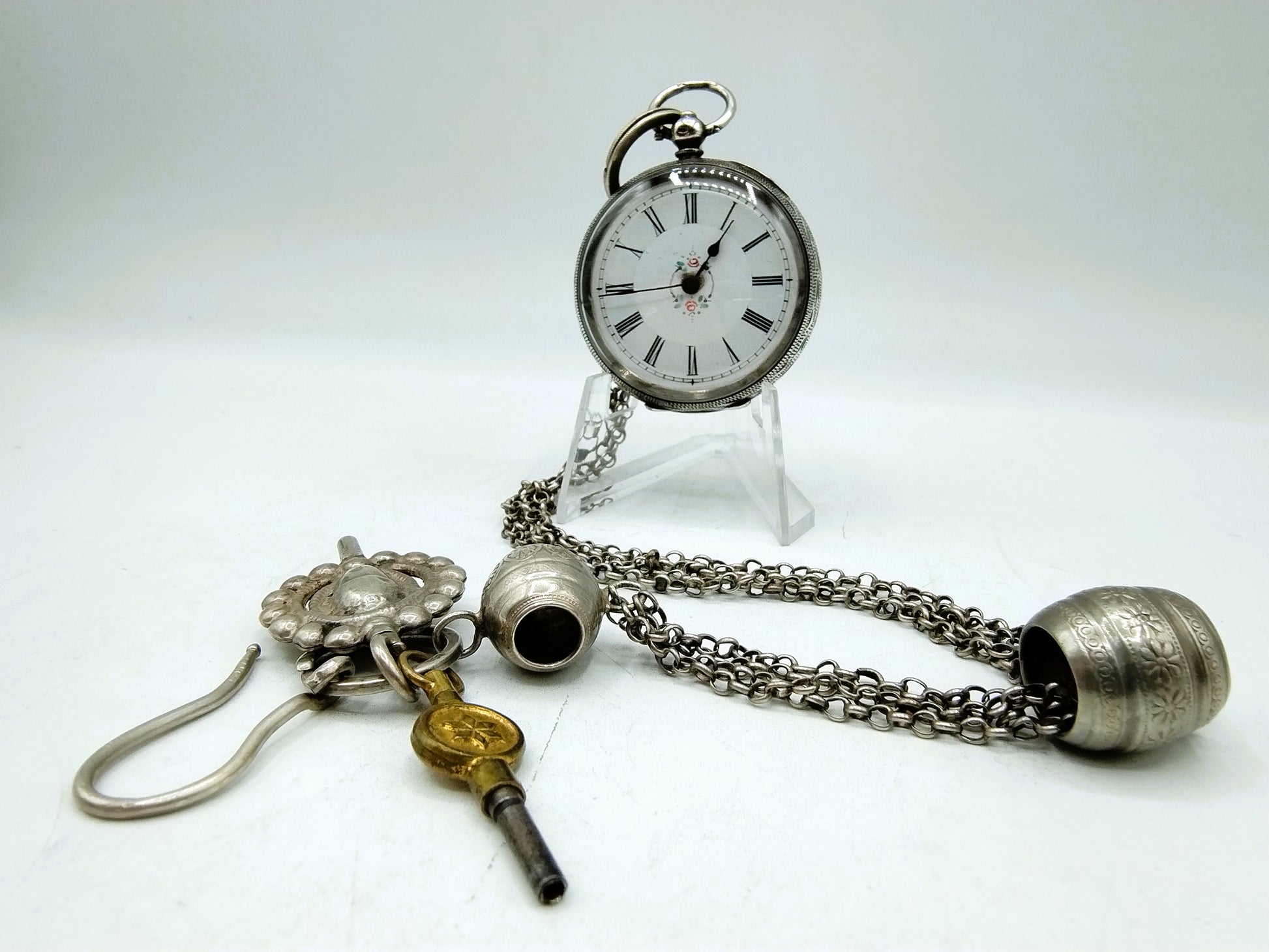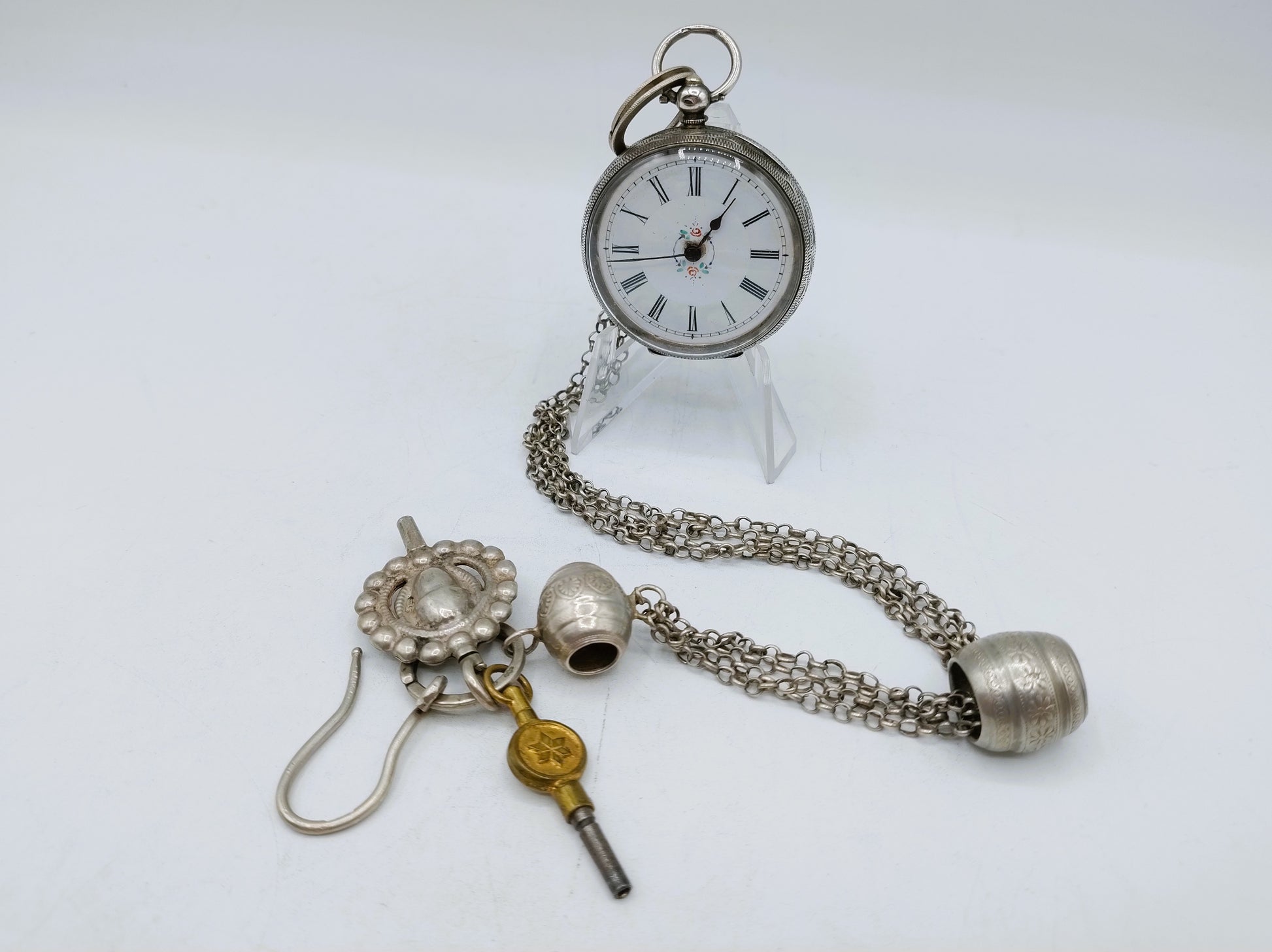 Silberne Taschenuhr an silberner Uhrenkette mit Schlüsseln, 19. Jahrhundert.