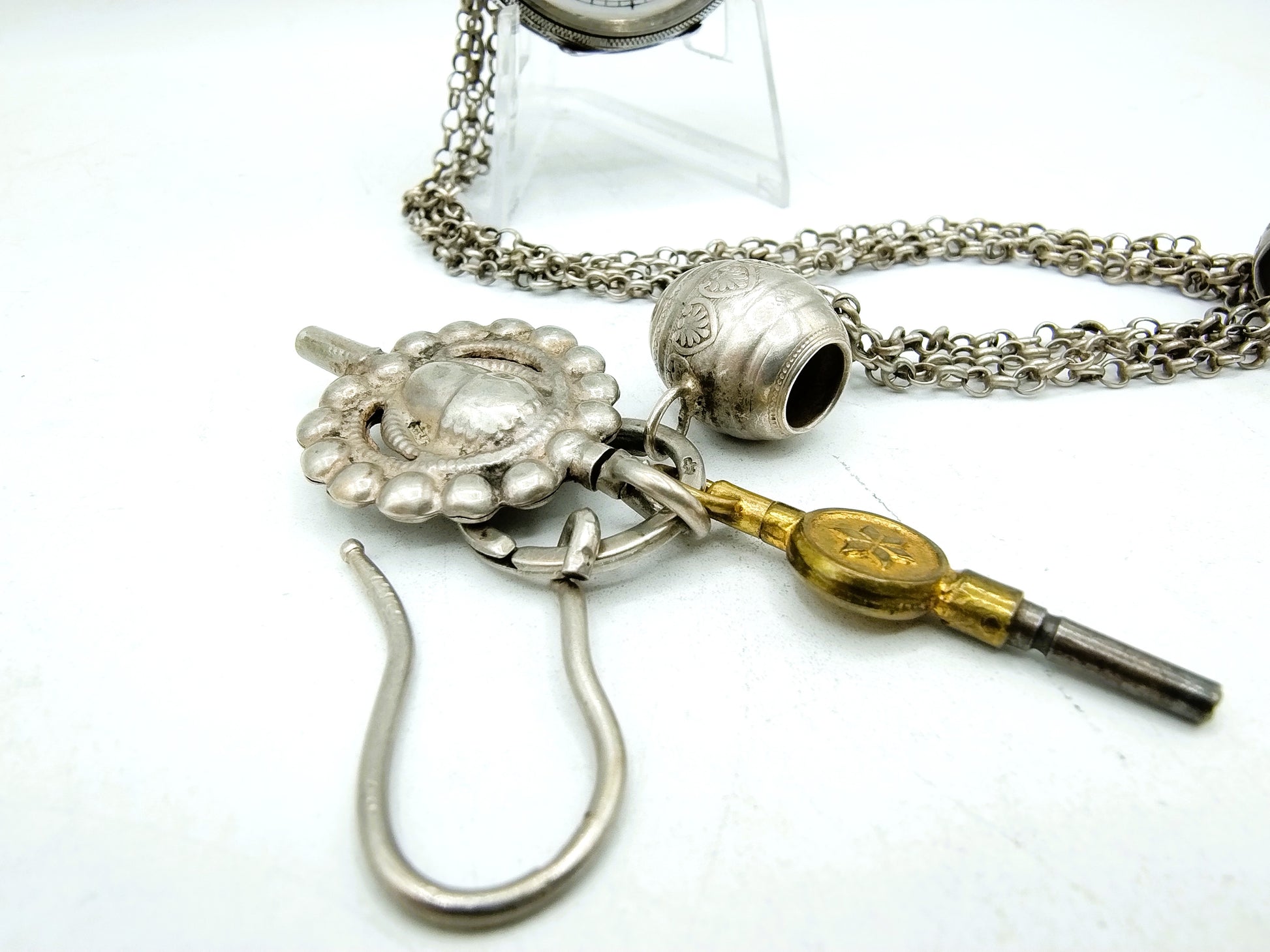 Silberne Taschenuhr mit einer 4-strängigen Jasseronkette mit zwei Uhrenschlüsseln und einem Westenhaken.