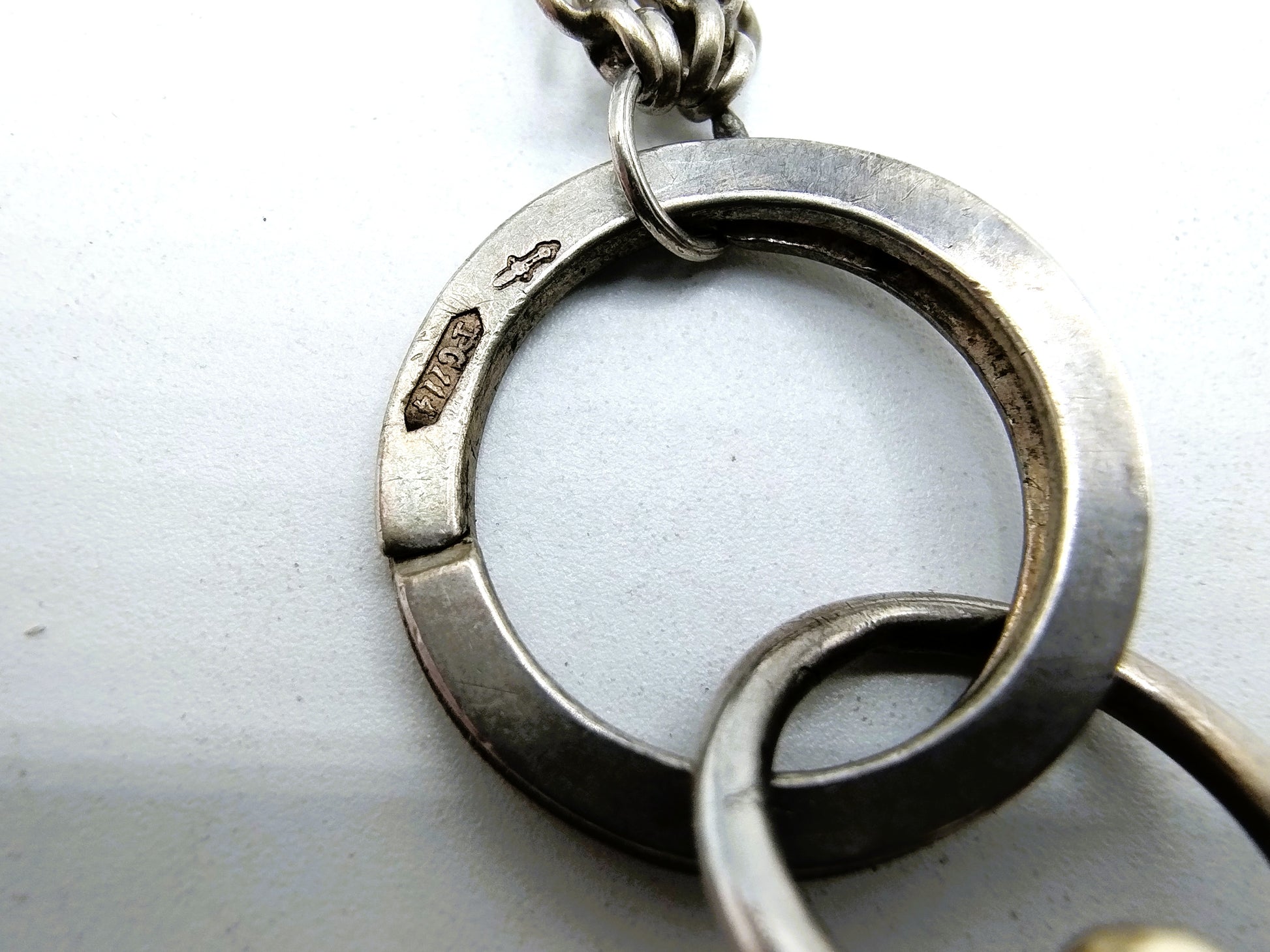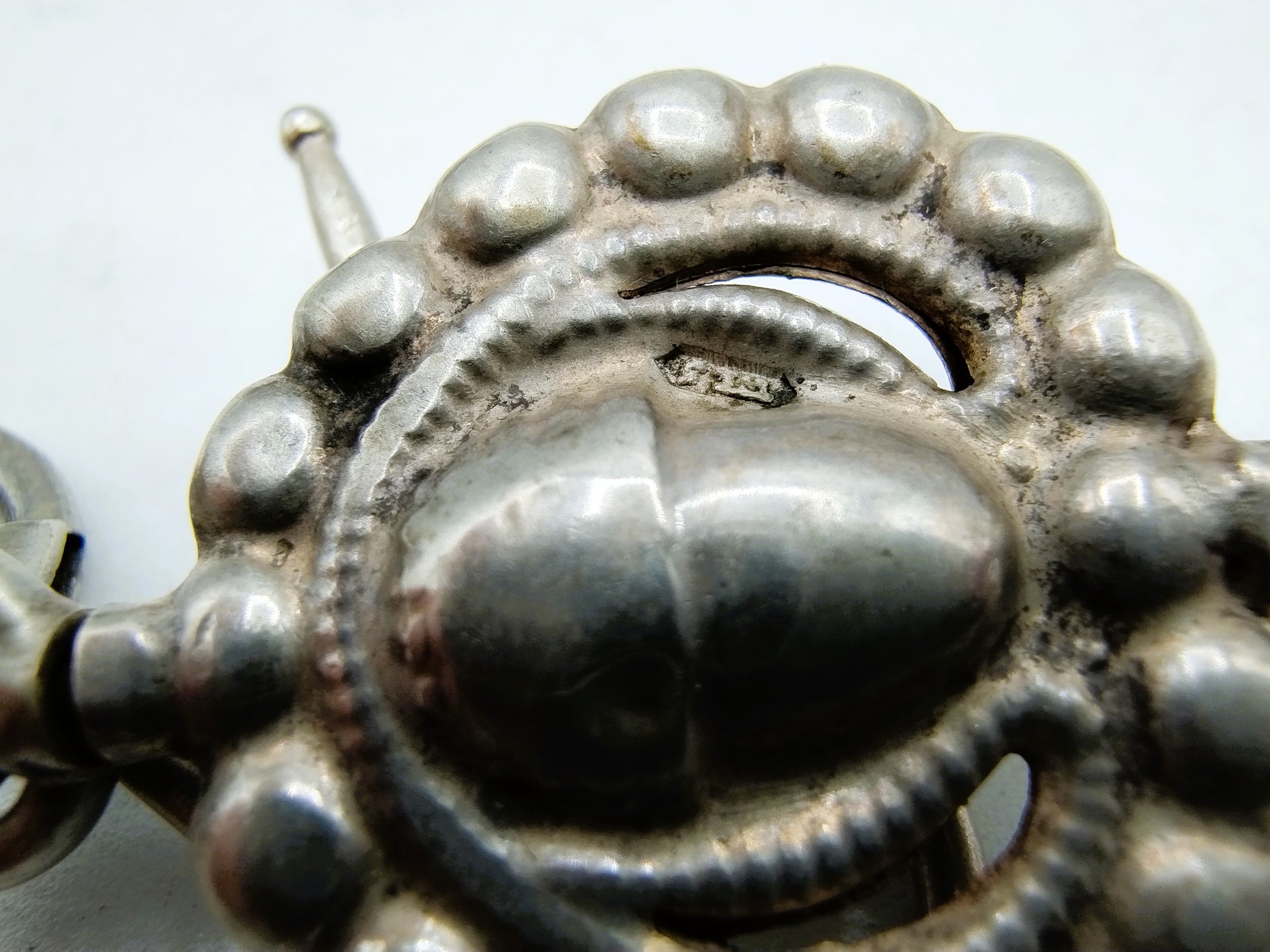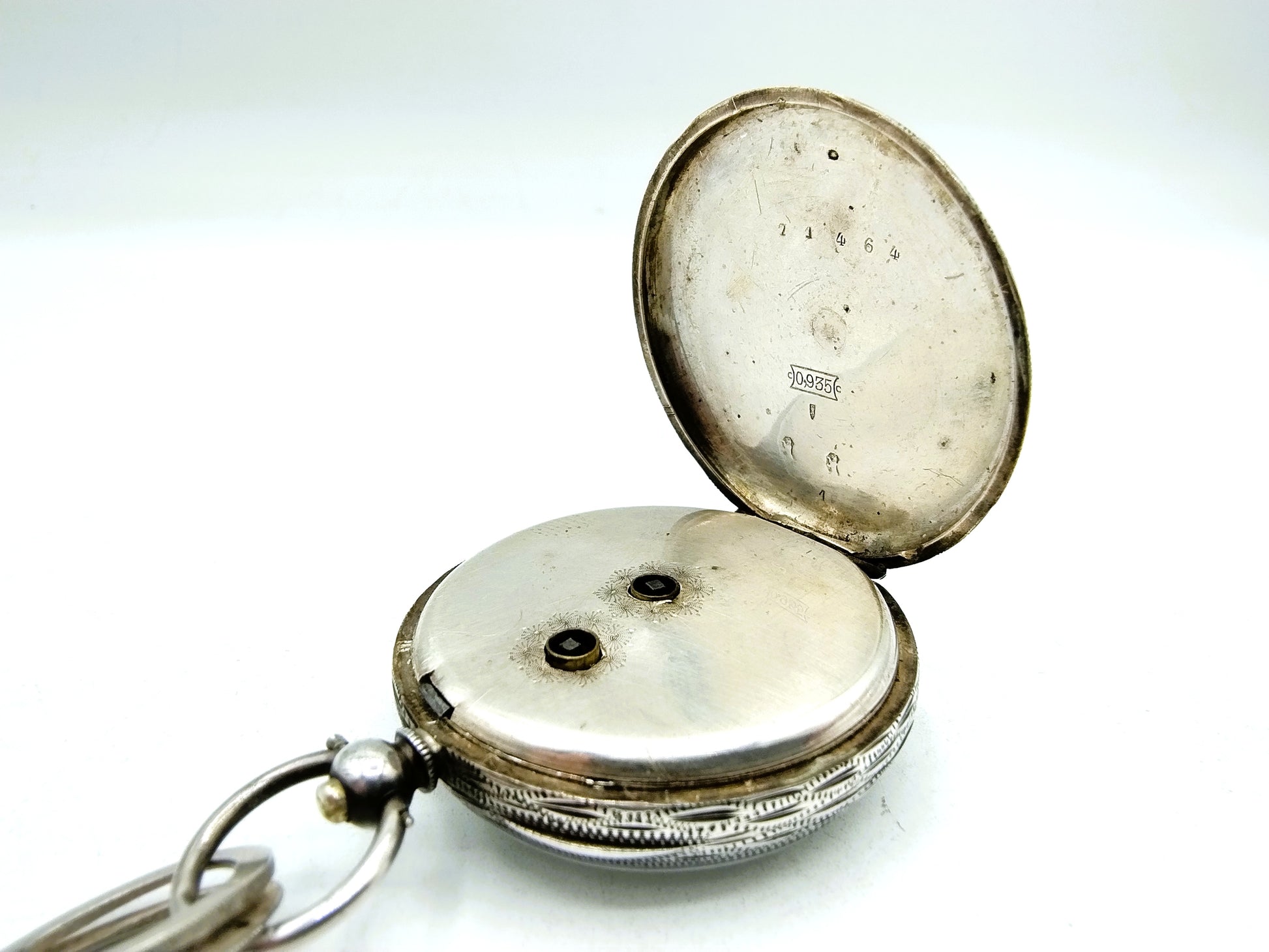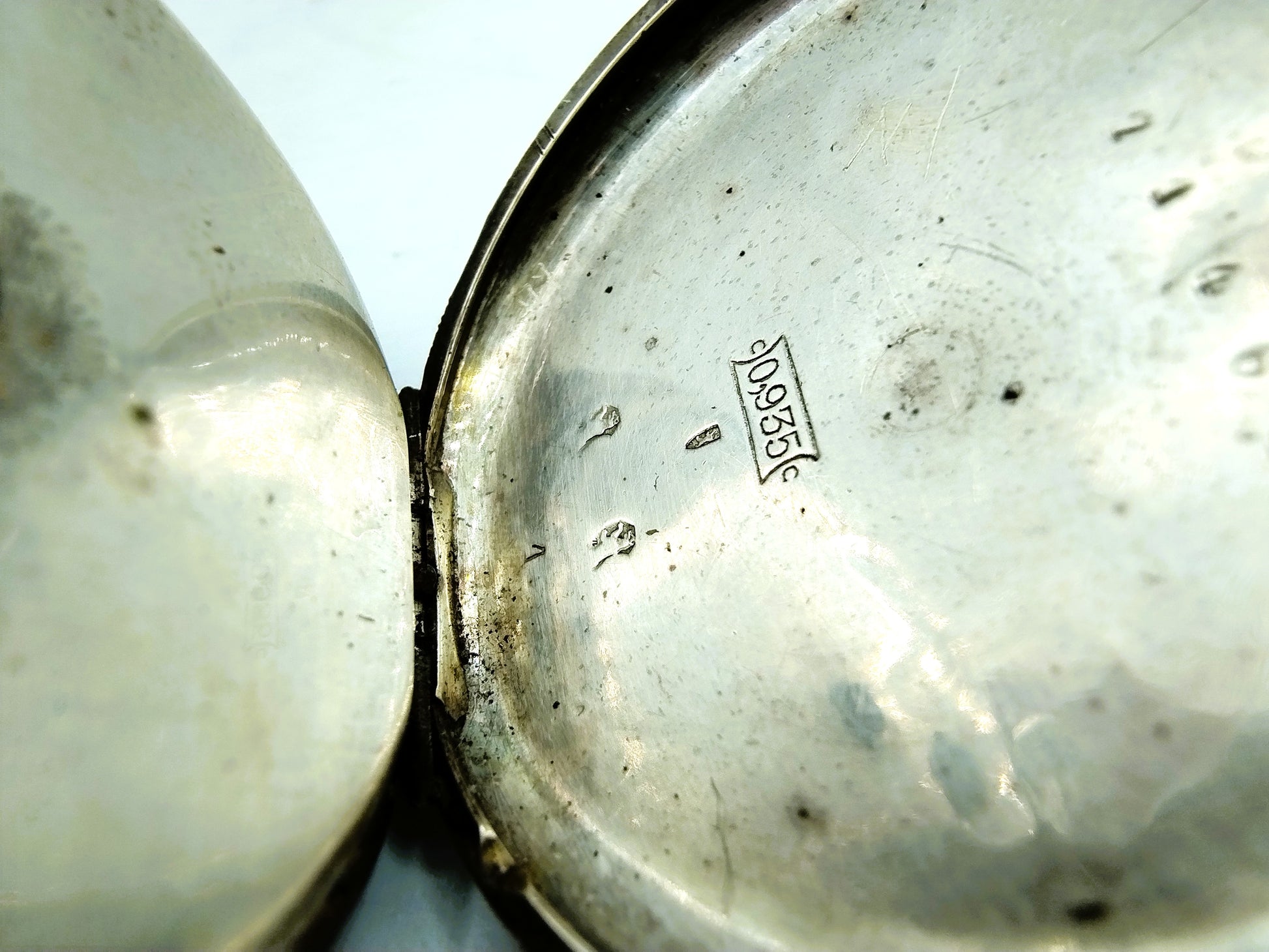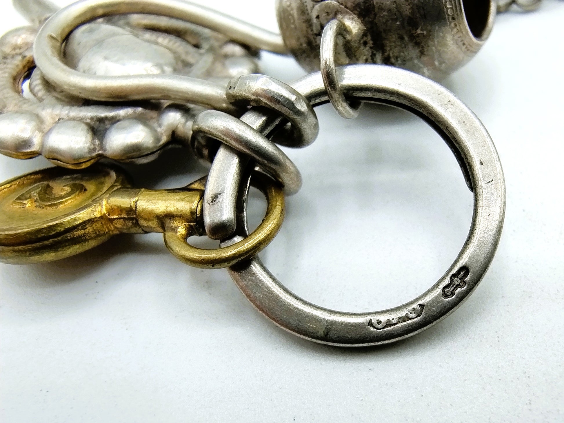 Das Ganze hat verschiedene Silberpunzen. Die Uhr ist mit 935 gepunzt, die Ringe sind mit PC114 für PR Cabboes aus Leeuwarden, aktiv von 1836 bis 1859, gepunzt, der Silberschlüssel ist mit WI5 für W. Innes aus Amsterdam gepunzt. Tätig von 1827 bis 1828. Alle Teile sind mit dem Schwert und einer oder mehreren Silberpunzen punziert.