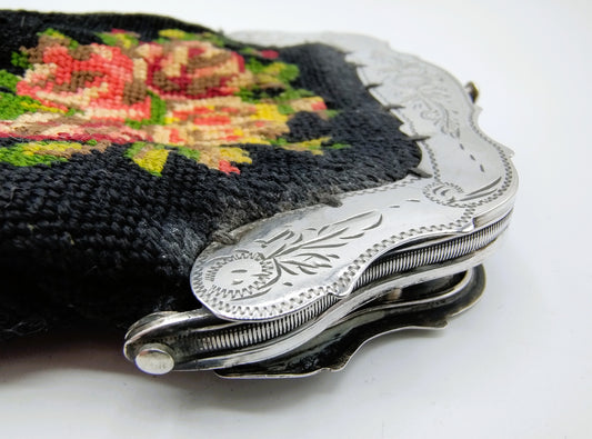 Silver purse clasp with beaded bag, 1840