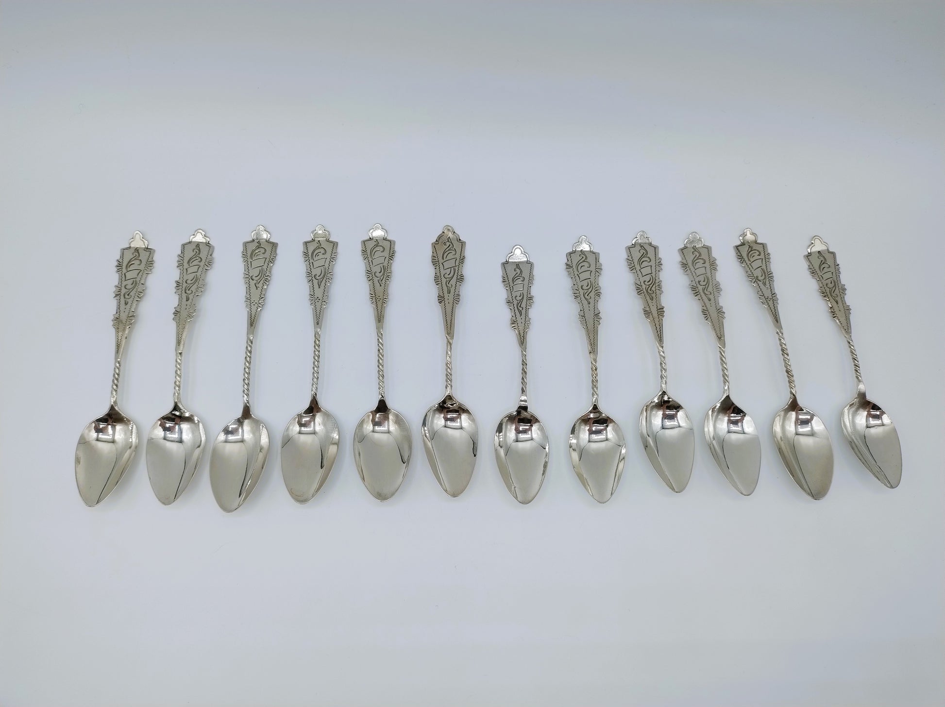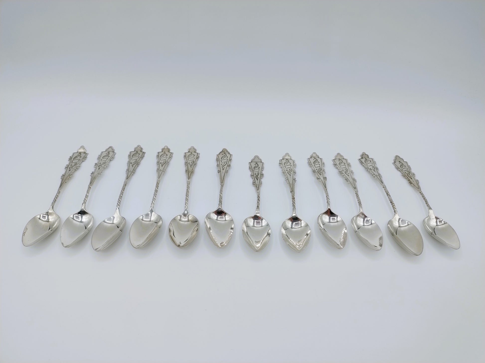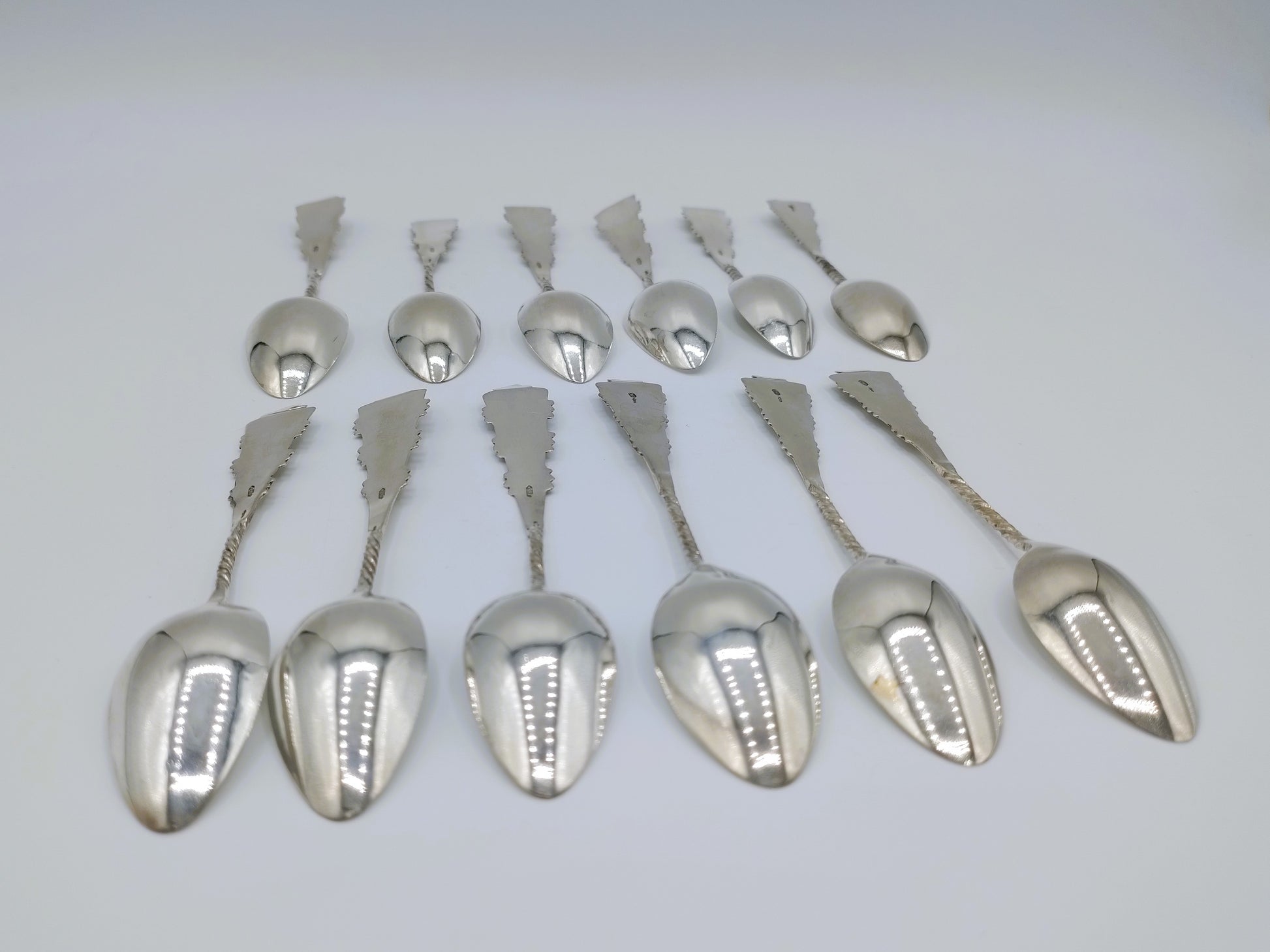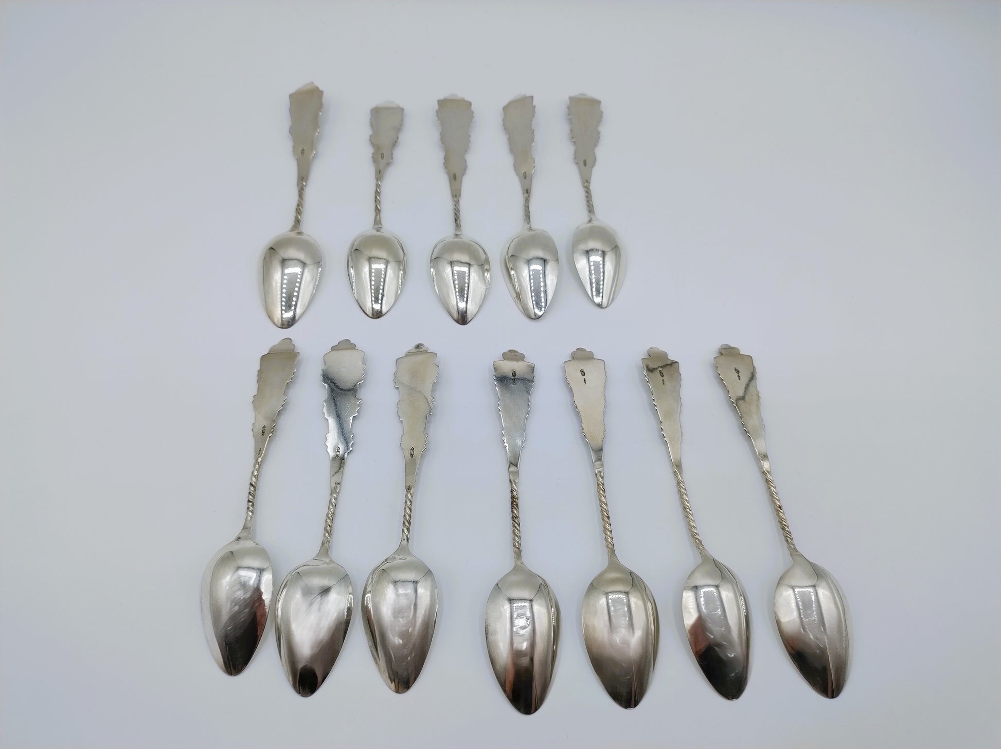 Set of 12 silver teaspoons made by the silversmith G. Huisman from Amsterdam, active from 1884 and fa. G. vd Berg & Zn from Schoonhoven, active from 1922 to 1945.